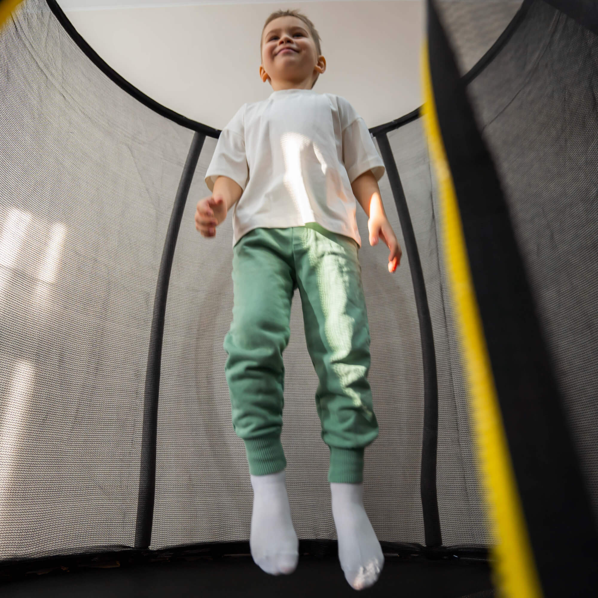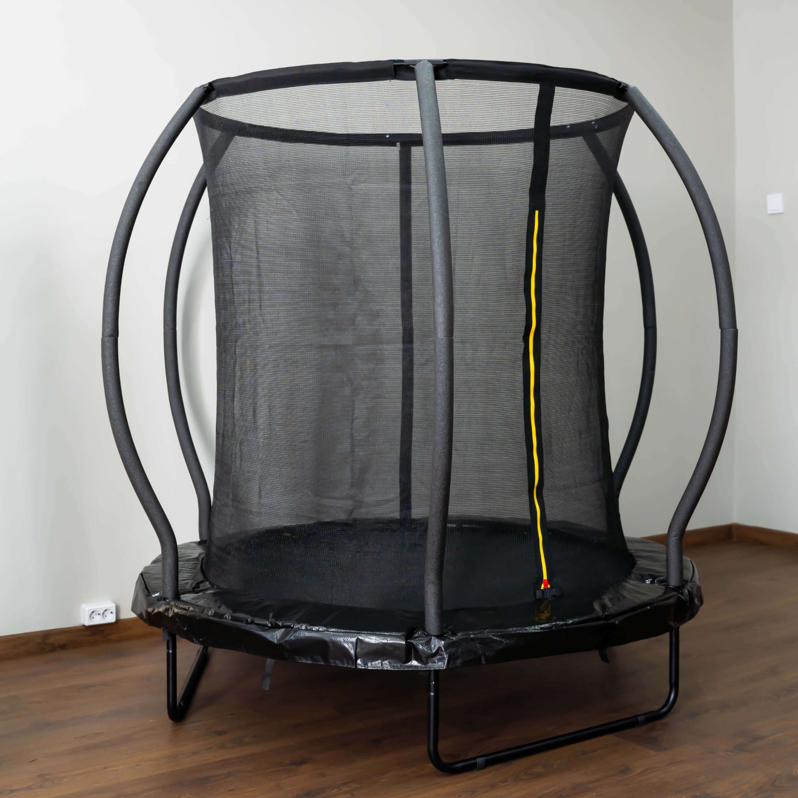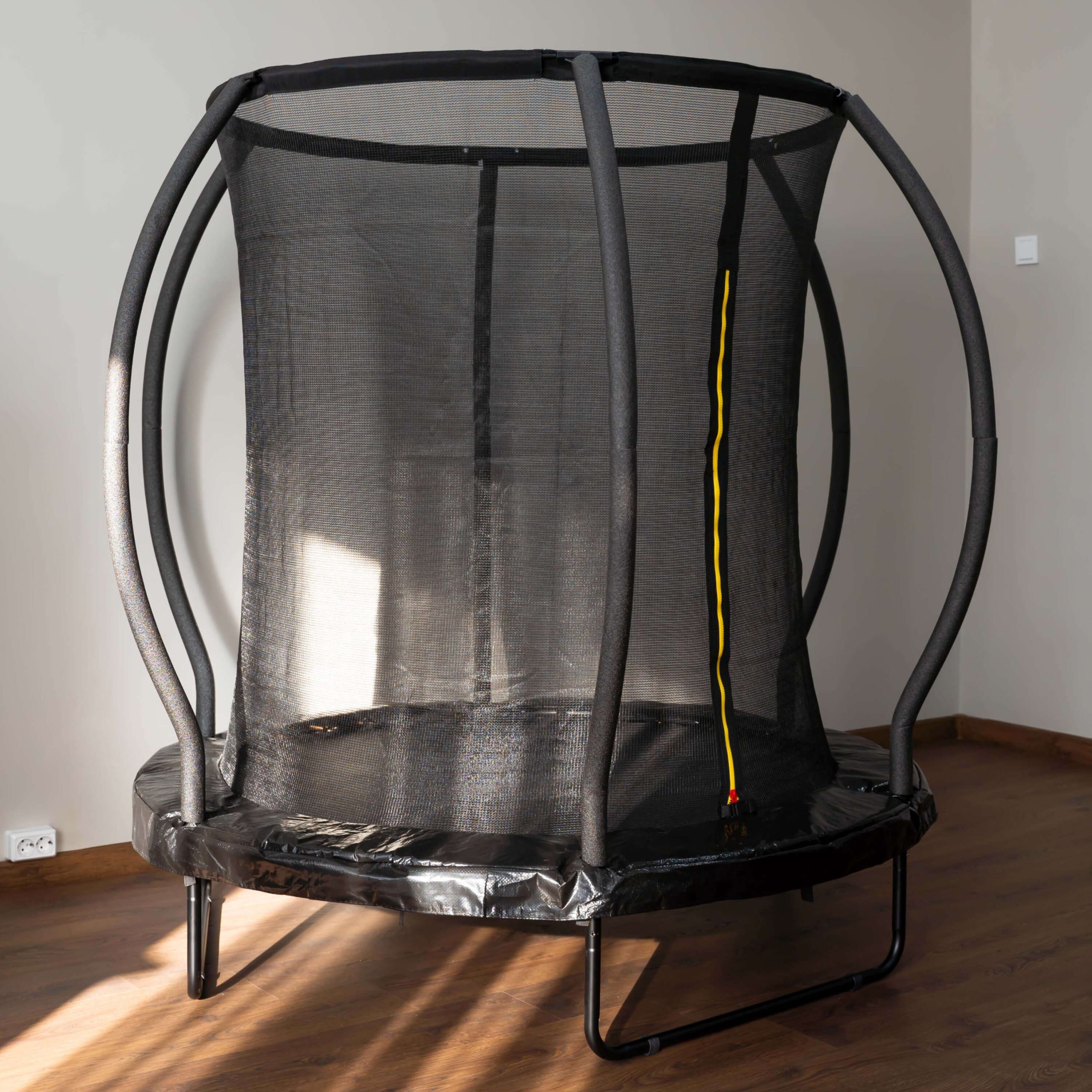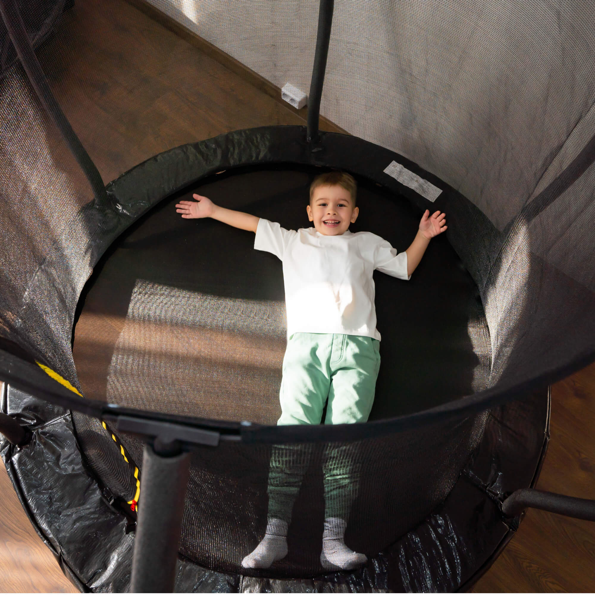 Прочная высокая сетка, тщательно натянутое упругое полотно, закрытые полотном пружины гарантируют максимальную безопасность детей во время джампинга, а накладки на ножки защищают пол от царапин. Качественные материалы обеспечивают долговечность и надежность конструкции, а также позволяют использовать батут не только как домашний, но и уличный.