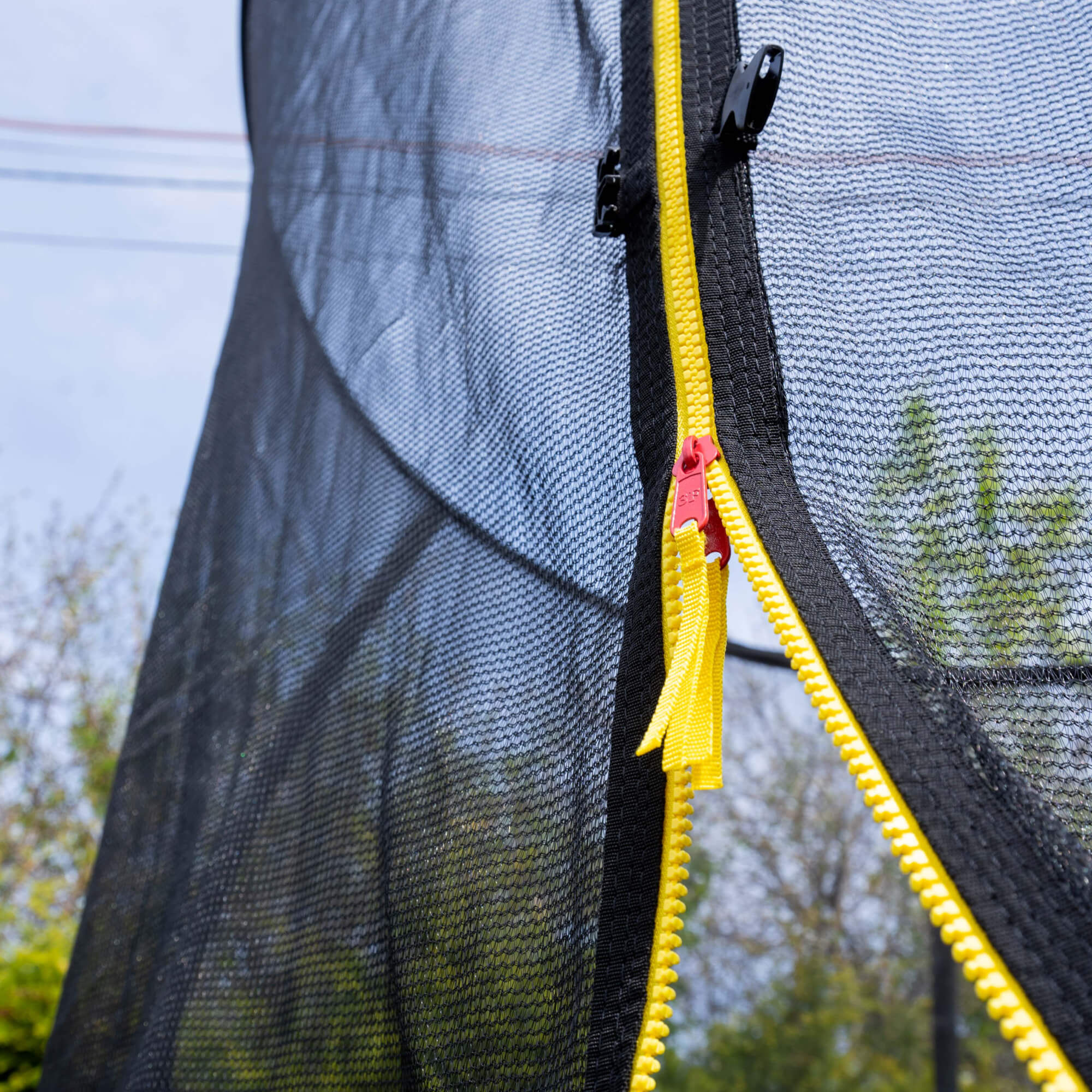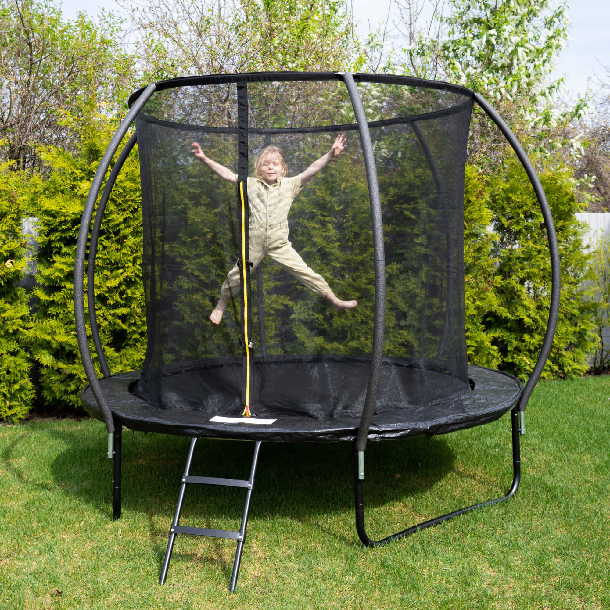 Защитная сетка обеспечивает безопасность ребенка во время прыжков, предотвращает падения. Металлические стойки каркаса покрыты мягким материалом и расположены на расстоянии от прыжкового полотна. Попасть внутрь можно с помощью двустороннего замка-молнии.