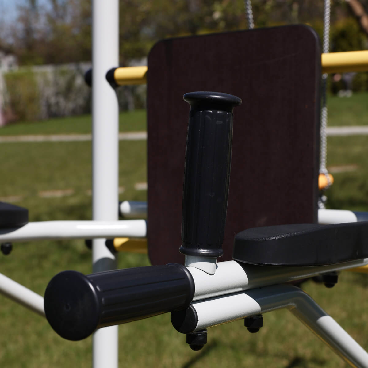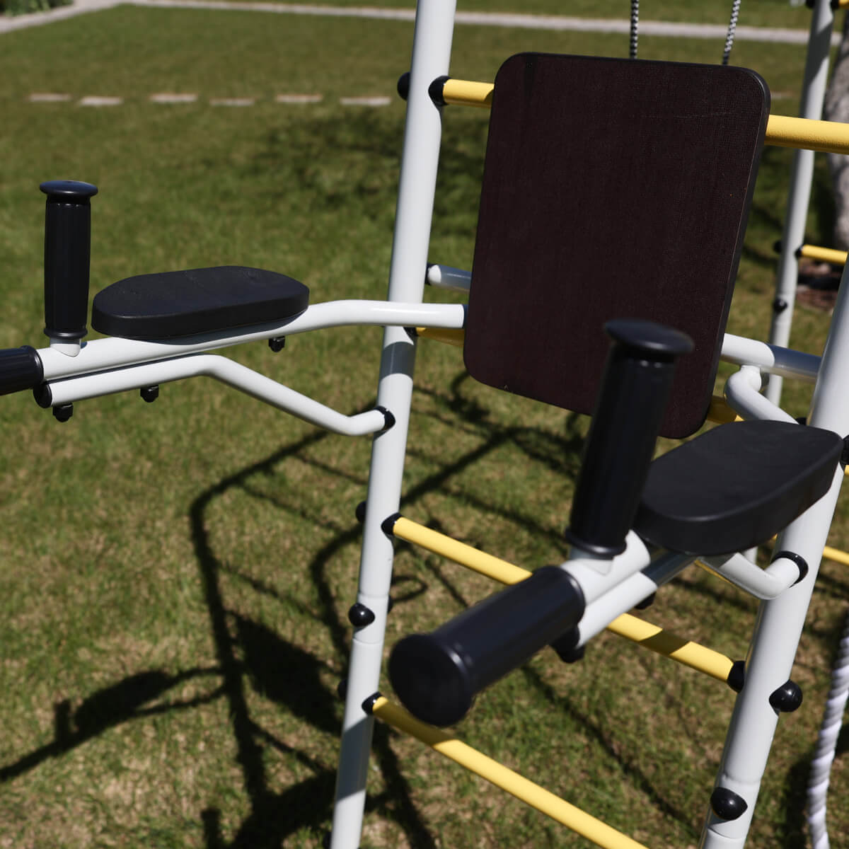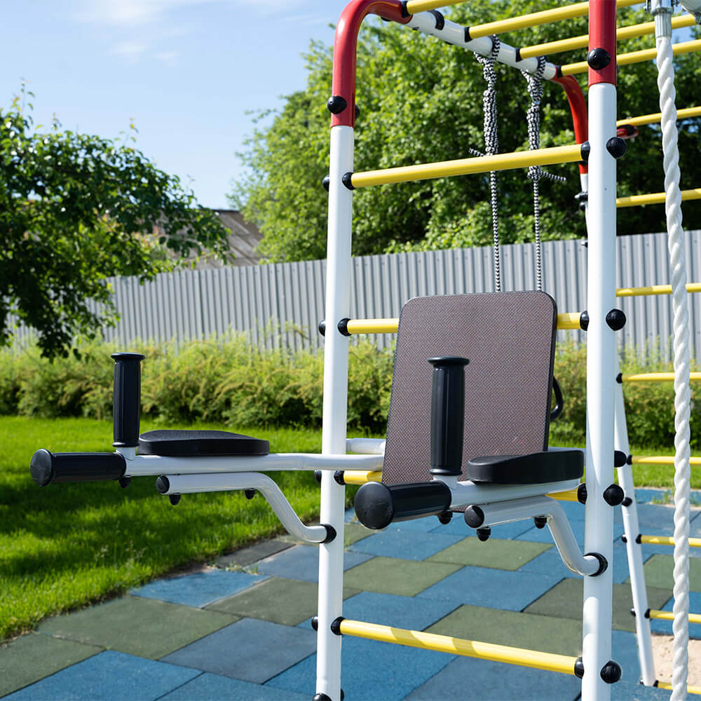 Тренажер устанавливается на ступени комплекса и фиксируется на требуемой высоте. Преимущество заключается в том, что монтаж не требует дополнительных крепежей и специальных навыков. Простая, но надежная система фиксации достигается за счет опоры брусьев на стойки лестницы. При необходимости, тренажер можно переместить по высоте (перевесив брусья на другую ступень), чтобы обеспечить комфортные занятия и детям, и взрослым.