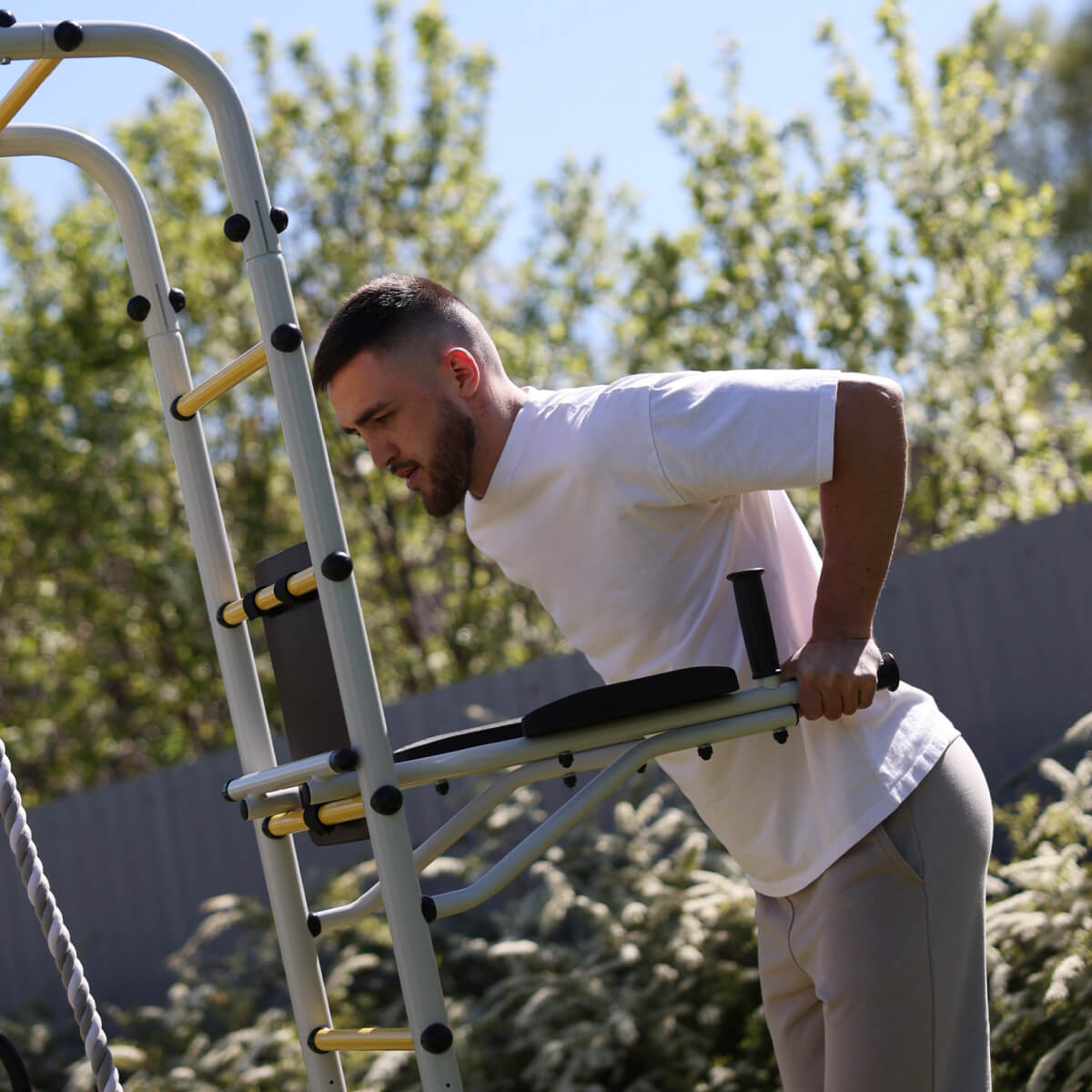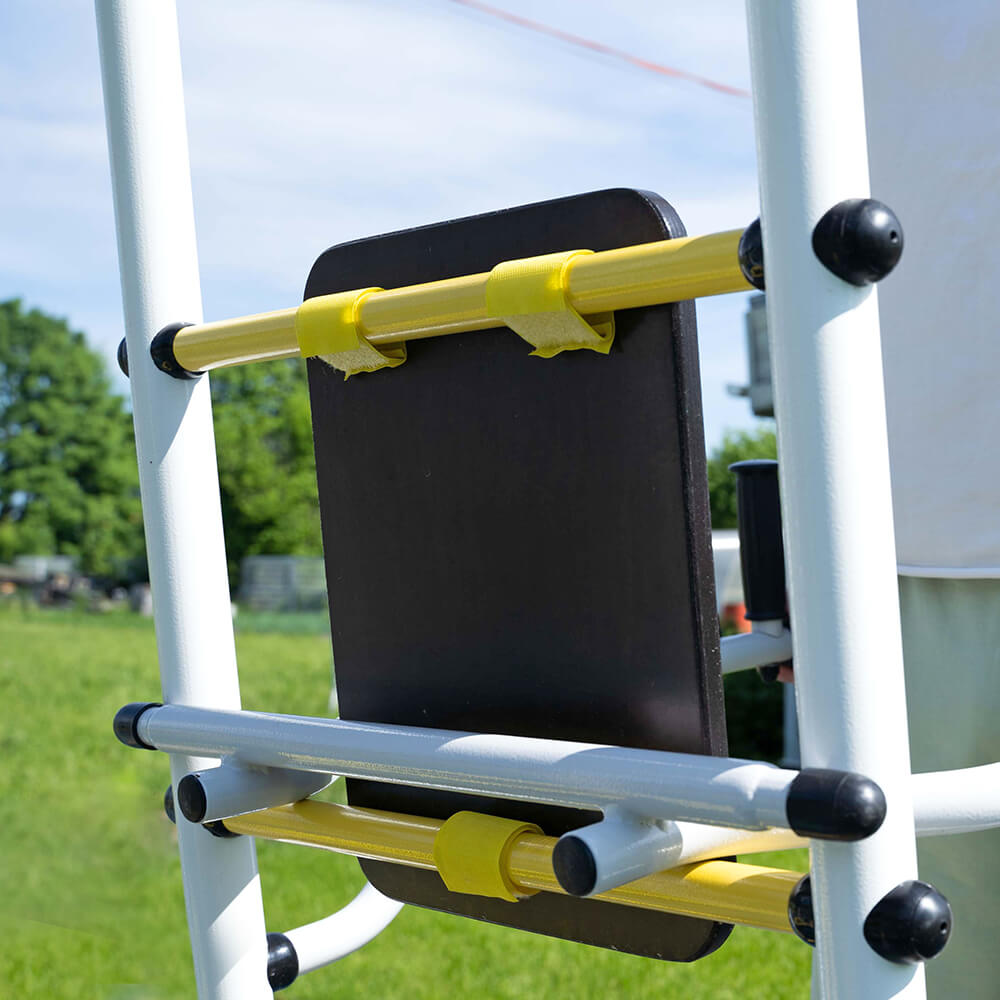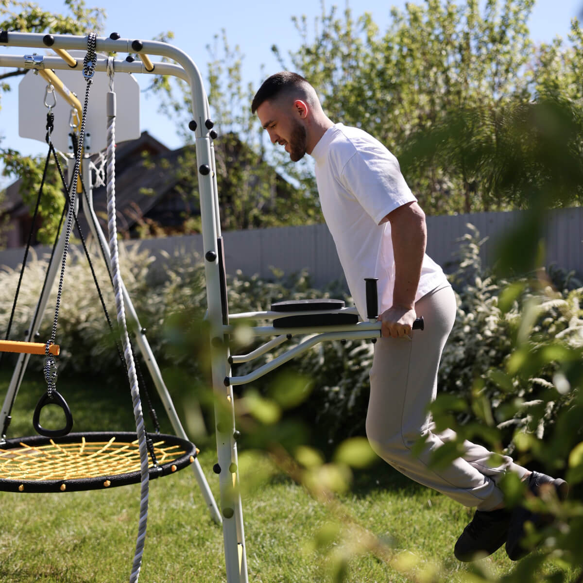 Тренажер устанавливается на ступени комплекса и фиксируется на требуемой высоте. Преимущество заключается в том, что монтаж не требует дополнительных крепежей и специальных навыков. Простая, но надежная система фиксации достигается за счет опоры брусьев на стойки лестницы. При необходимости, тренажер можно переместить по высоте (перевесив брусья на другую ступень), чтобы обеспечить комфортные занятия и детям, и взрослым.