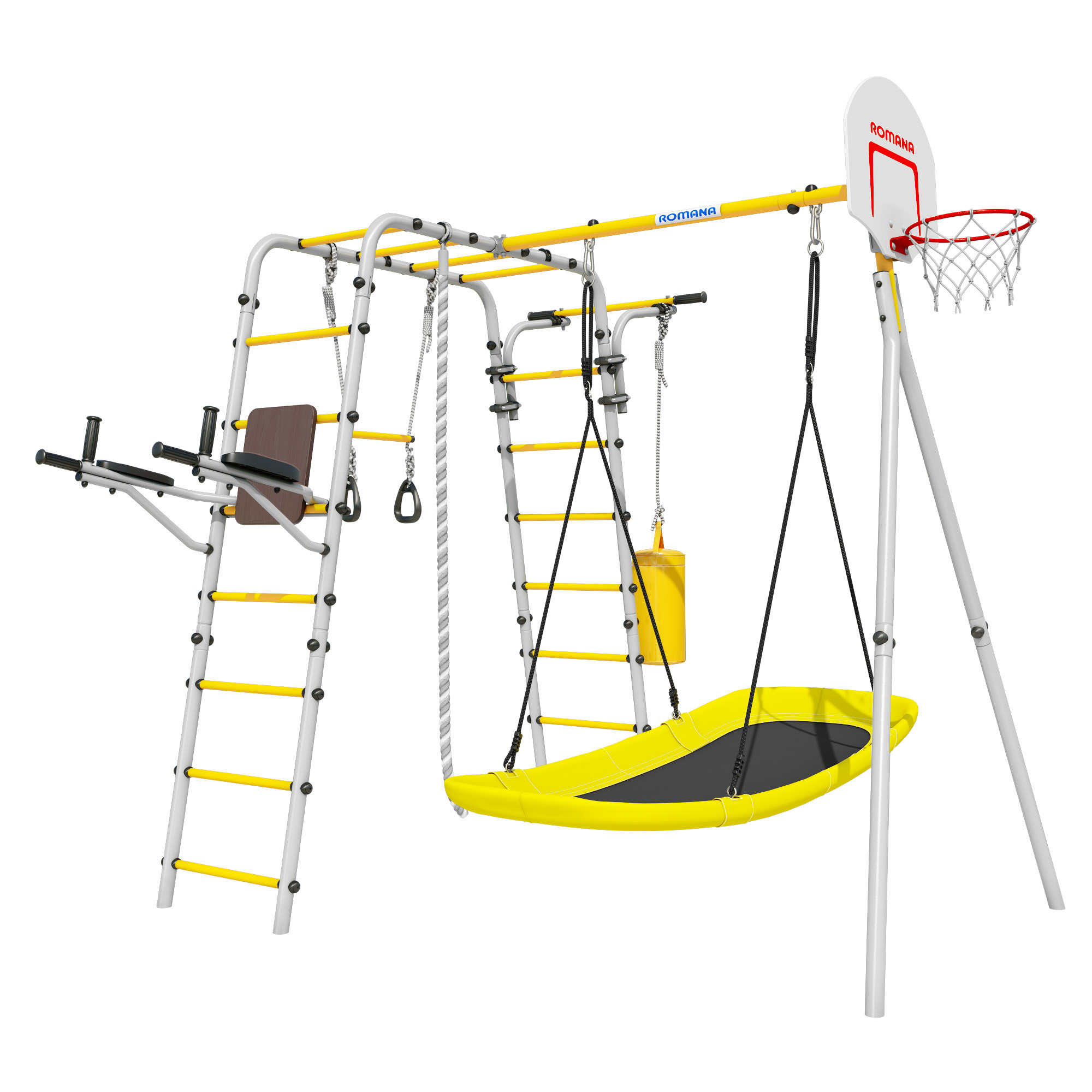 Детский спортивный комплекс для дачи ROMANA Фитнес (желтый/серый) (с качелями-гнездо «Лодка»)