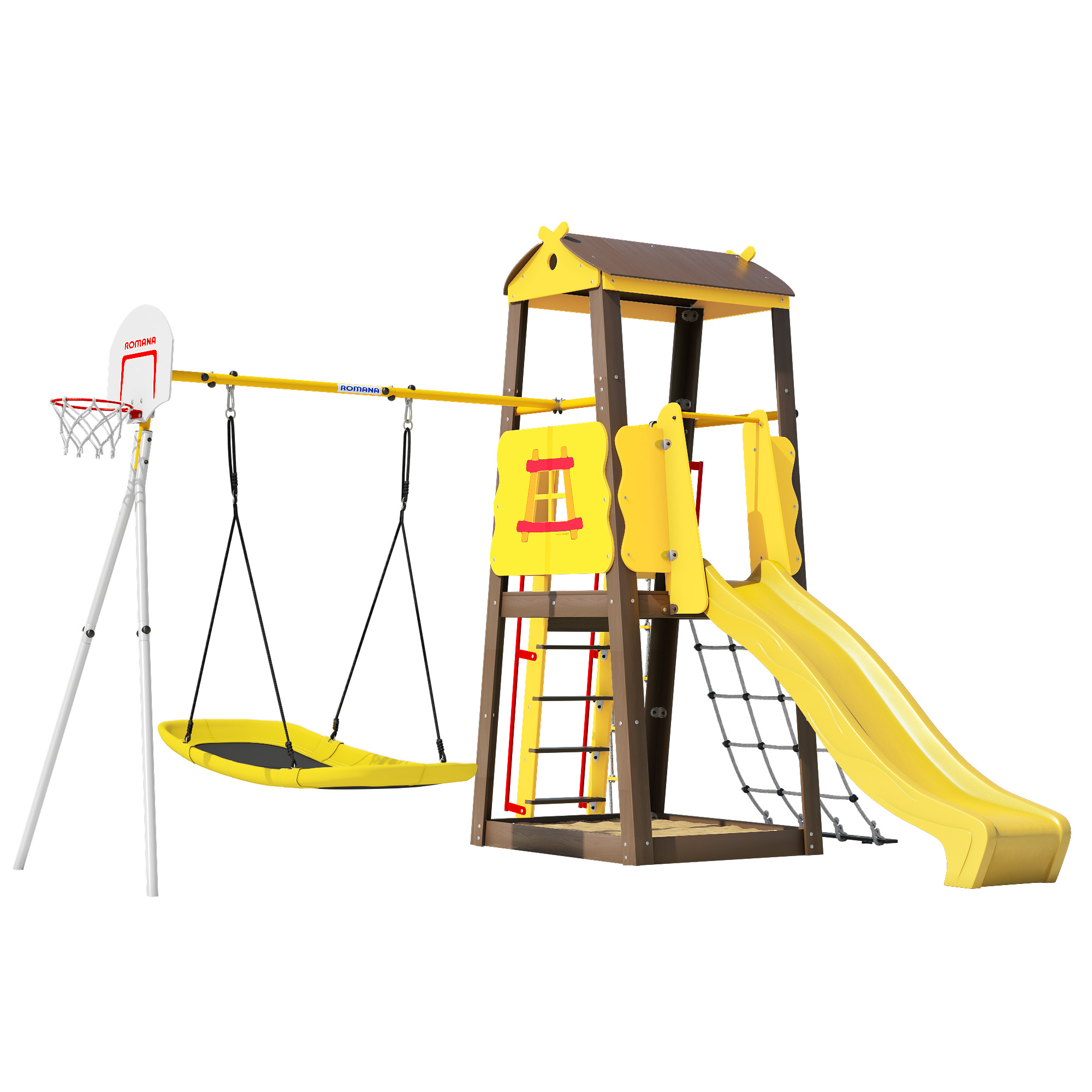ROMANA «Избушка» — это море веселья, забав и активных игр. В комплекте есть песочница и пластиковая горка, баскетбольный щит, а также двое качелей — дети могут не спорить за право покататься первым. Помимо этого, здесь есть канатный лаз из шнура повышенной прочности. Навесное оборудование атмосферостойкое — в природных условиях оно прослужит гораздо дольше. Если вы хотите веселого и запоминающегося лета на природе — ROMANA «Избушка» приведет в восторг маленьких любителей приключений!