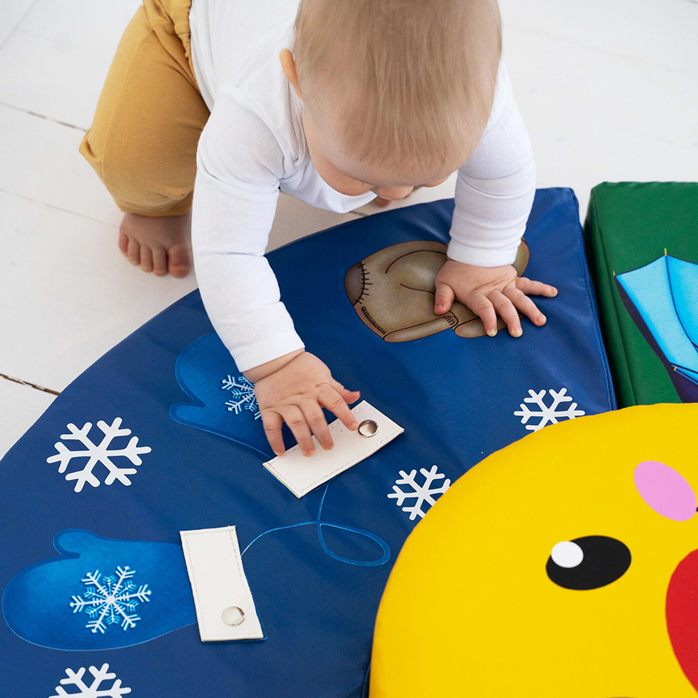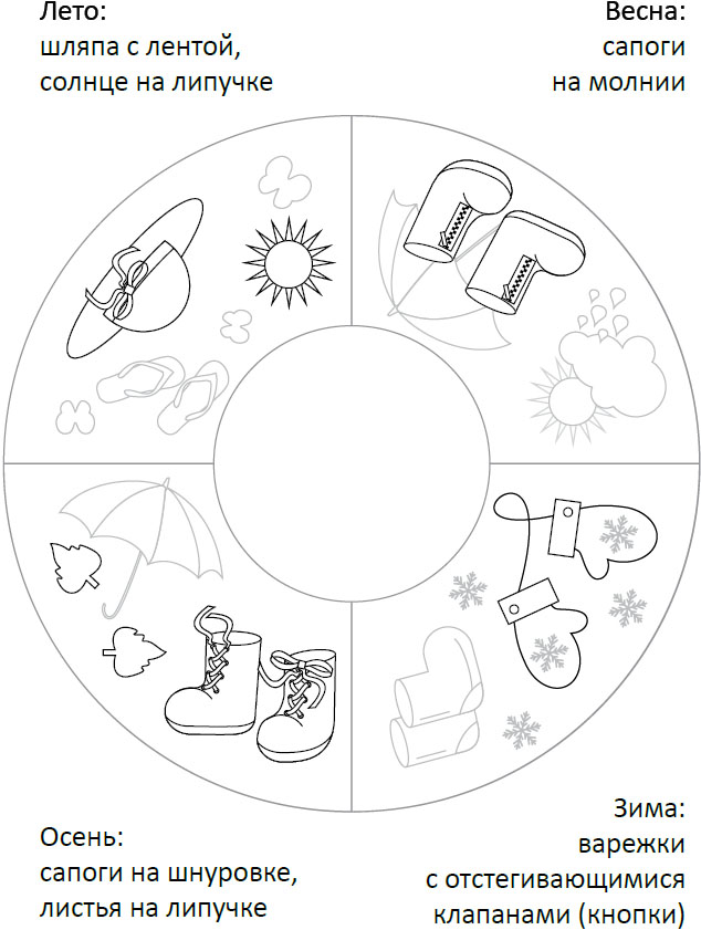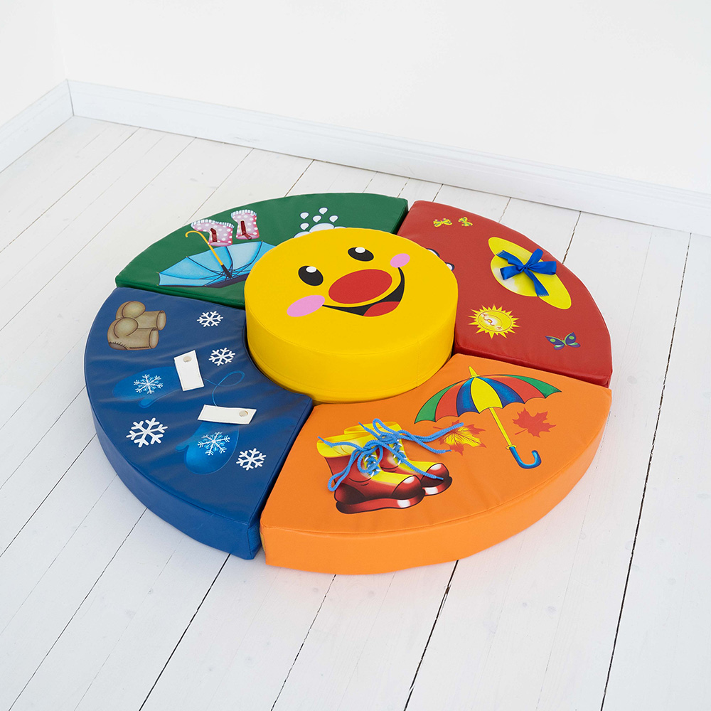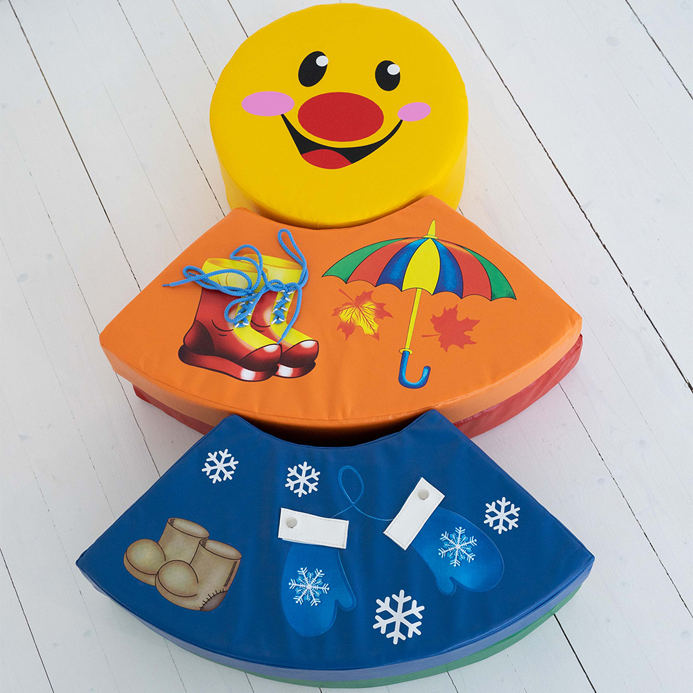 Дидактический модуль «Времена года» представляет собой пуфик и 4 элемента. На каждом элементе изображены части одежды, соответствующие сезону, и обучающая фурнитура. Габаритные размеры: 1000 х 1000 мм. Допустимая нагрузка 50 кг. Вес с упаковкой 2 кг.
