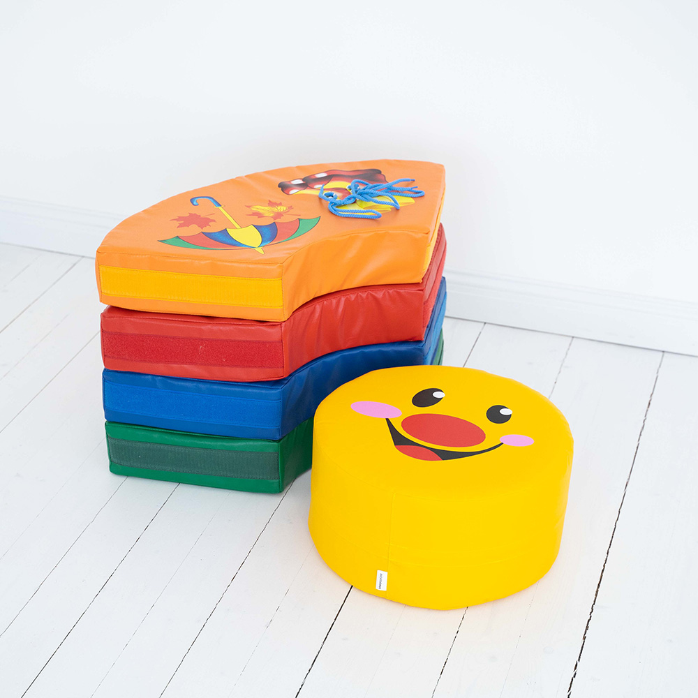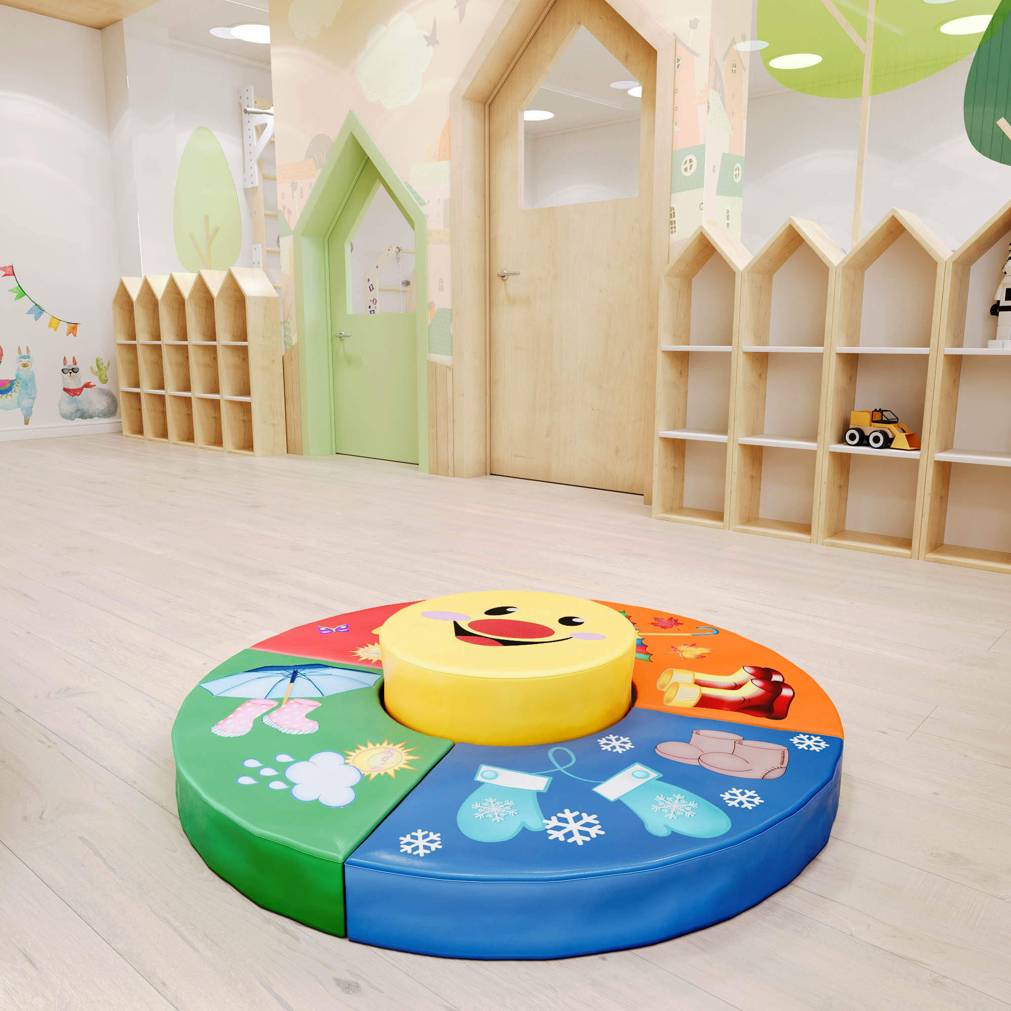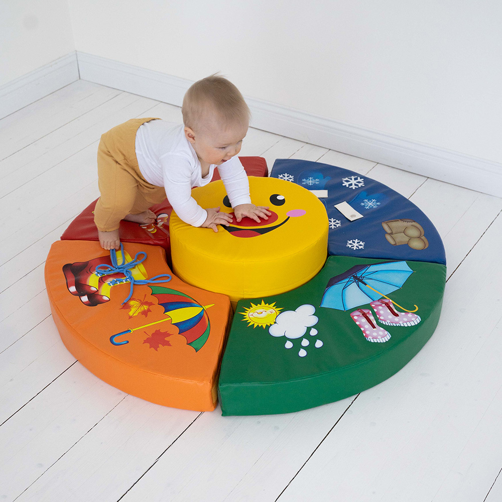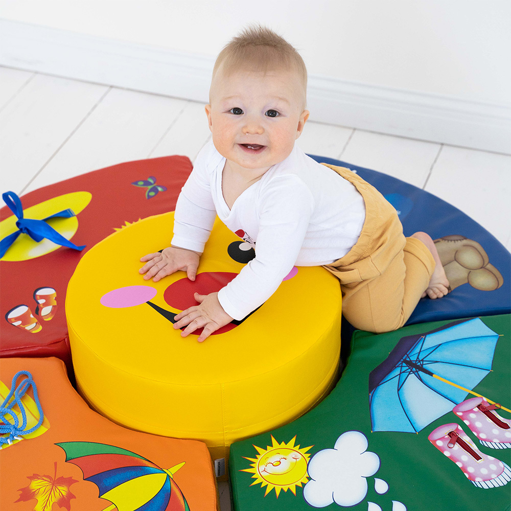 Дидактический модуль «Времена года» представляет собой пуфик и 4 элемента. На каждом элементе изображены части одежды, соответствующие сезону, и обучающая фурнитура. Габаритные размеры: 1000 х 1000 мм. Допустимая нагрузка 50 кг. Вес с упаковкой 2 кг.