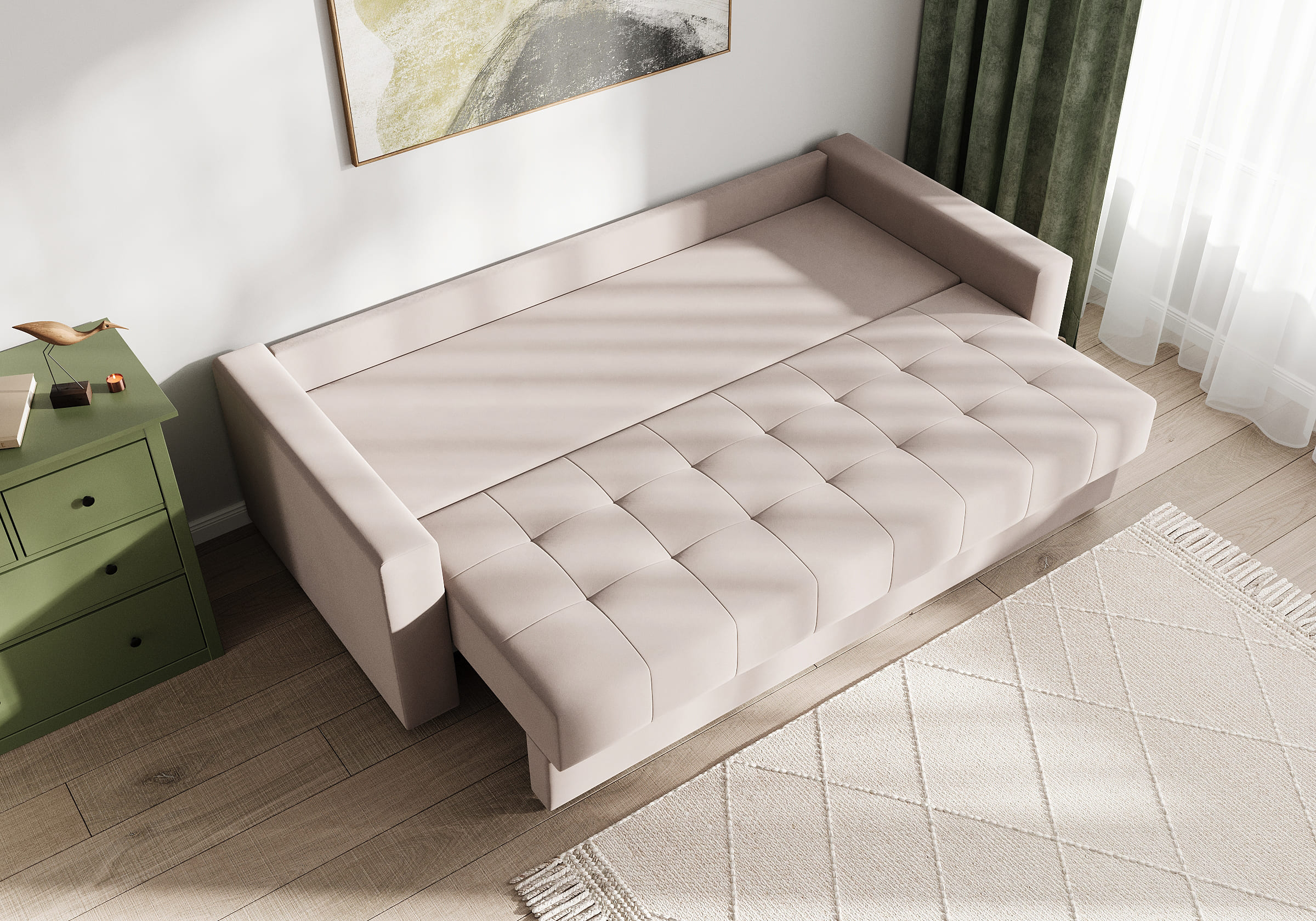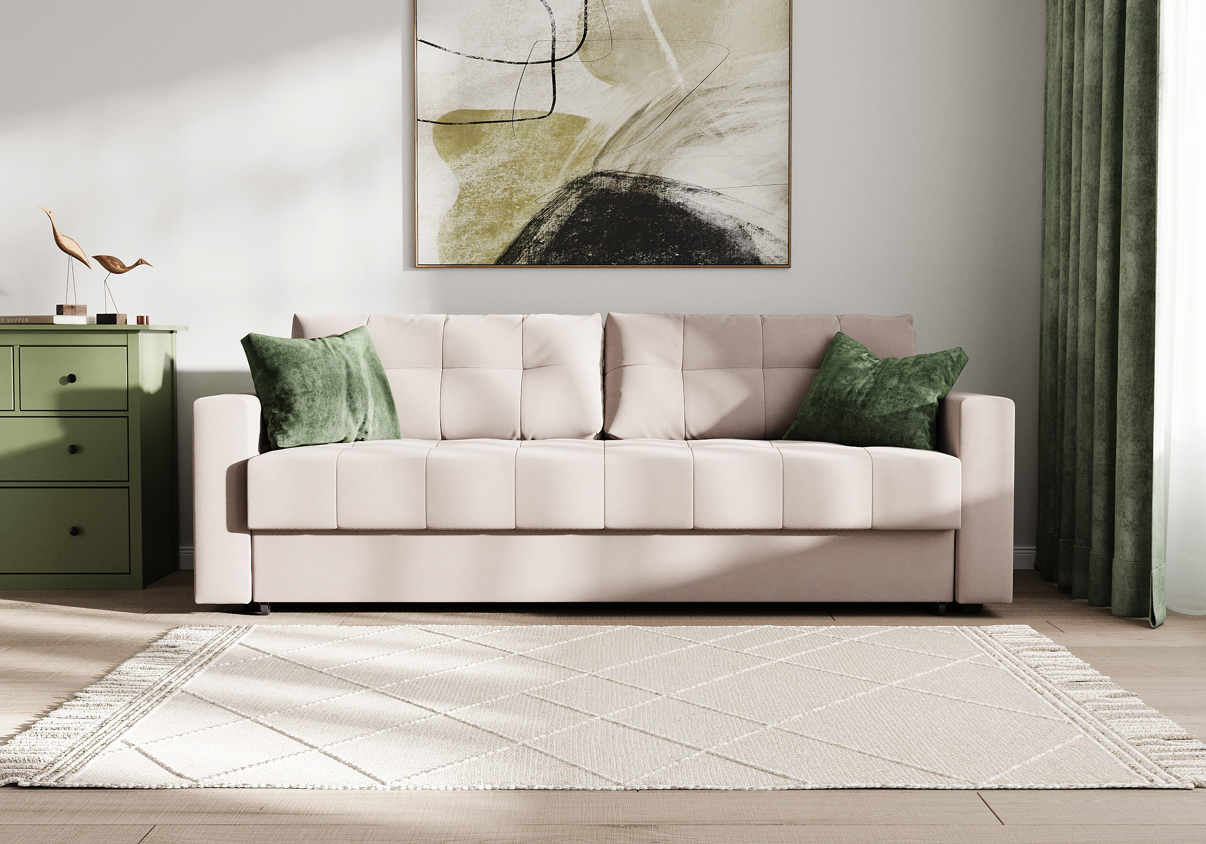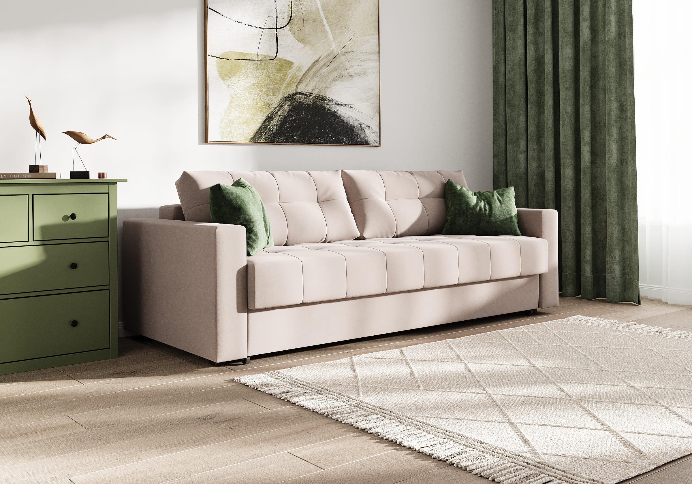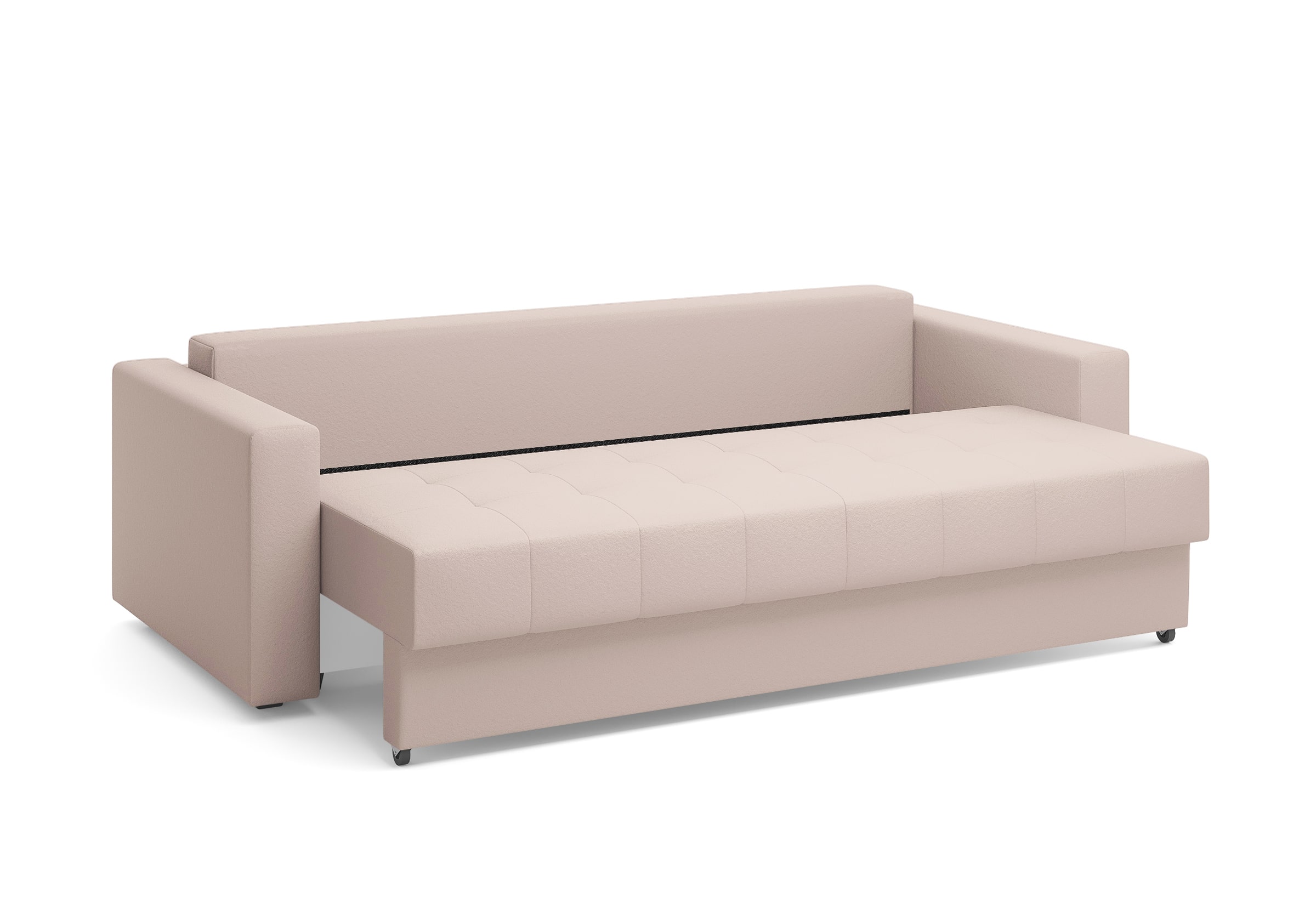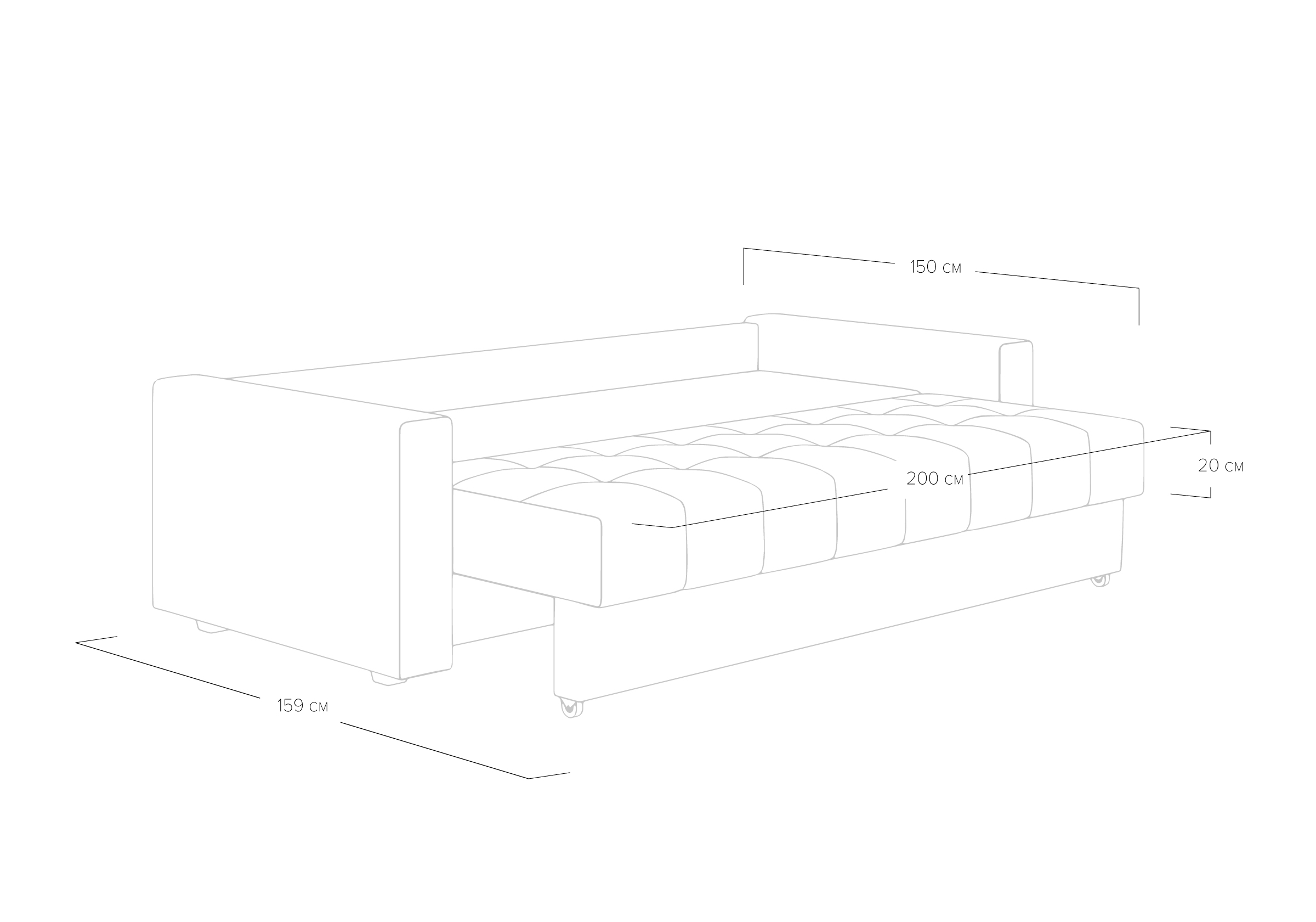 Диван для сна с подлокотниками, механизмом трансформации еврокнижка и коробом для хранения. Благодаря объемной стежке в форме квадратов на сидении и подушках, минимальным по высоте опорам, подлокотникам средней ширины, диван органично впишется в большинство современных интерьеров. Матрас анатомический с независимым пружинным блоком обеспечит комфортное спальное место. В основе мягких подушек – микс наполнителей: поролоновая крошка не дает деформироваться, а синтетическое волокно добавляет комфорт. Размер спального места: 150-200