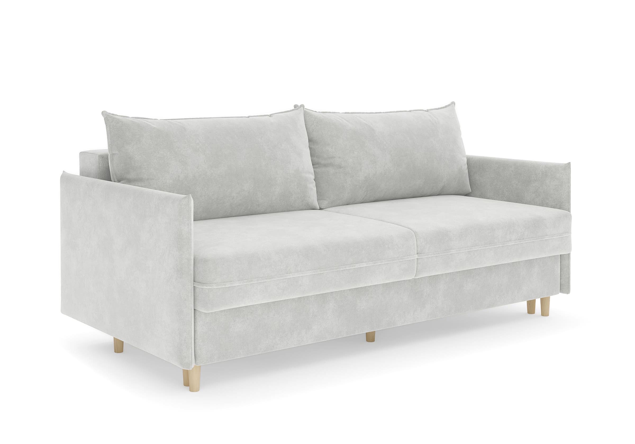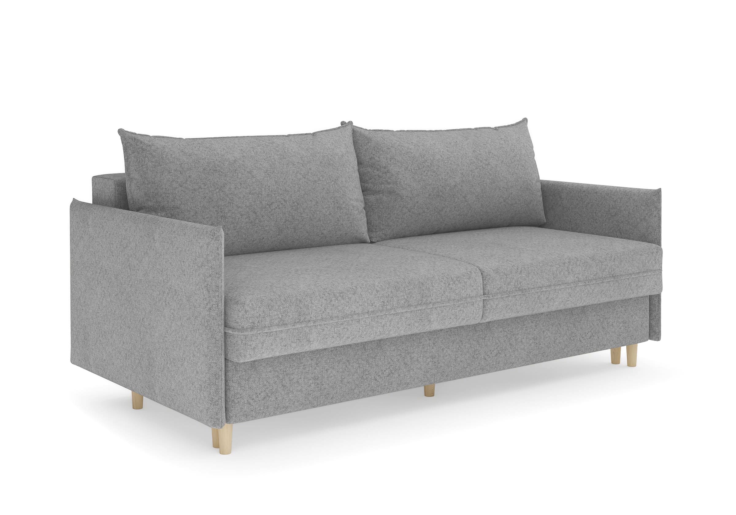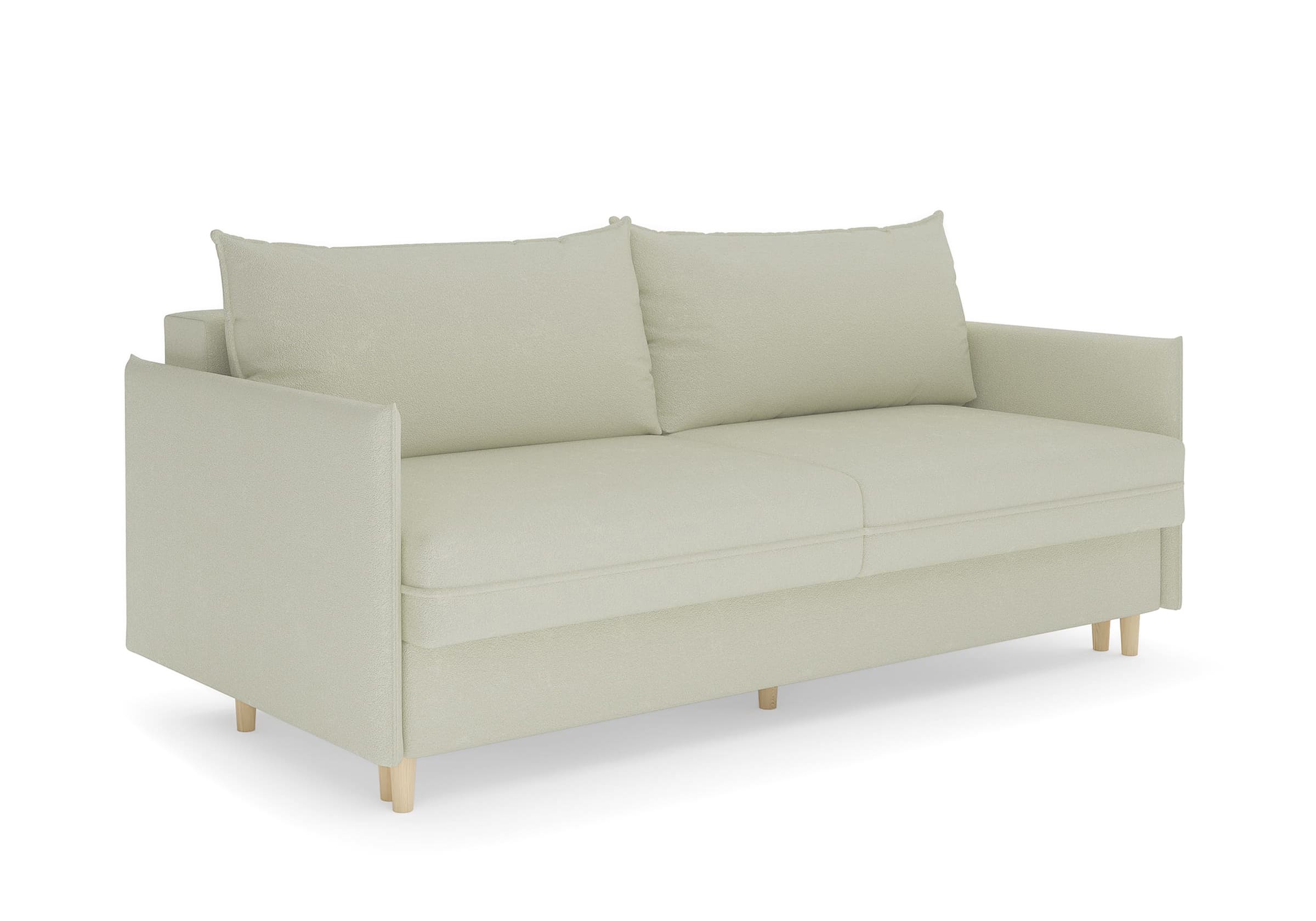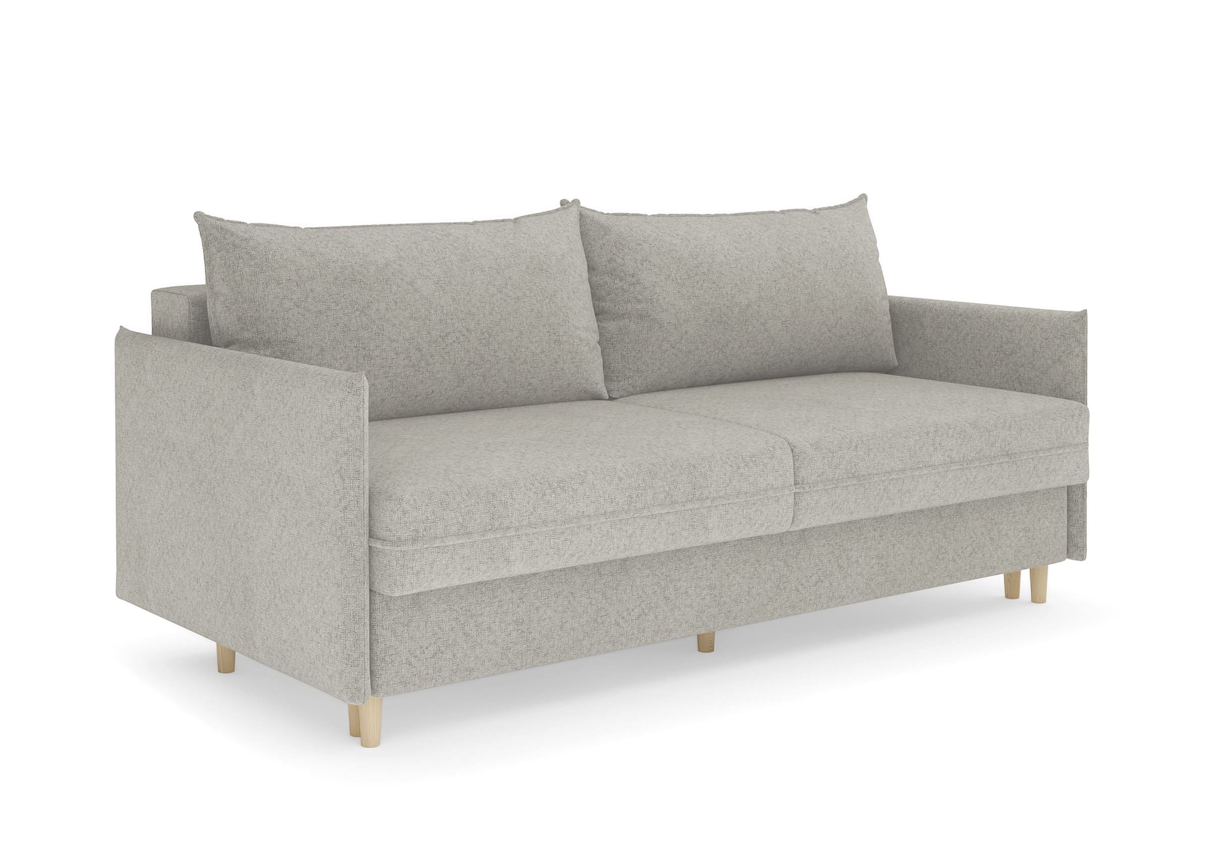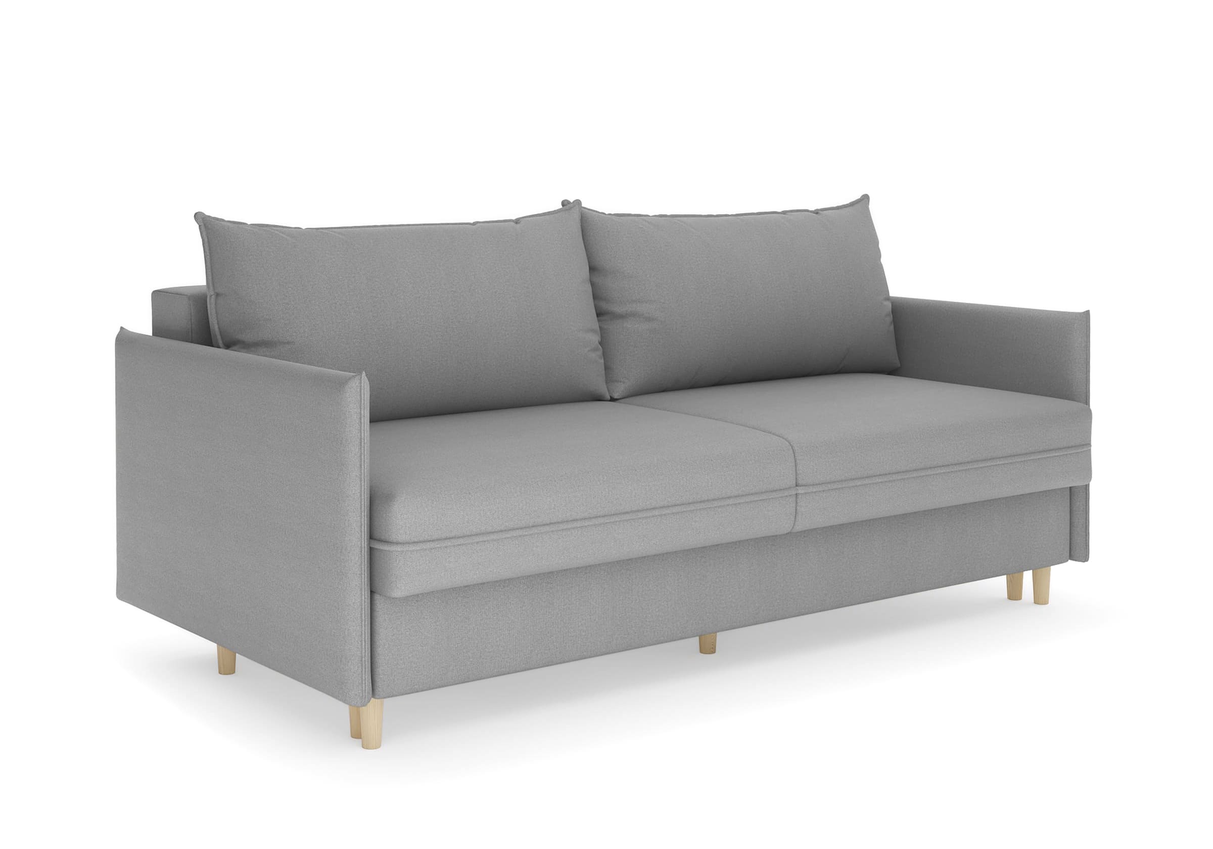 Диван для сна в скандинавском стиле с механизмом трансформации пантограф и коробом для хранения. Модель без броского декора, с прямыми линиями. Благодаря декоративному канту на сидении, подлокотниках и подушках, а также опорам из натурального массива Rain органично впишется в современные интерьеры в скандинавском стиле. У дивана анатомический матрас с блоком независимых пружин, жесткость средняя. Тонкие подлокотники делают диван негабаритным в длину. Комфортная глубина и высота сиденья обеспечит ежедневный комфорт. Задняя спинка предотвращает загрязнение и повреждение стены. В основе мягких подушек – микс наполнителей: поролоновая крошка не дает деформироваться, а синтетическое волокно добавляет комфорт. Опоры деревянные, два цвета на выбор. Просвет над полом способствует легкой уборке под диваном, в том числе роботом-пылесосом.. Размер сального места: 150-200