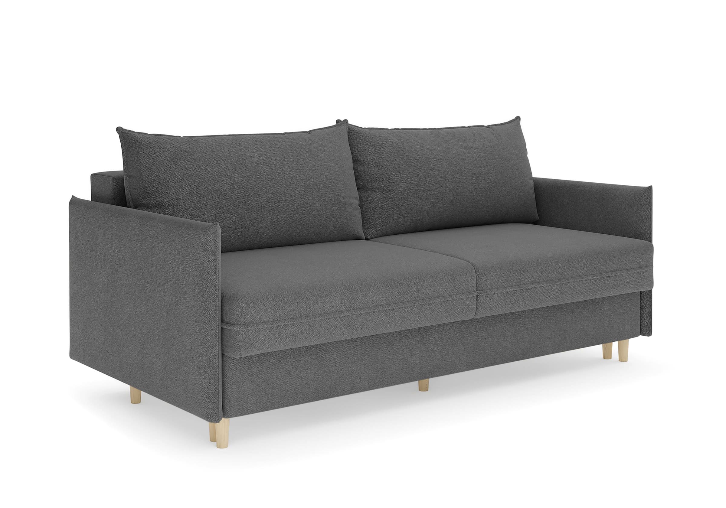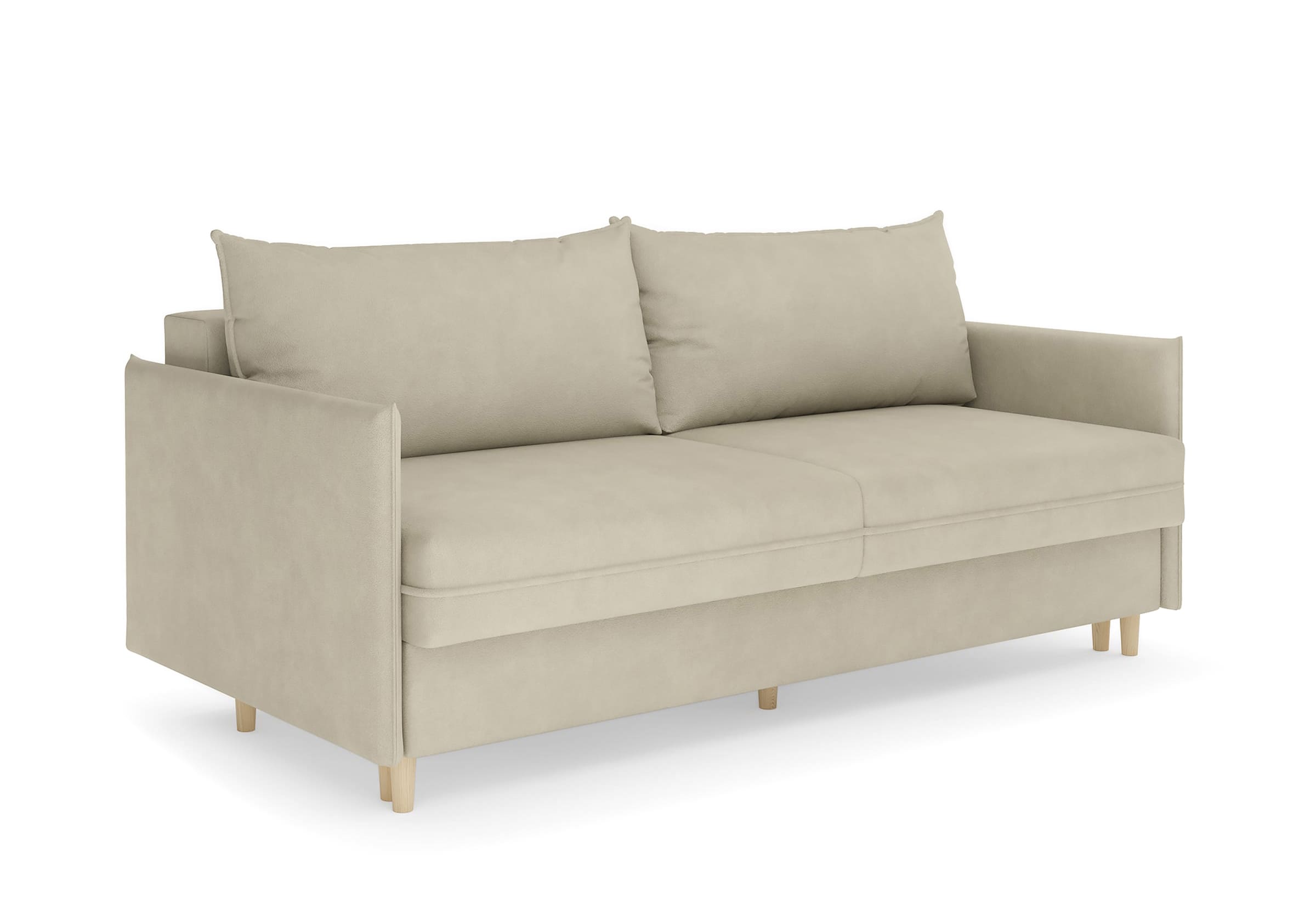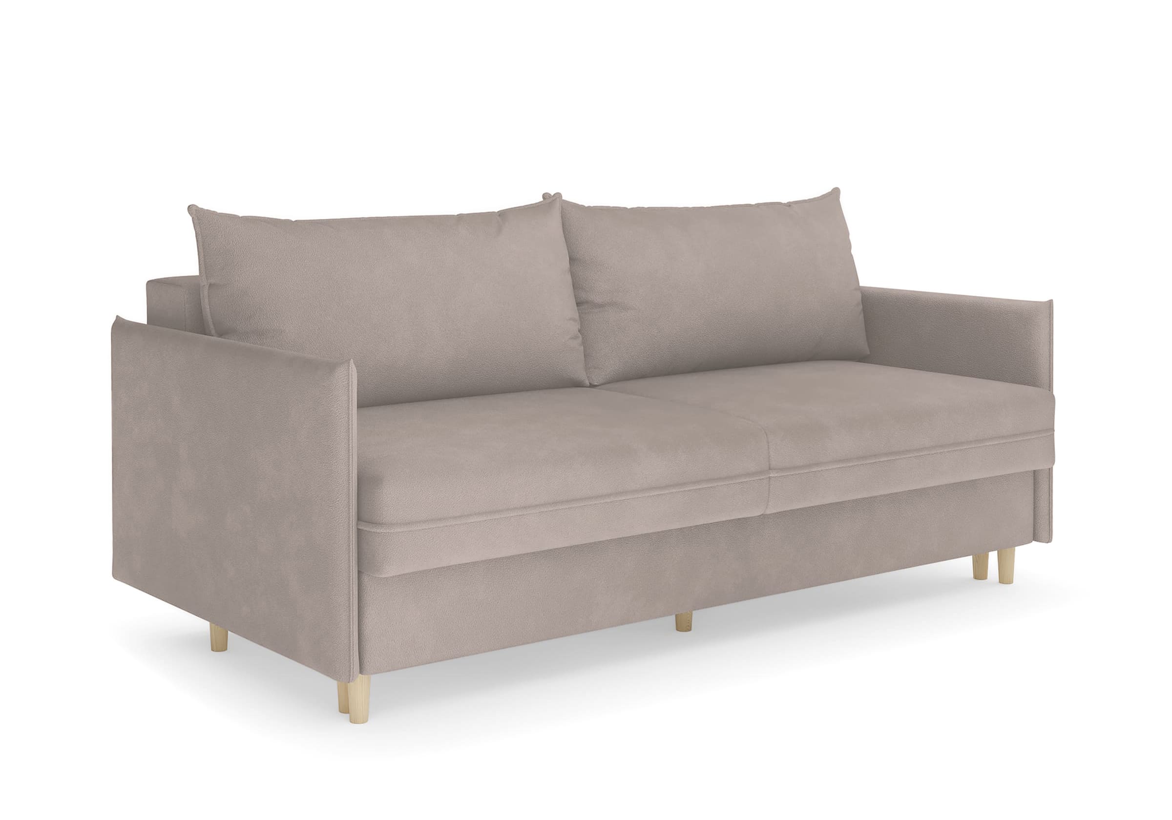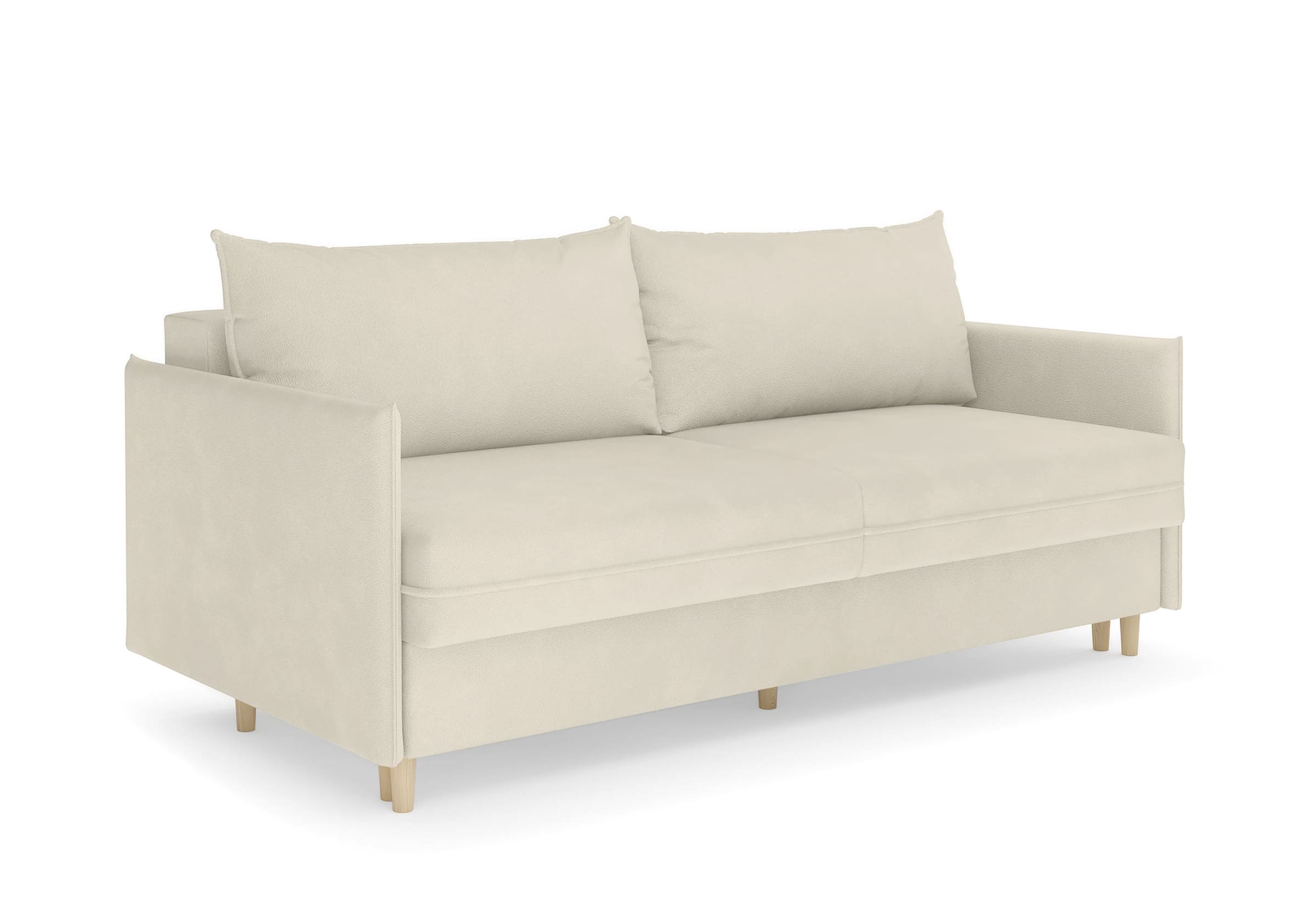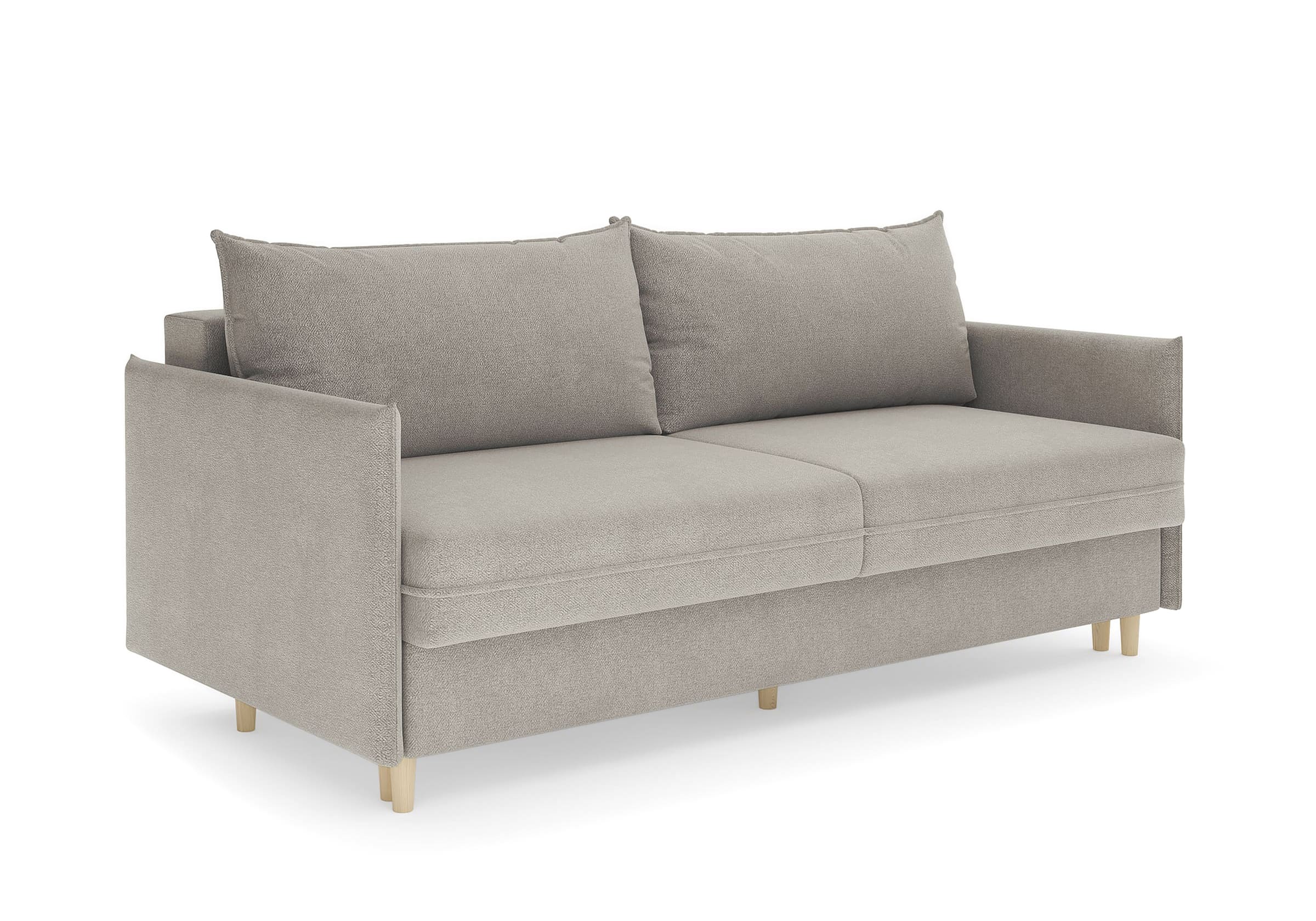Диван для сна в скандинавском стиле с механизмом трансформации пантограф и коробом для хранения. Модель без броского декора, с прямыми линиями. Благодаря декоративному канту на сидении, подлокотниках и подушках, а также опорам из натурального массива Rain органично впишется в современные интерьеры в скандинавском стиле. У дивана анатомический матрас с блоком независимых пружин, жесткость средняя. Тонкие подлокотники делают диван негабаритным в длину. Комфортная глубина и высота сиденья обеспечит ежедневный комфорт. Задняя спинка предотвращает загрязнение и повреждение стены. В основе мягких подушек – микс наполнителей: поролоновая крошка не дает деформироваться, а синтетическое волокно добавляет комфорт. Опоры деревянные, два цвета на выбор. Просвет над полом способствует легкой уборке под диваном, в том числе роботом-пылесосом.. Размер сального места: 150-200