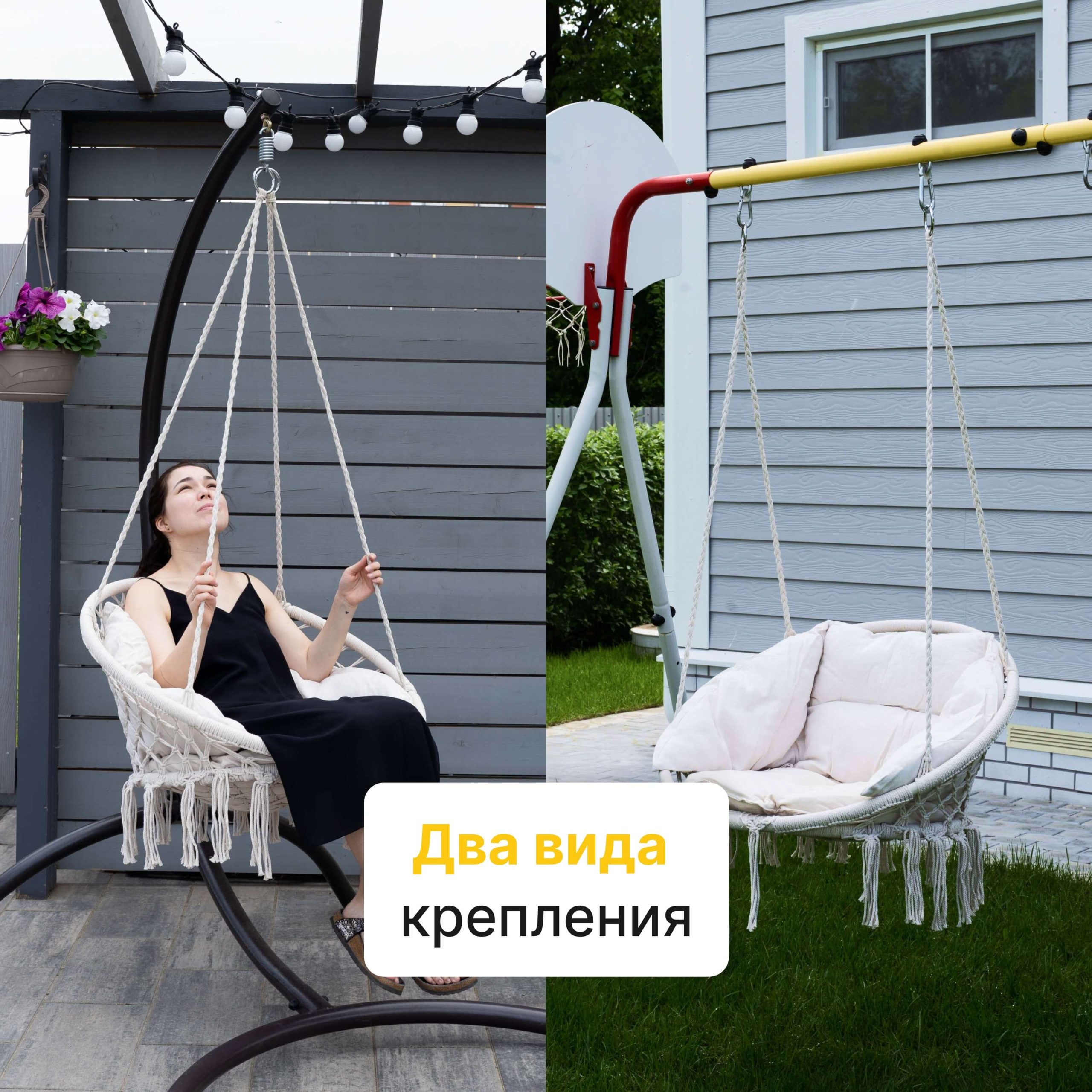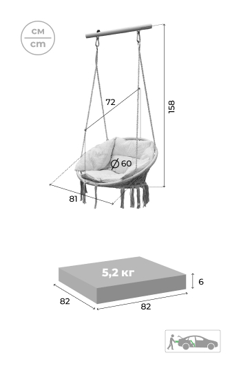 Прикрепить качели можно куда угодно: турник, горизонтальную балку, дачный или спортивный комплекс, специальные стойки, крюк или просто ветку дерева. Прочный каркас качелей и веревочная сетка выдерживают нагрузку до 120 кг.
