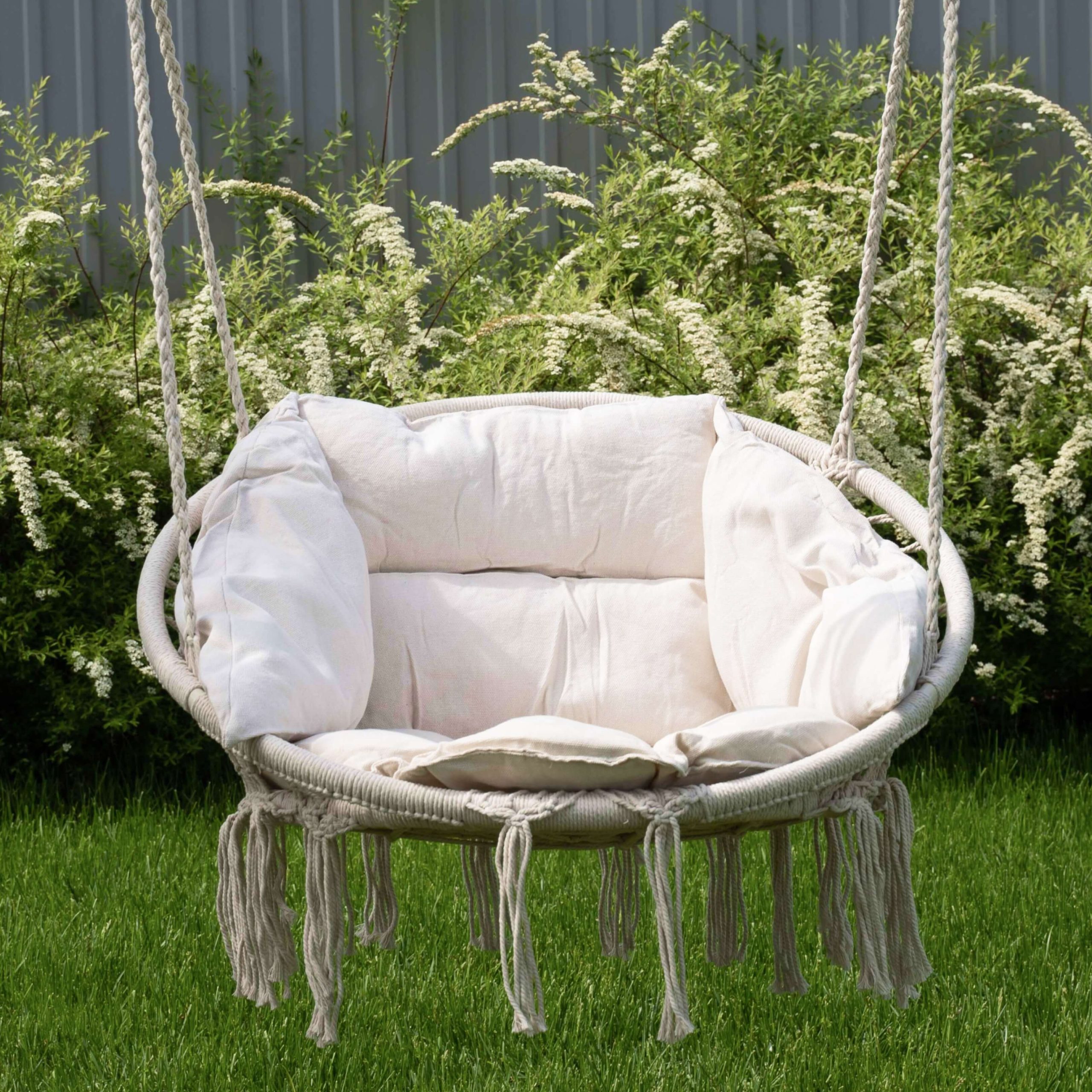 Мягкое и удобное сиденье со спинкой изготовлено из 100% хлопка. Натуральная ткань имеет высокие воздухопроницаемые и влаговпитывающие свойства, устойчива к износу, на ней будет комфортно сидеть или качаться даже в жаркий летний день.