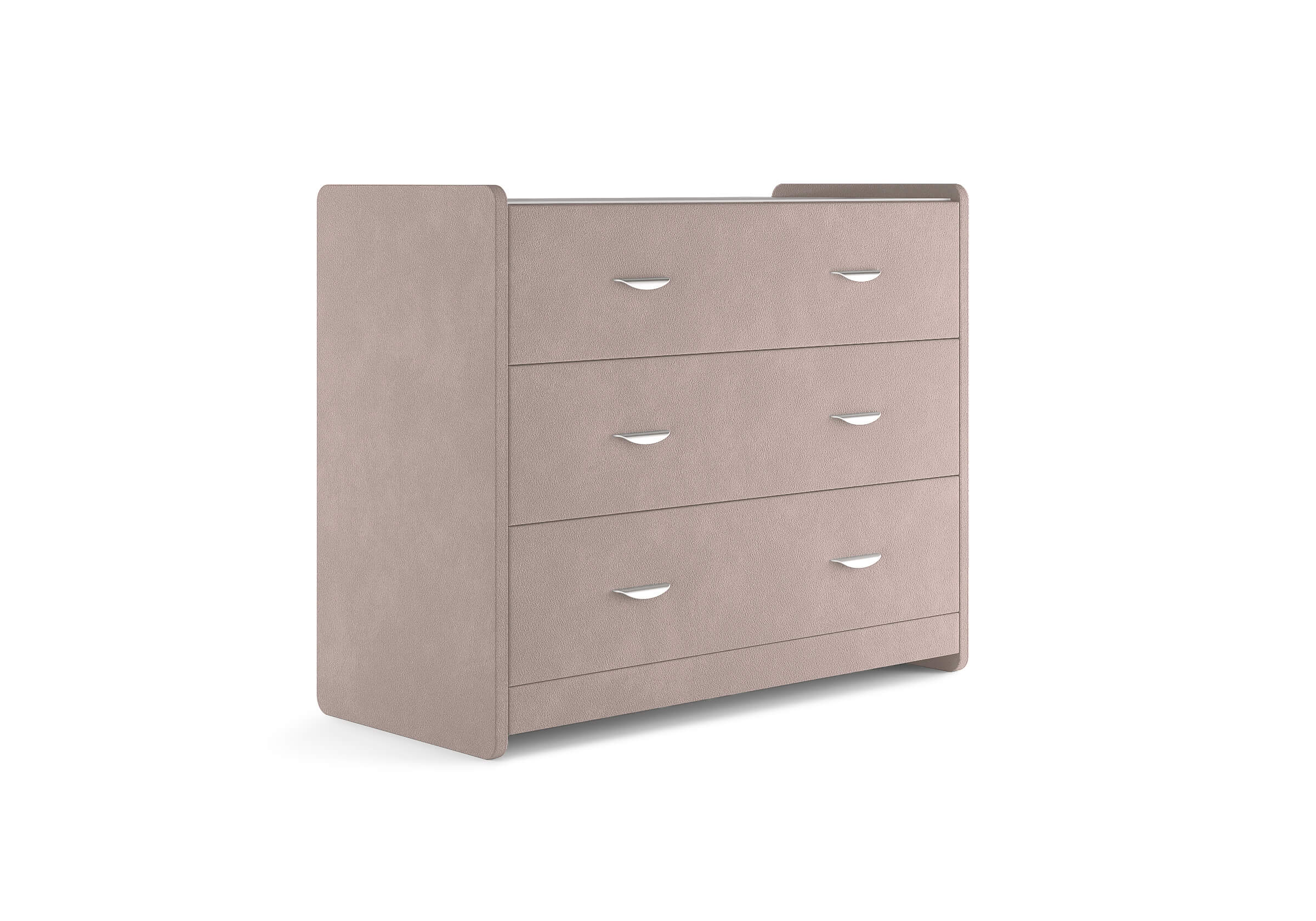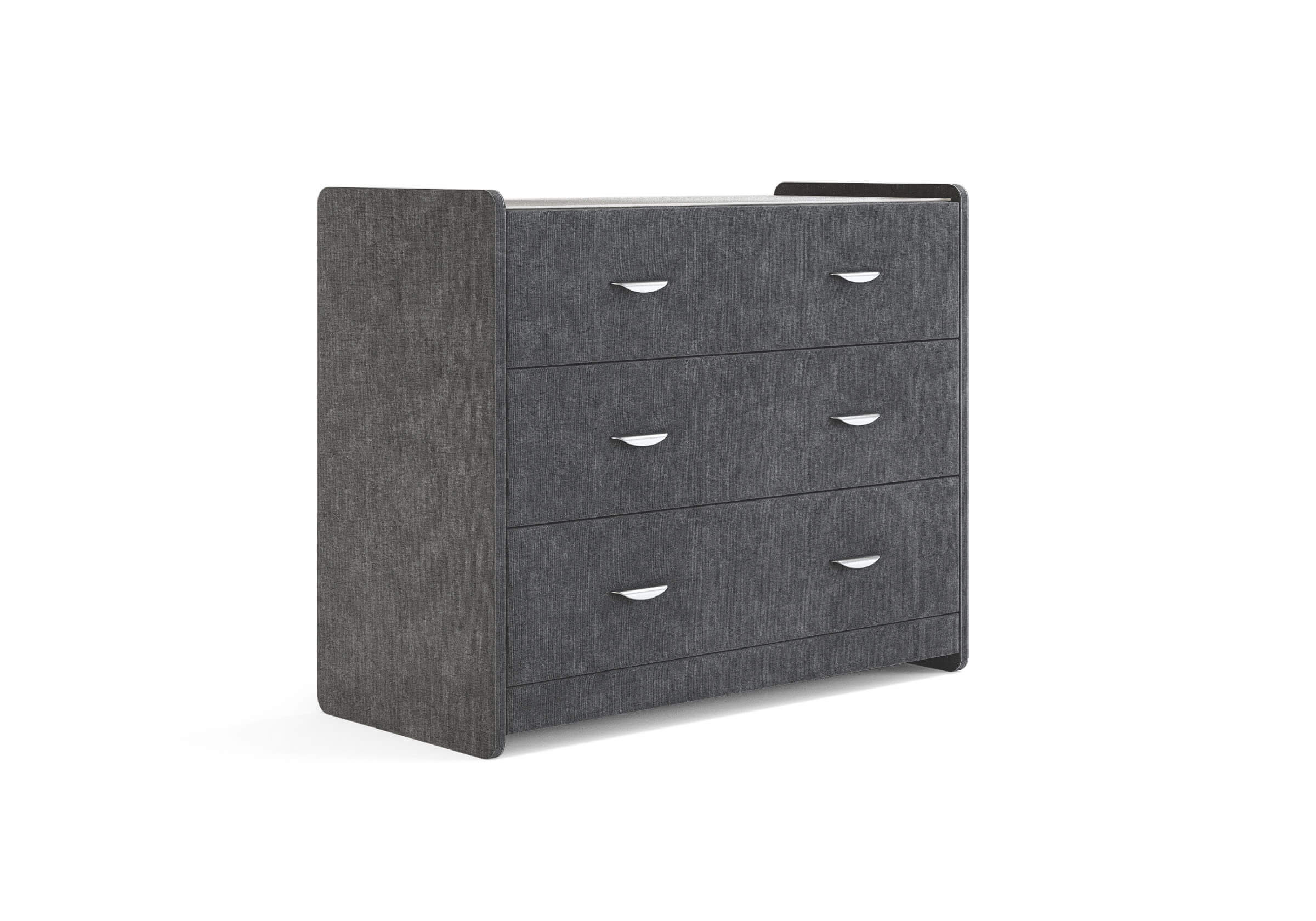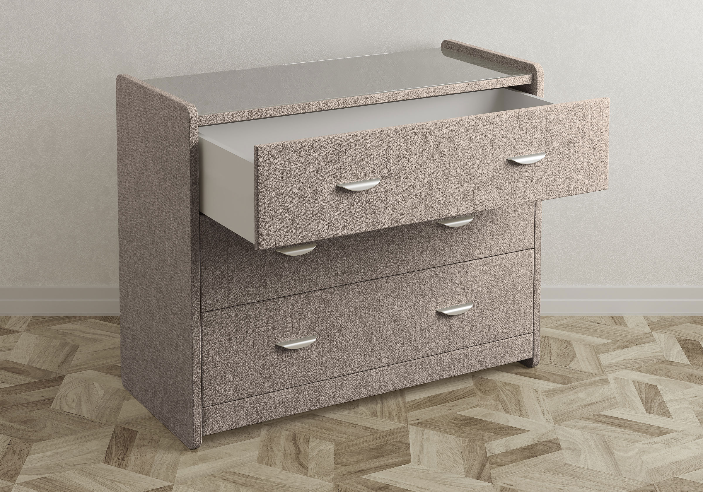 Современный и элегантный комод отличается повышенным удобством. Фасад ящиков и стенки комода покрыты обивочным материалом и выполняются в 43 вариантах цветового исполнения. Для удобства использования и продления срока эксплуатации, рекомендуется использовать стеклянную накладку. Накладка используется в качестве столешницы для тумбы и защищает ее от повреждений и загрязнений.