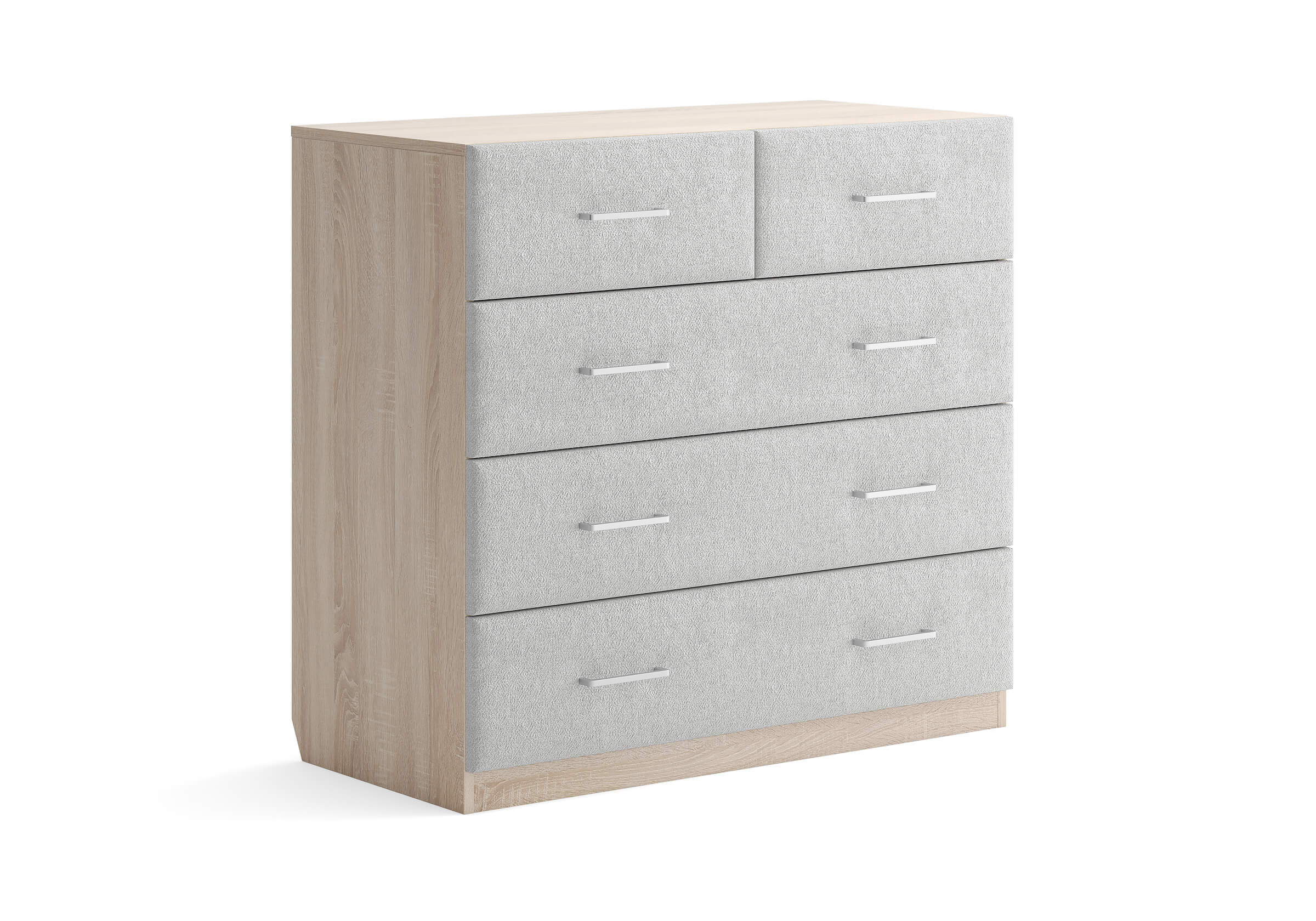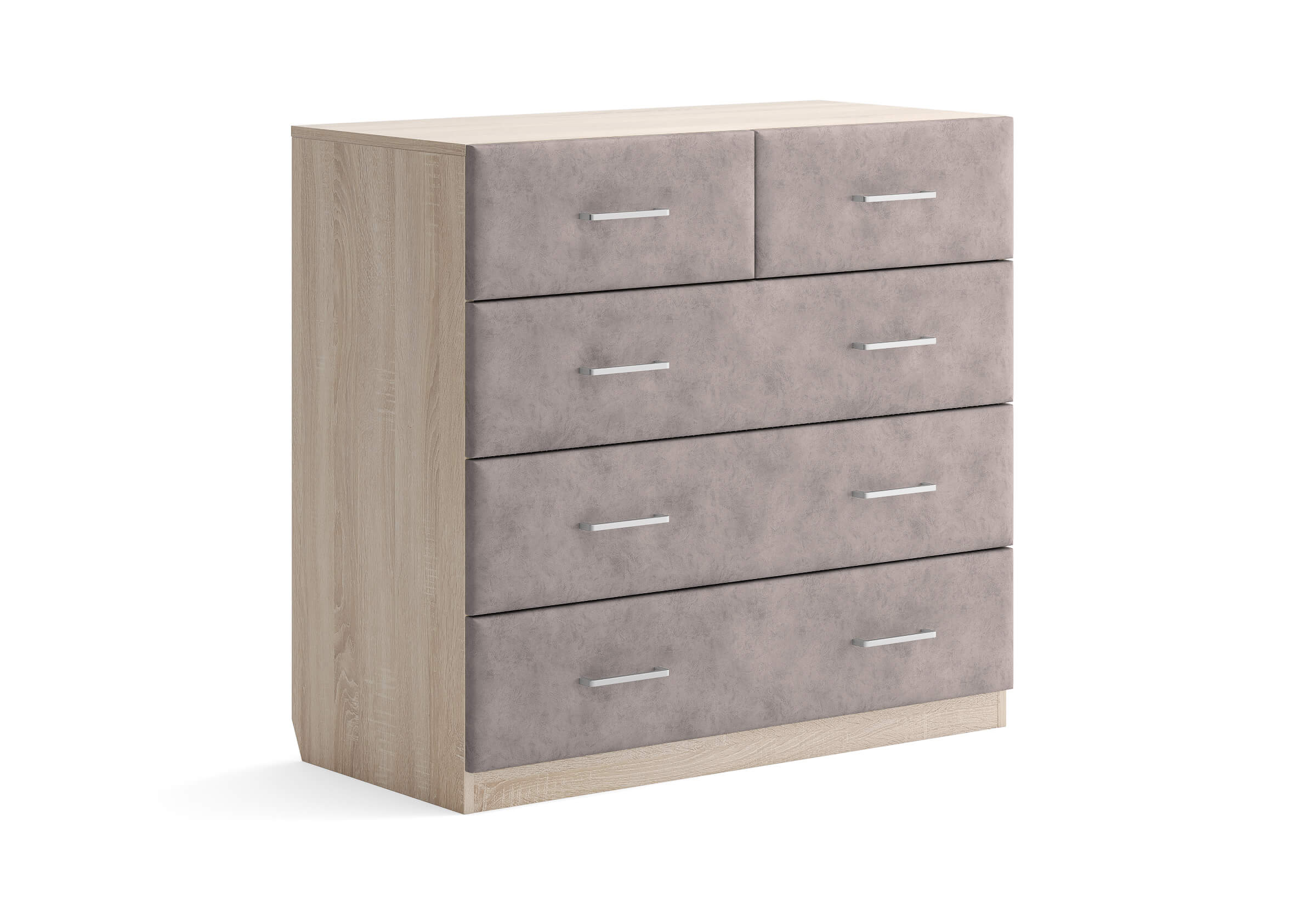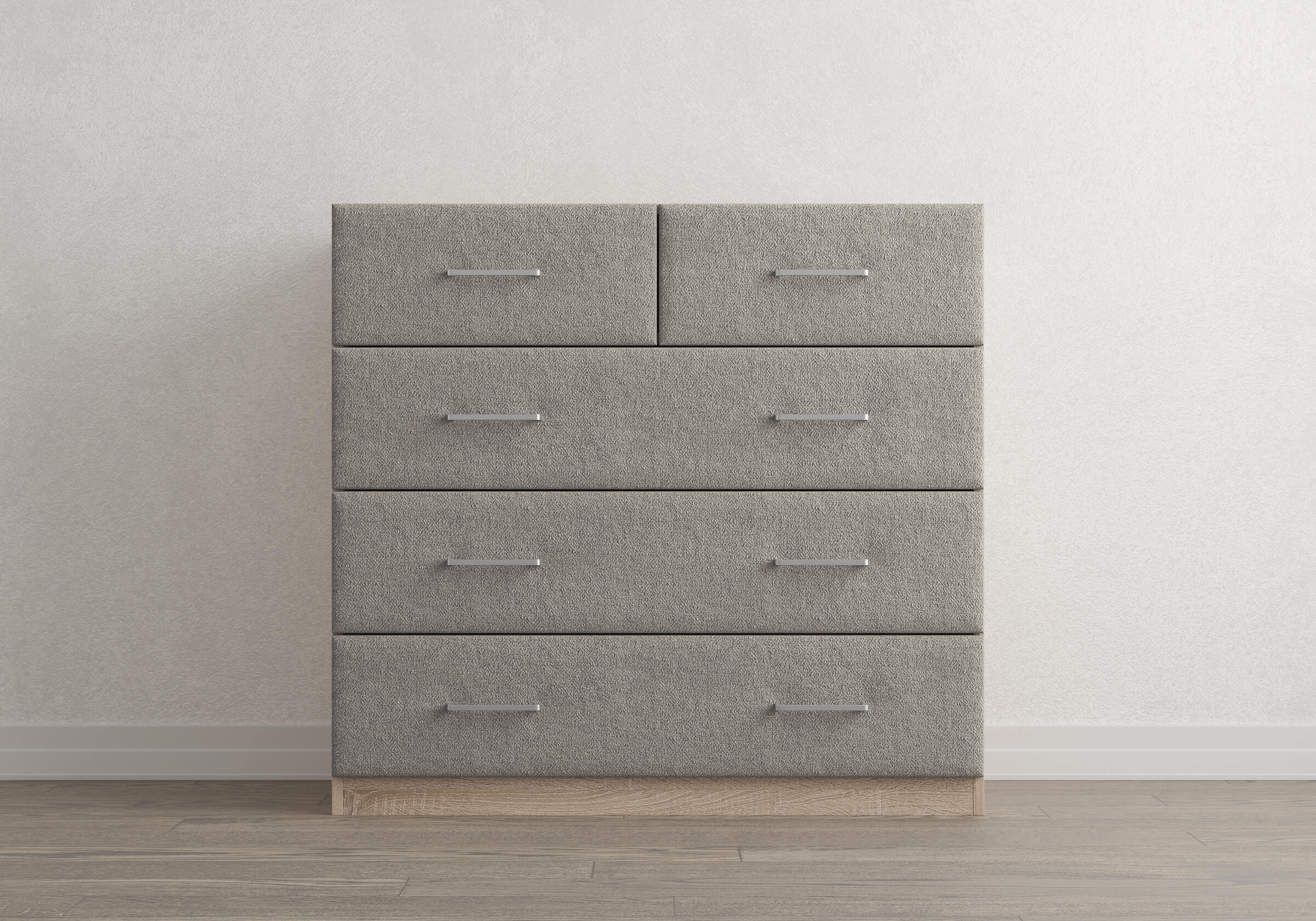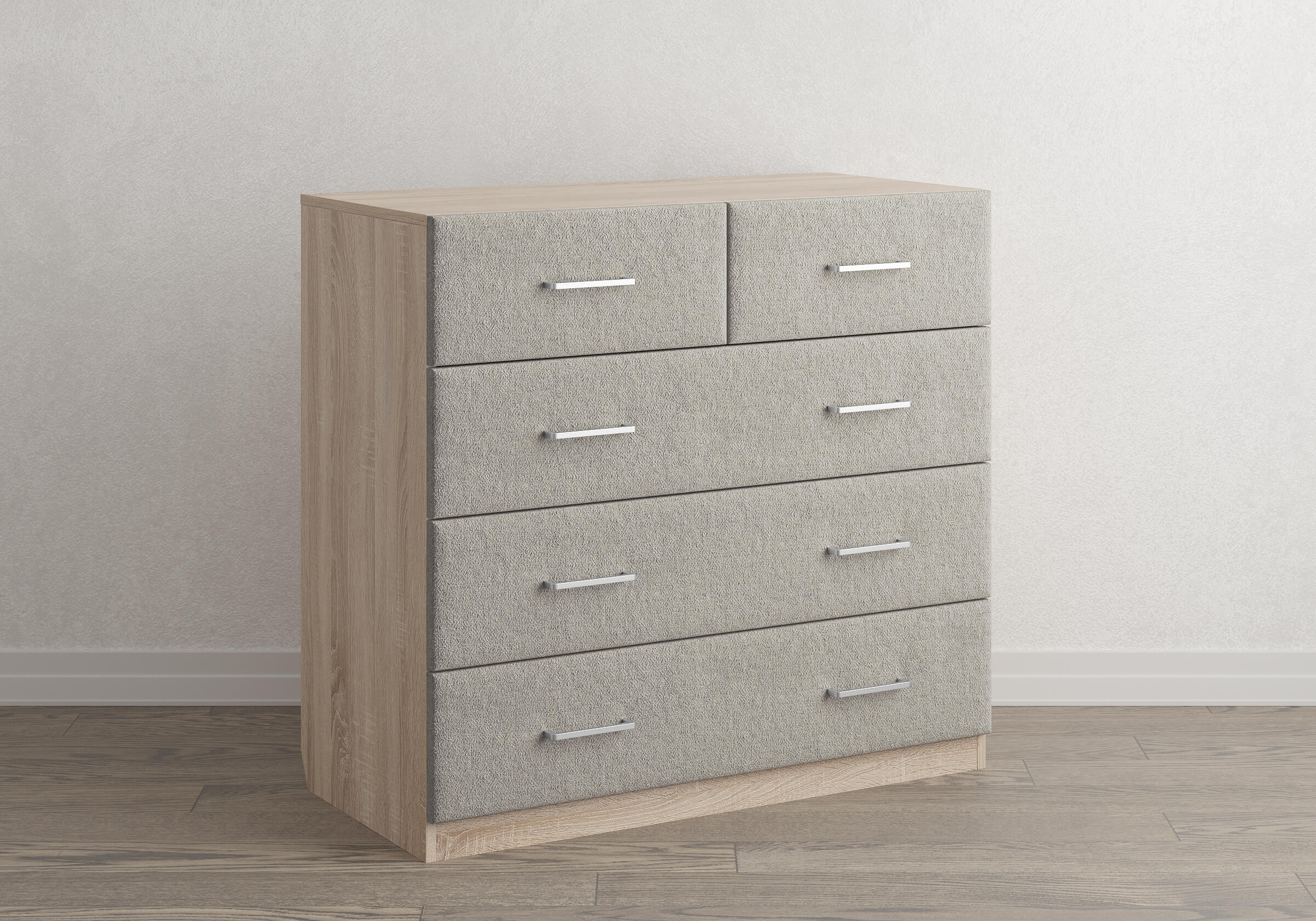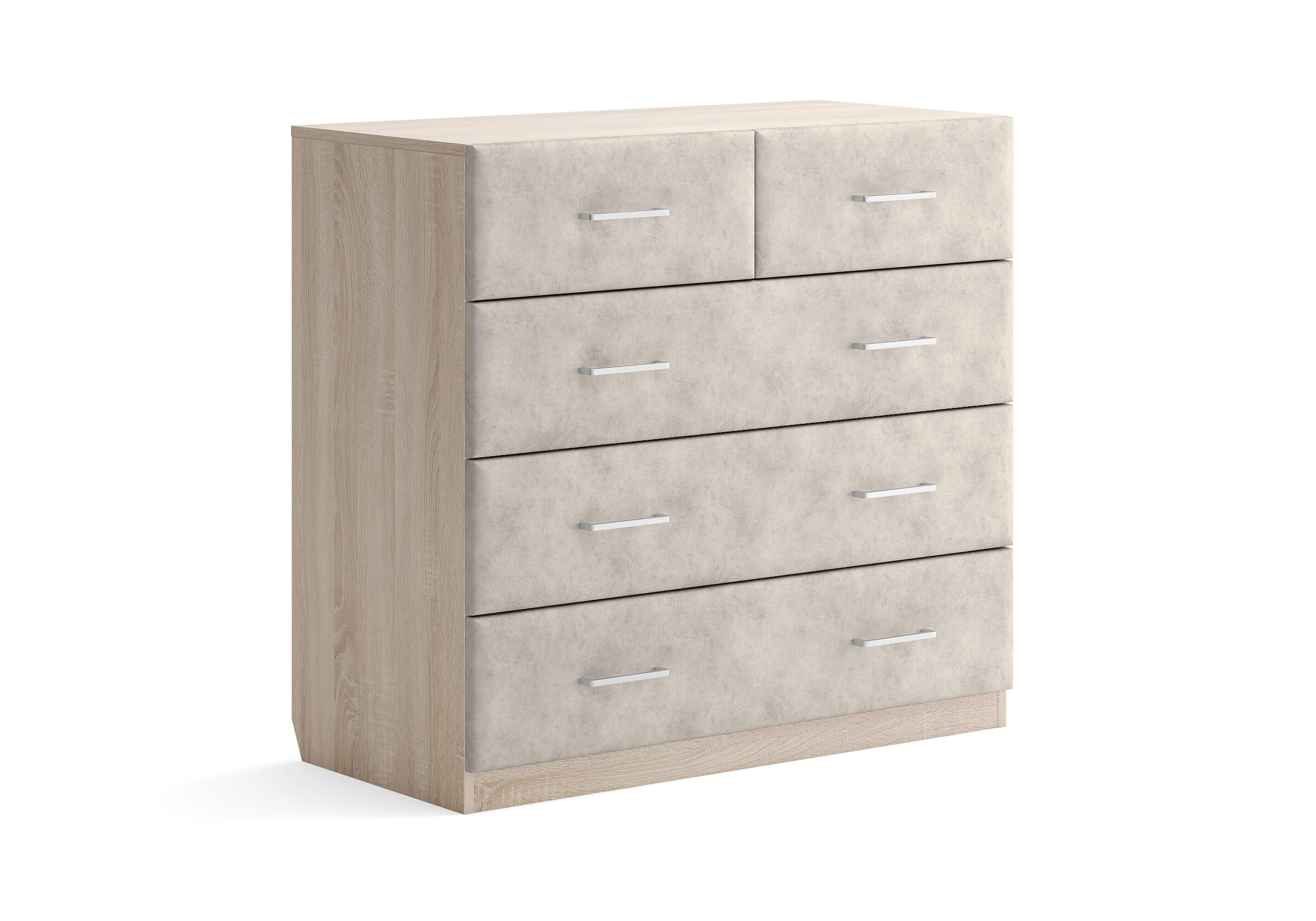 Комбинированный комод Tomas с пятью вместительными ящиками станет элегантным дополнением интерьера. Корпус, выполненный из высококачественной ЛДСП, гарантирует прочность и долговечность, а мягкие фасады в ткани и изящные металлические ручки добавят уют. Комод имеет скос под плинтус, это позволяет устанавливать его вплотную к стене. Благодаря своему дизайну и широкому выбору вариантов исполнения комод можно разместить не только в спальне, но и в прихожей или гостиной.