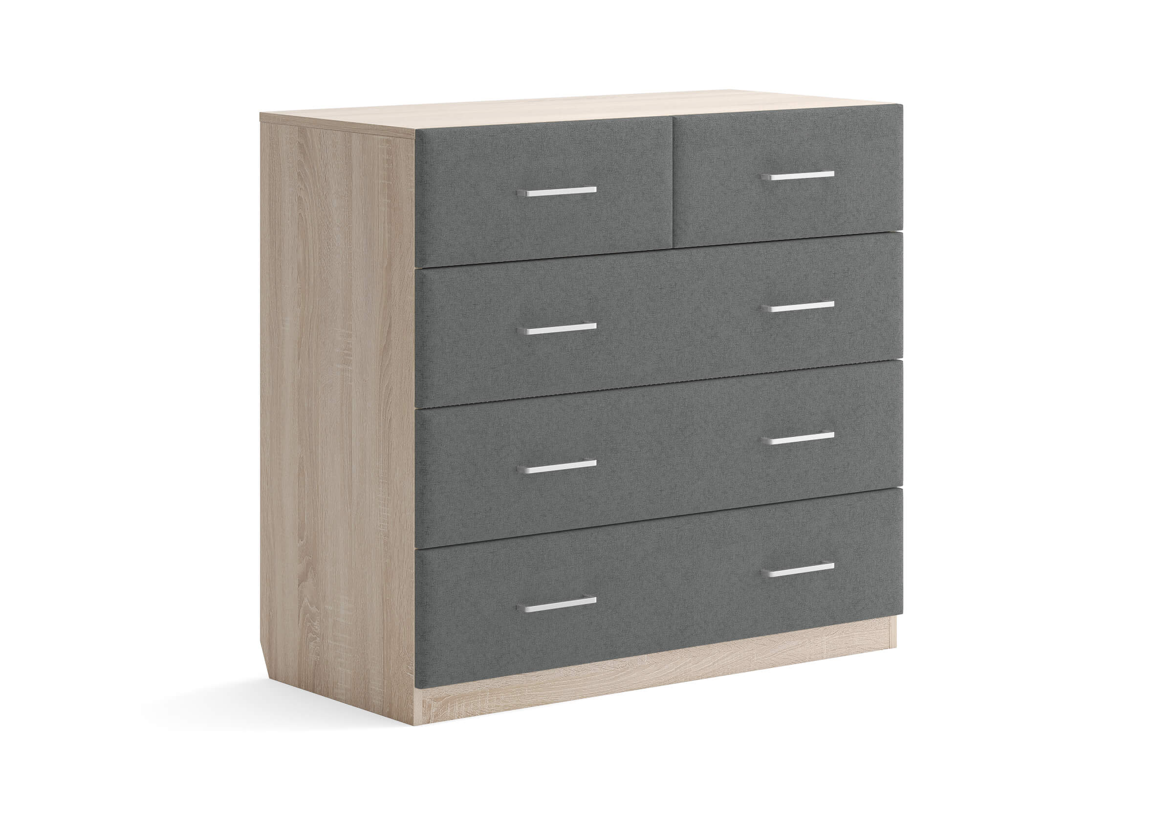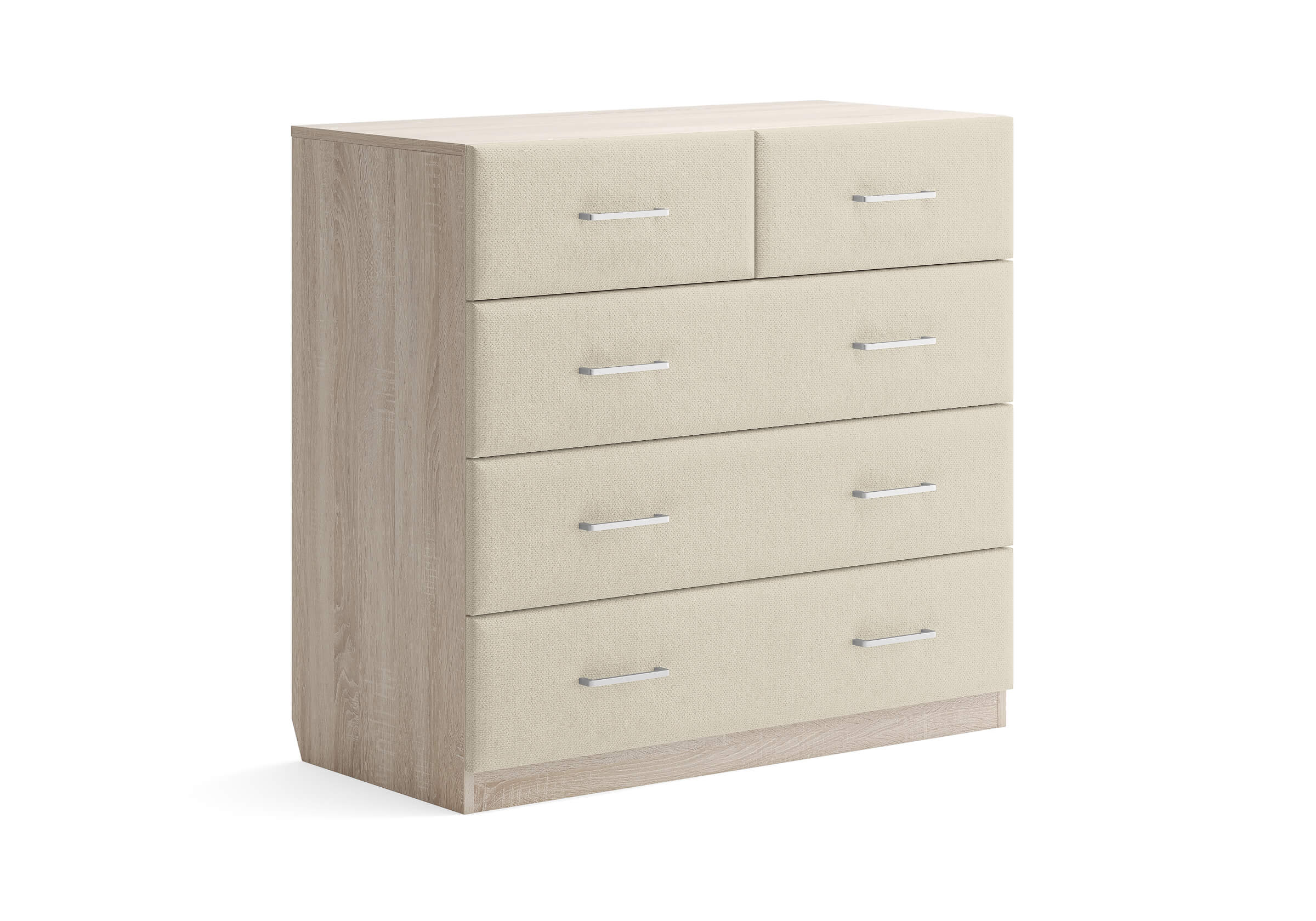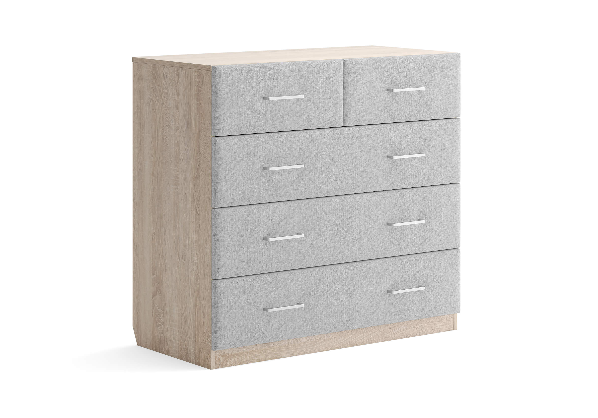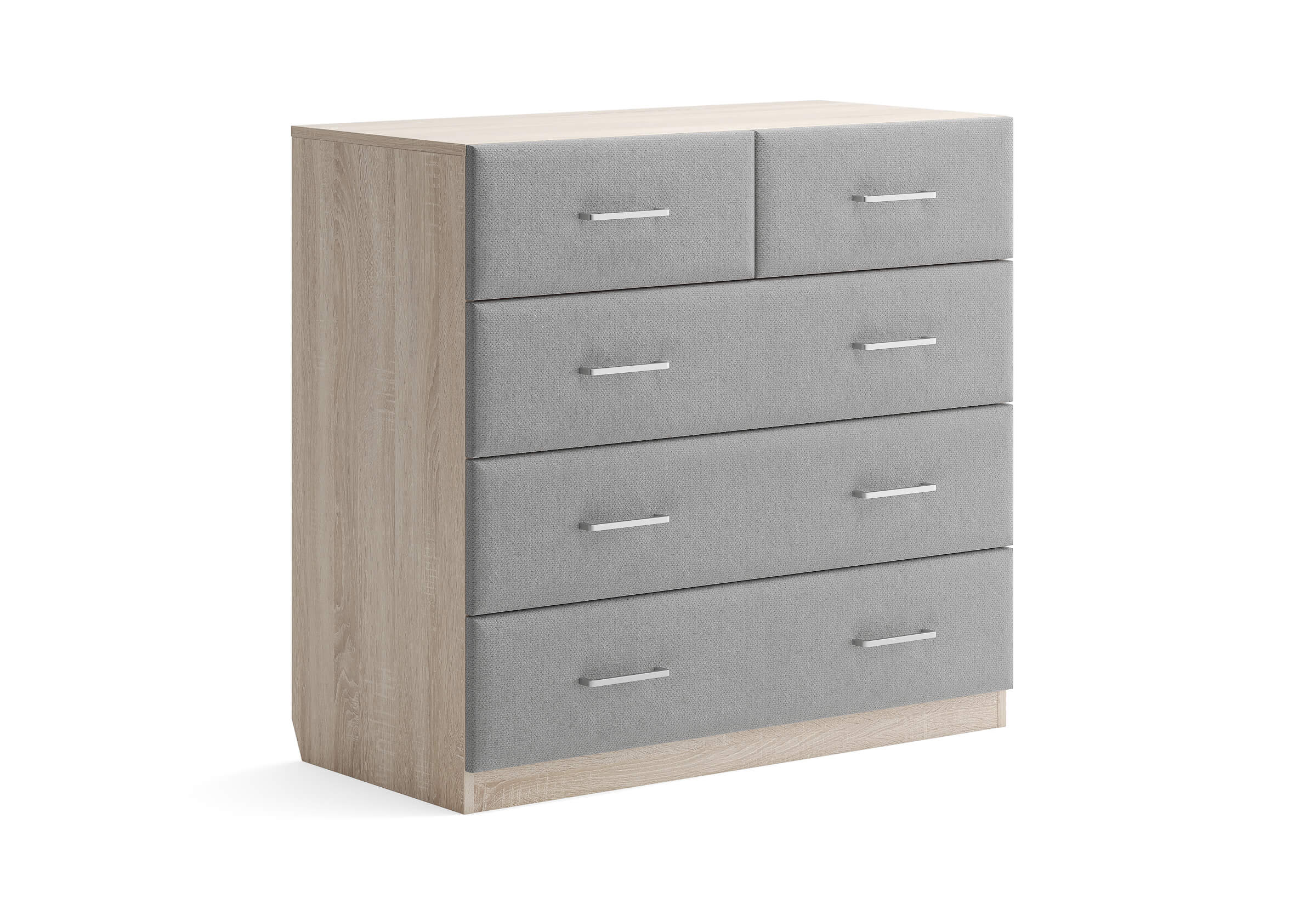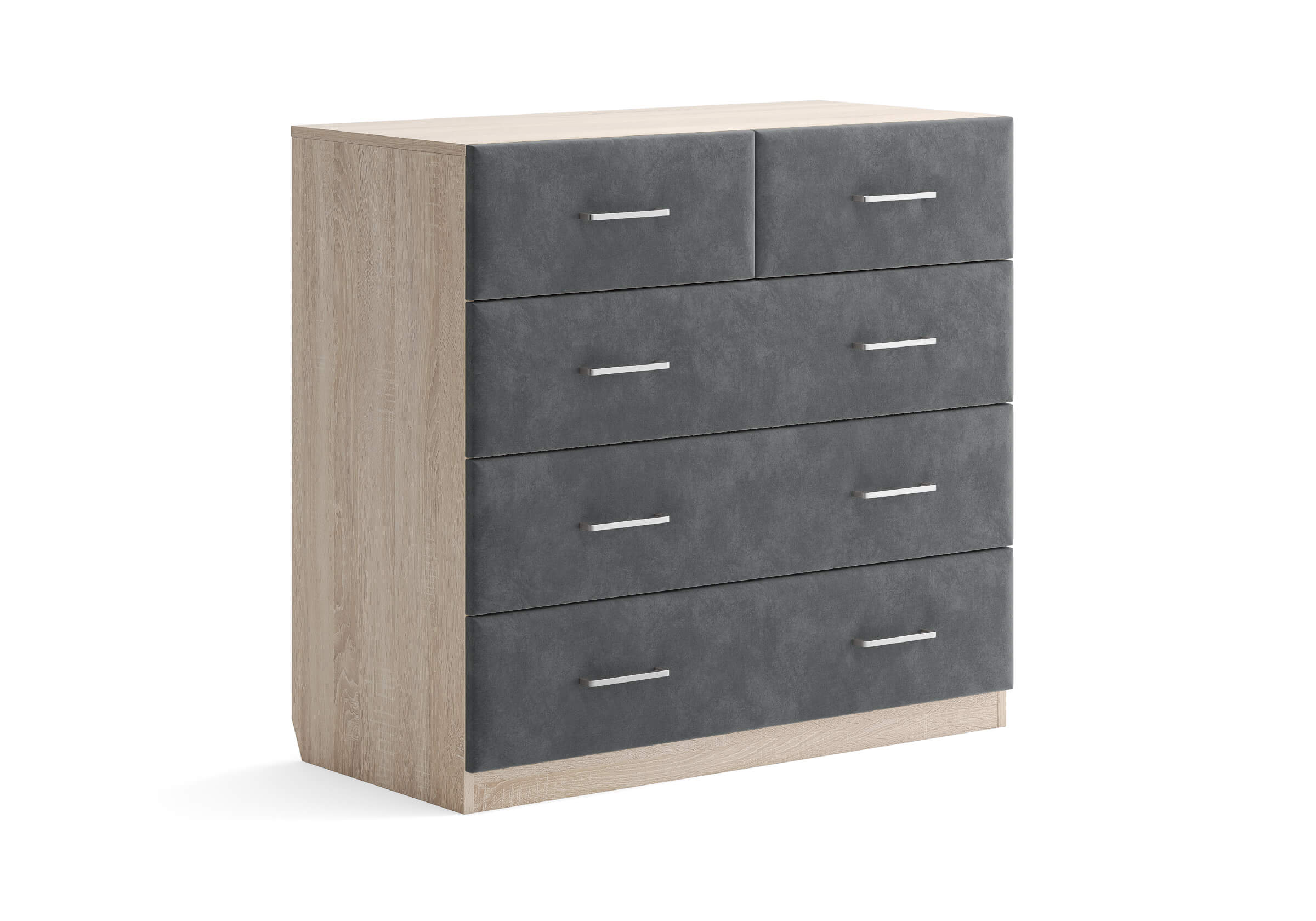 Комбинированный комод Tomas с пятью вместительными ящиками станет элегантным дополнением интерьера. Корпус, выполненный из высококачественной ЛДСП, гарантирует прочность и долговечность, а мягкие фасады в ткани и изящные металлические ручки добавят уют. Комод имеет скос под плинтус, это позволяет устанавливать его вплотную к стене. Благодаря своему дизайну и широкому выбору вариантов исполнения комод можно разместить не только в спальне, но и в прихожей или гостиной.