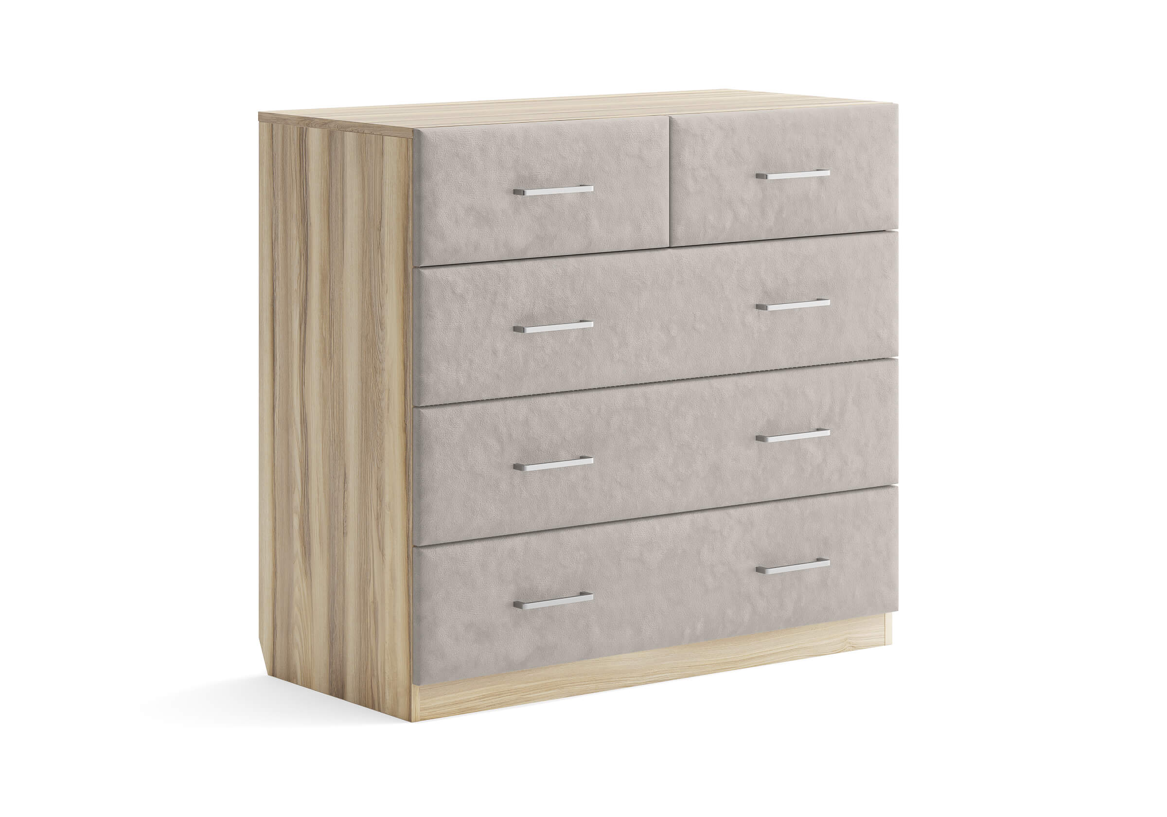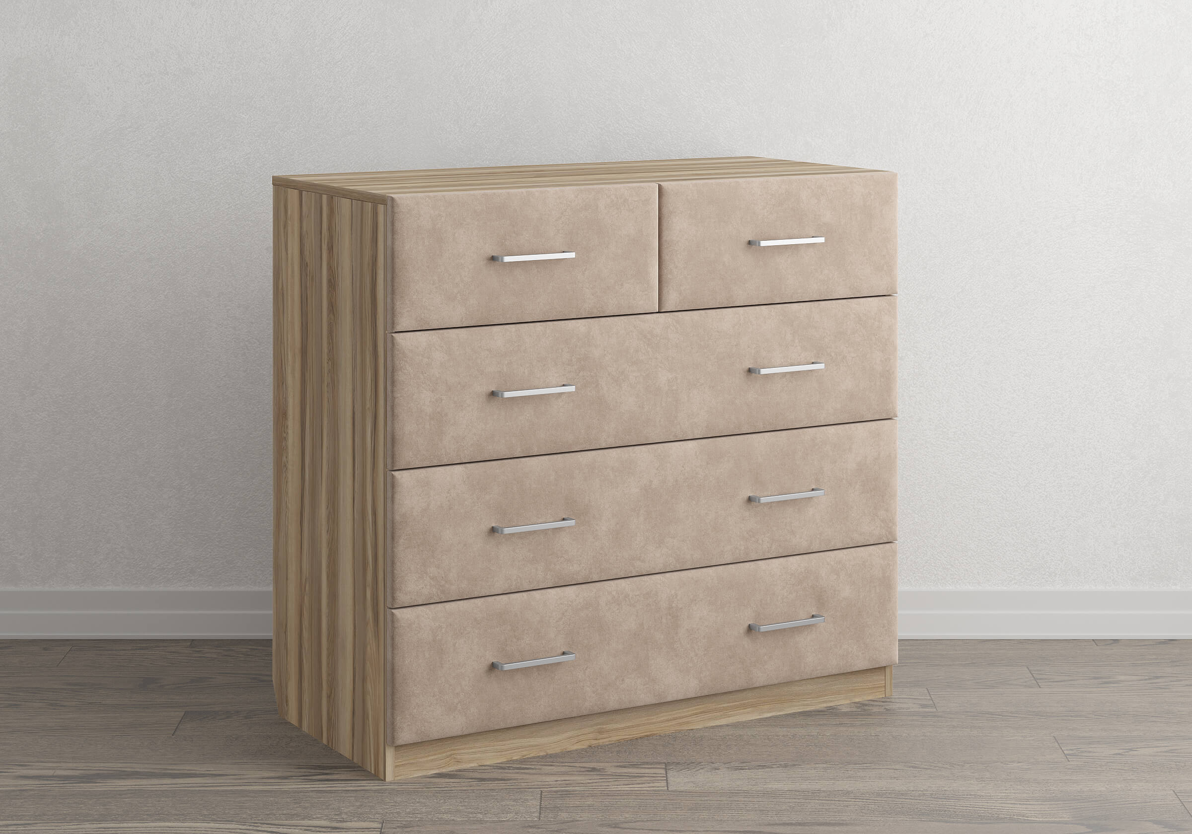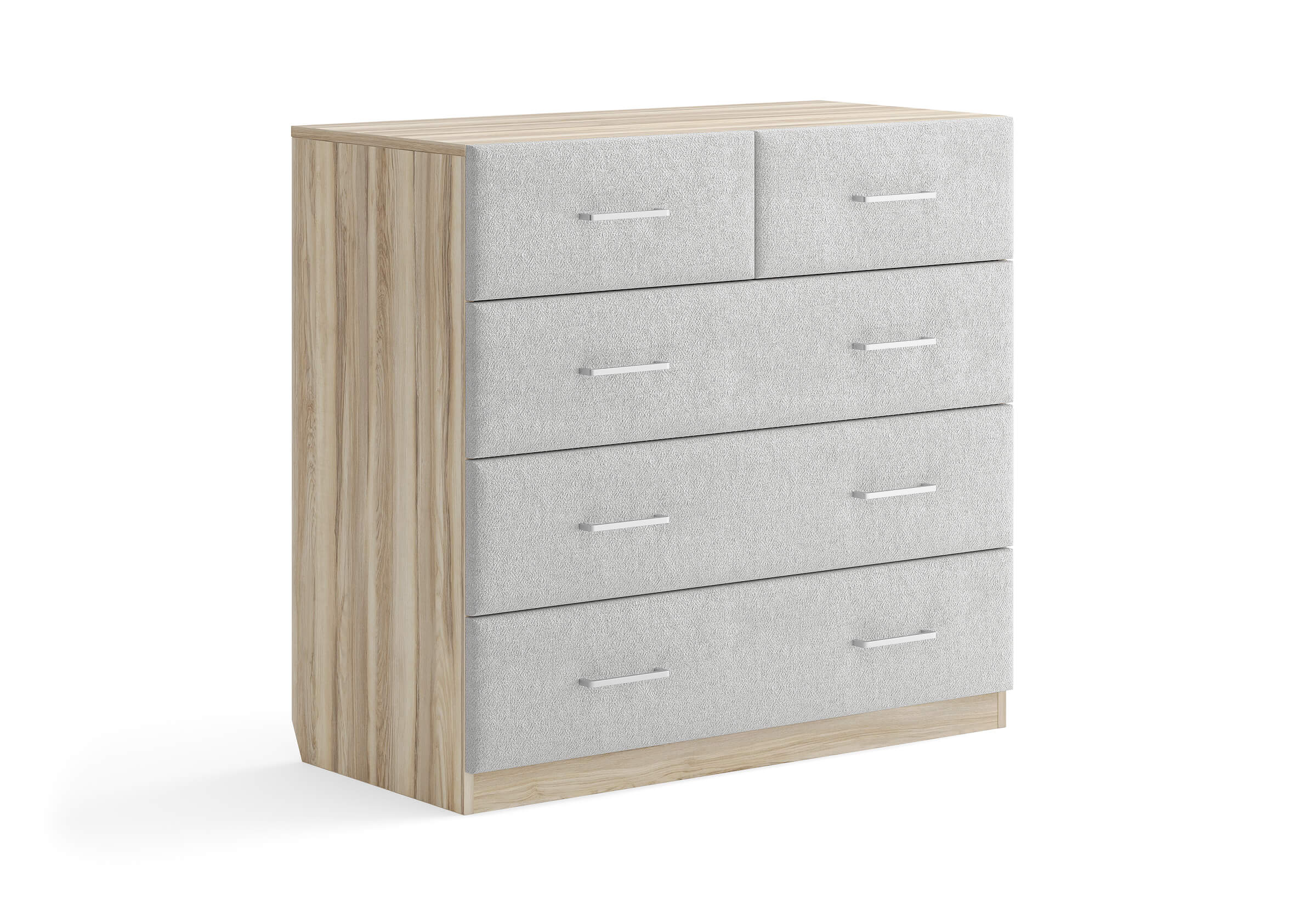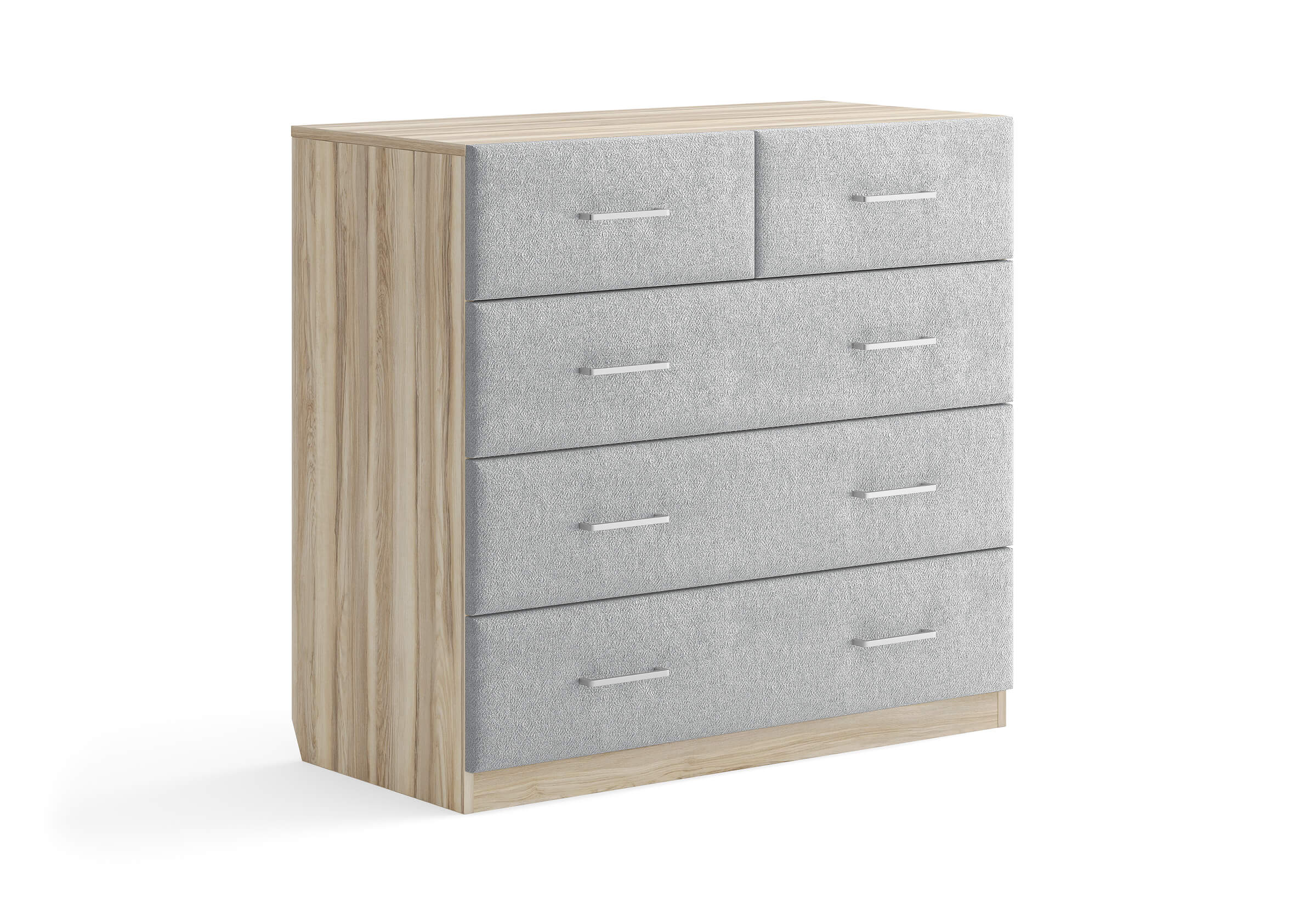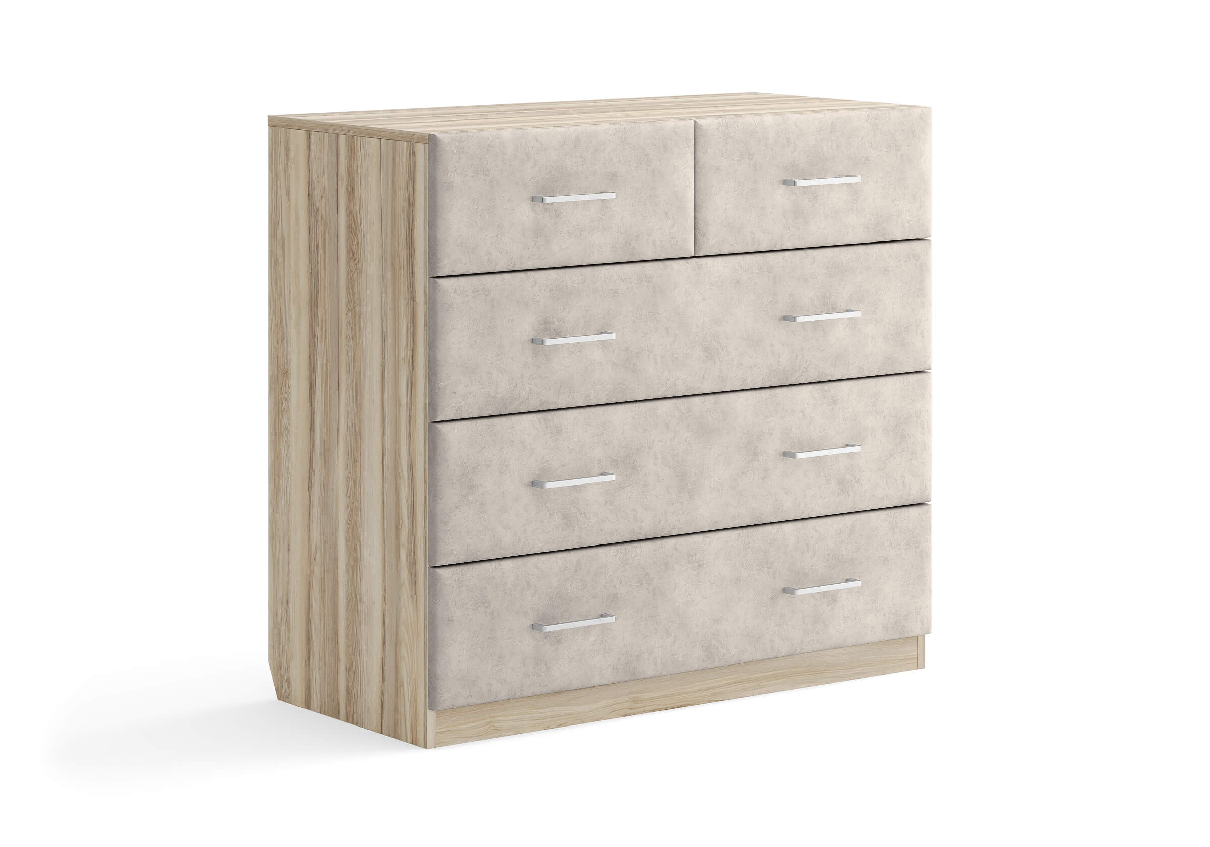Комбинированный комод Tomas с пятью вместительными ящиками станет элегантным дополнением интерьера. Корпус, выполненный из высококачественной ЛДСП, гарантирует прочность и долговечность, а мягкие фасады в ткани и изящные металлические ручки добавят уют. Комод имеет скос под плинтус, это позволяет устанавливать его вплотную к стене. Благодаря своему дизайну и широкому выбору вариантов исполнения комод можно разместить не только в спальне, но и в прихожей или гостиной.