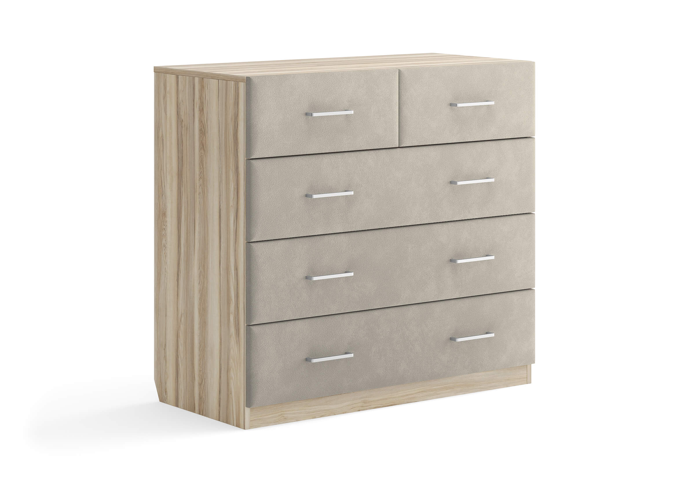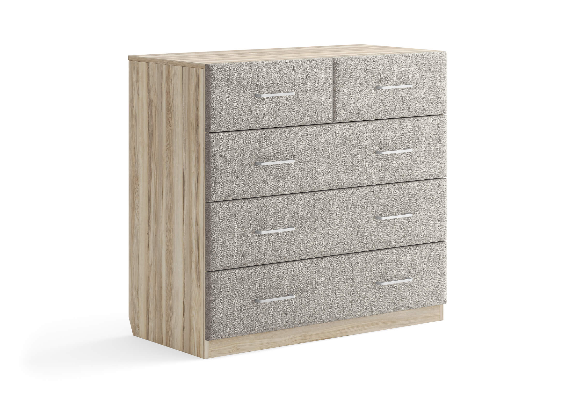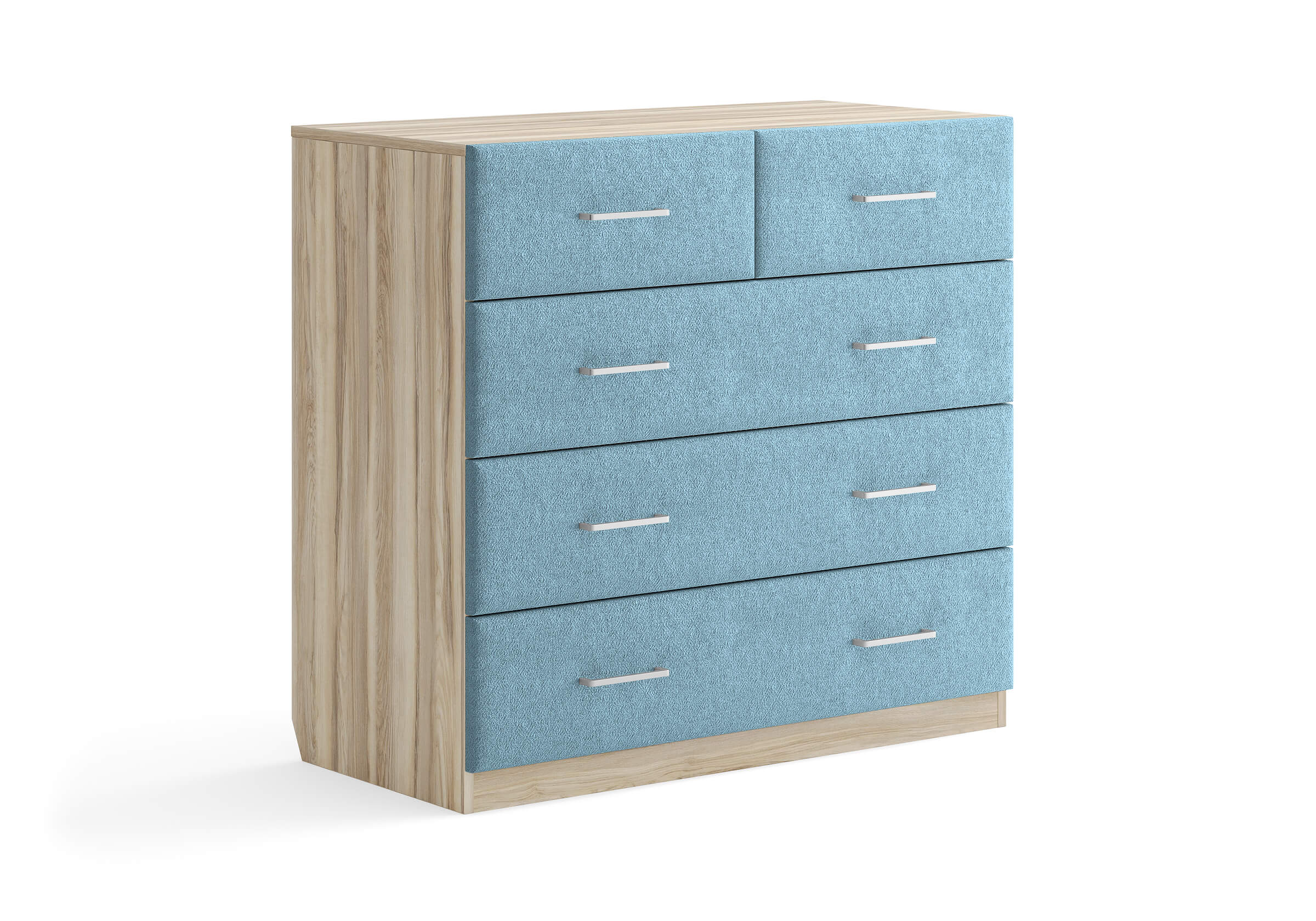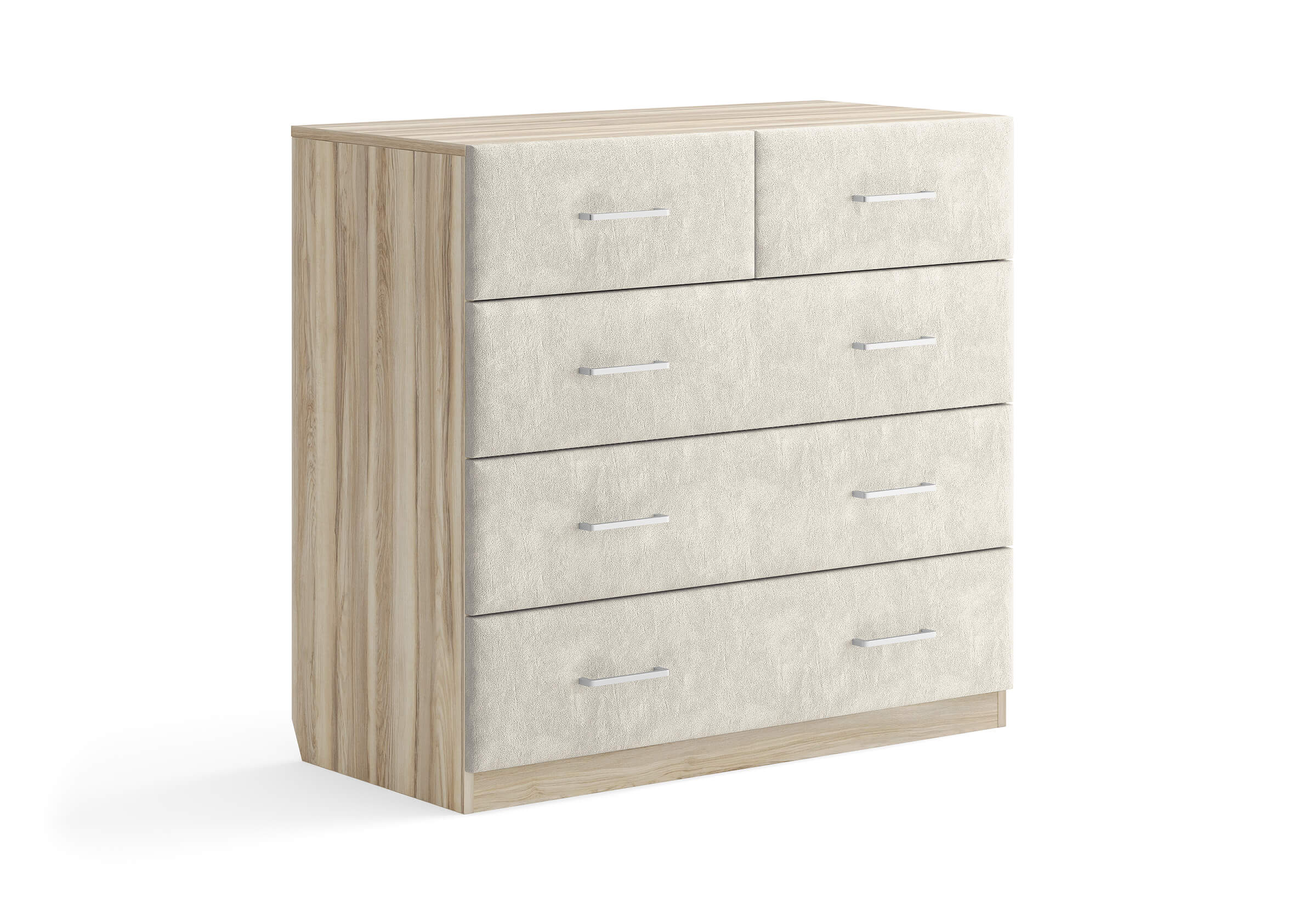 Комбинированный комод Tomas с пятью вместительными ящиками станет элегантным дополнением интерьера. Корпус, выполненный из высококачественной ЛДСП, гарантирует прочность и долговечность, а мягкие фасады в ткани и изящные металлические ручки добавят уют. Комод имеет скос под плинтус, это позволяет устанавливать его вплотную к стене. Благодаря своему дизайну и широкому выбору вариантов исполнения комод можно разместить не только в спальне, но и в прихожей или гостиной.