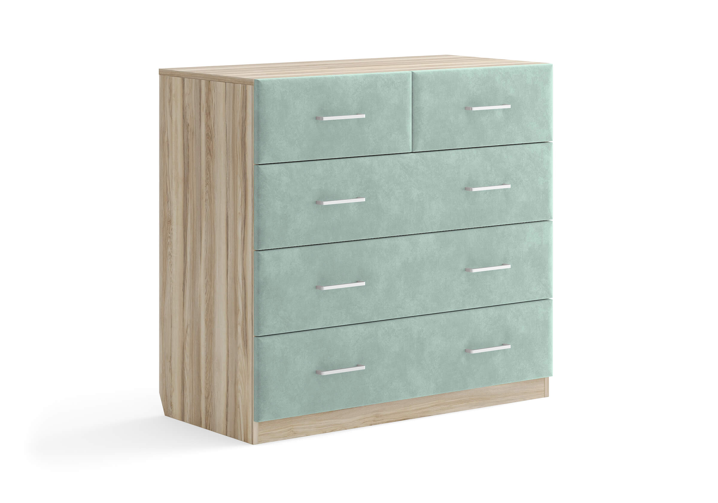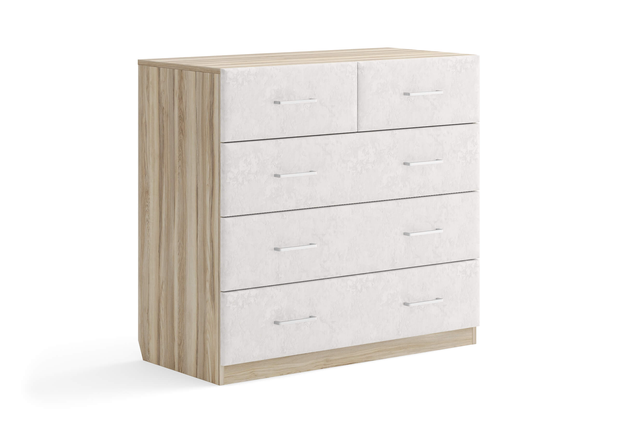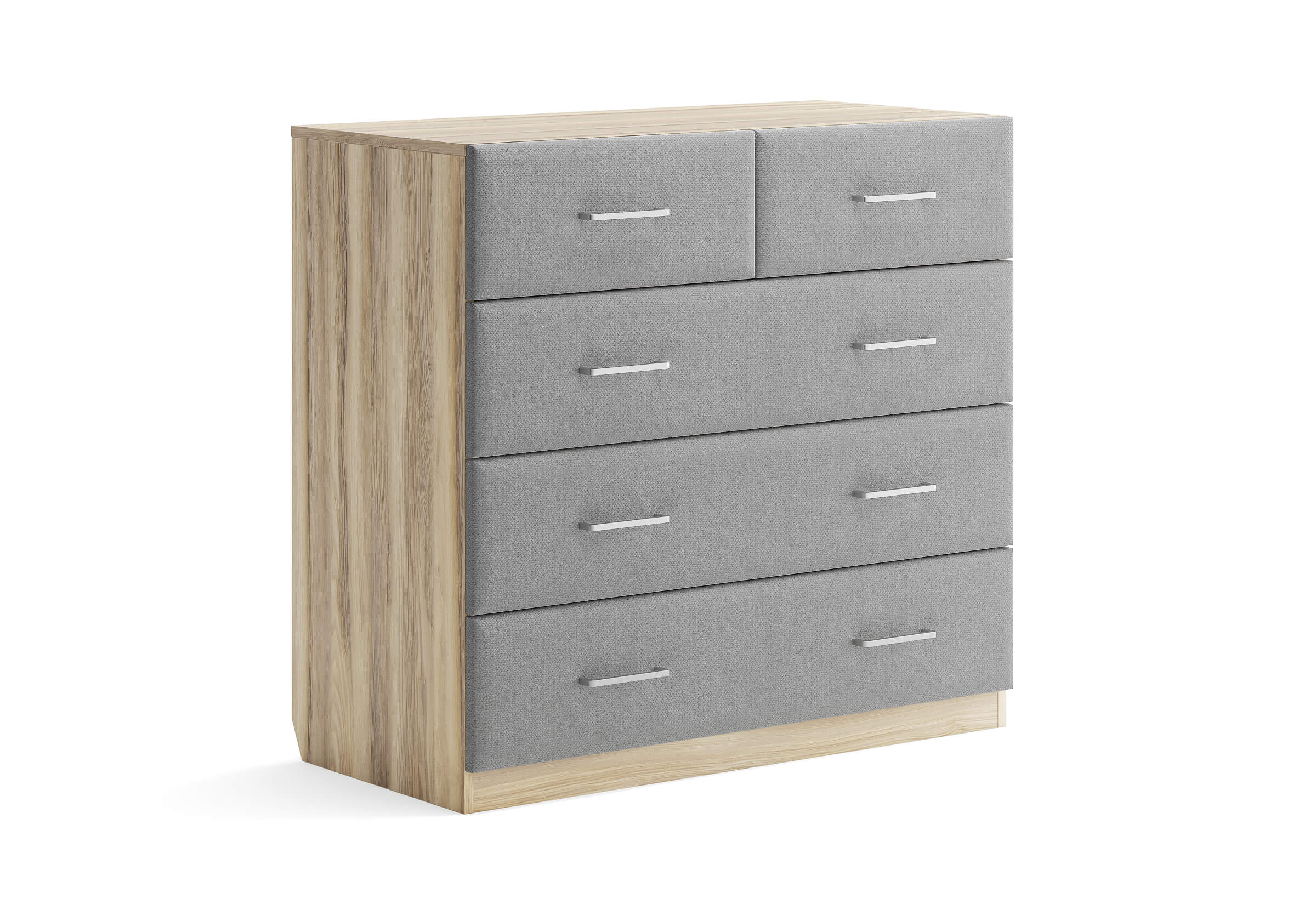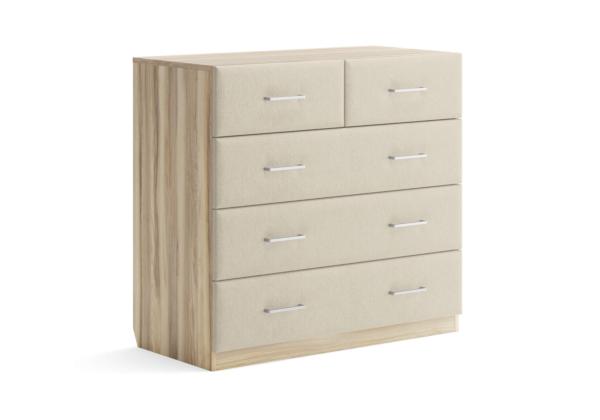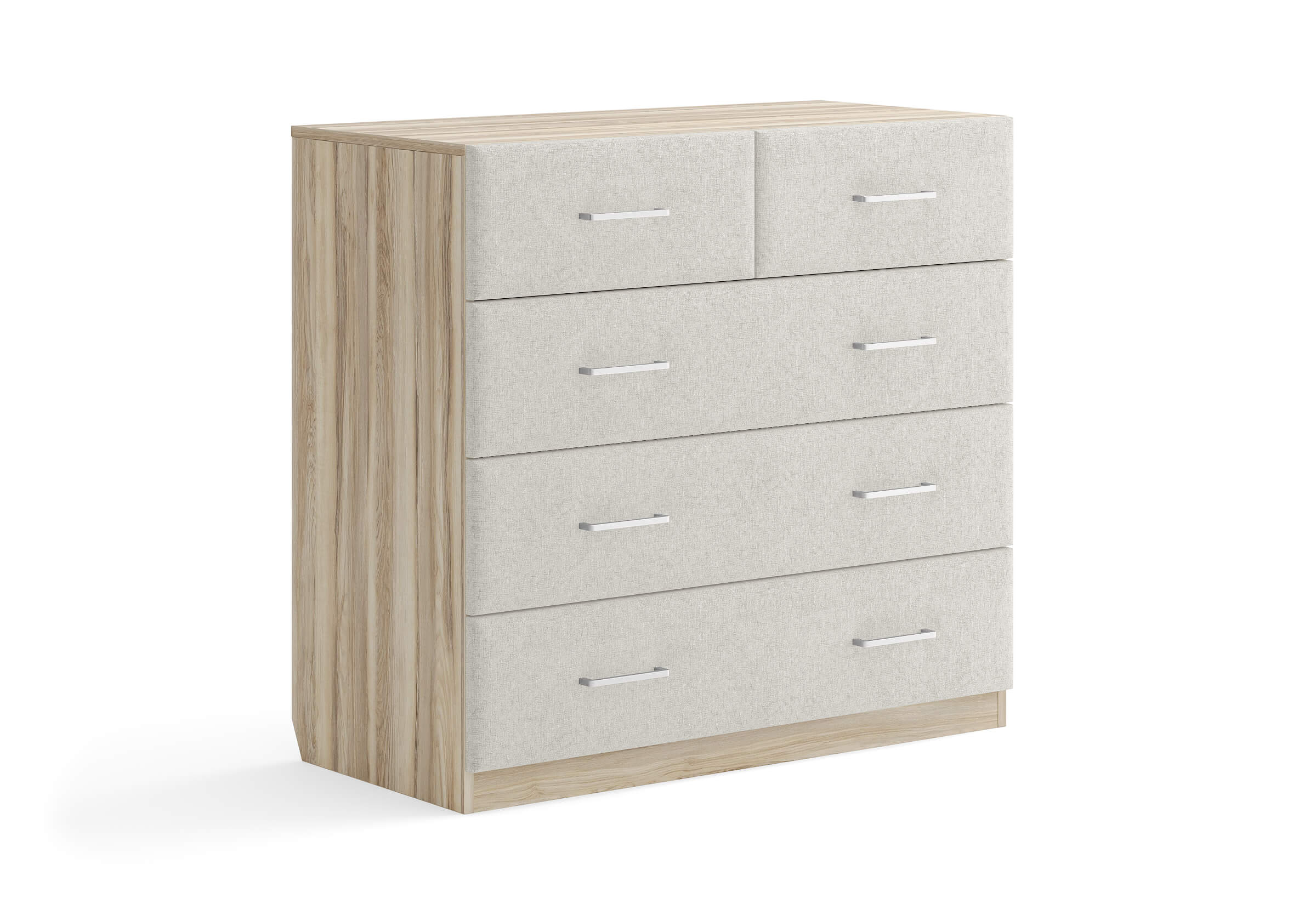 Комбинированный комод Tomas с пятью вместительными ящиками станет элегантным дополнением интерьера. Корпус, выполненный из высококачественной ЛДСП, гарантирует прочность и долговечность, а мягкие фасады в ткани и изящные металлические ручки добавят уют. Комод имеет скос под плинтус, это позволяет устанавливать его вплотную к стене. Благодаря своему дизайну и широкому выбору вариантов исполнения комод можно разместить не только в спальне, но и в прихожей или гостиной.