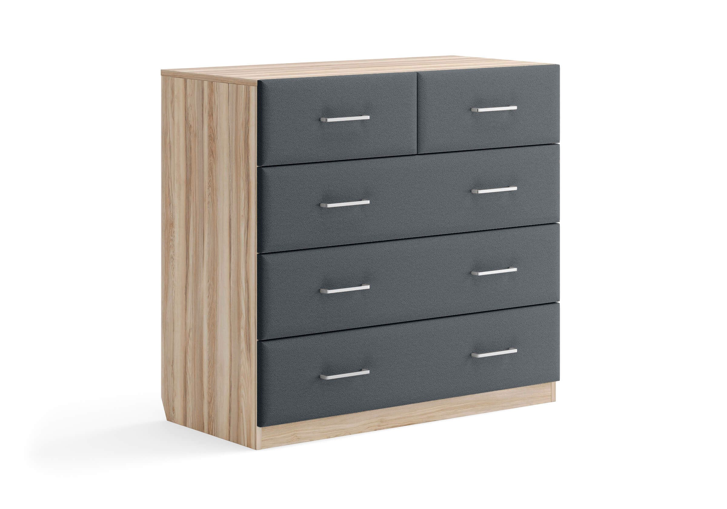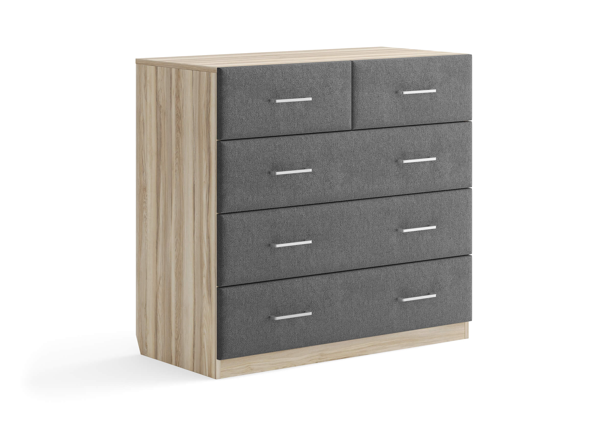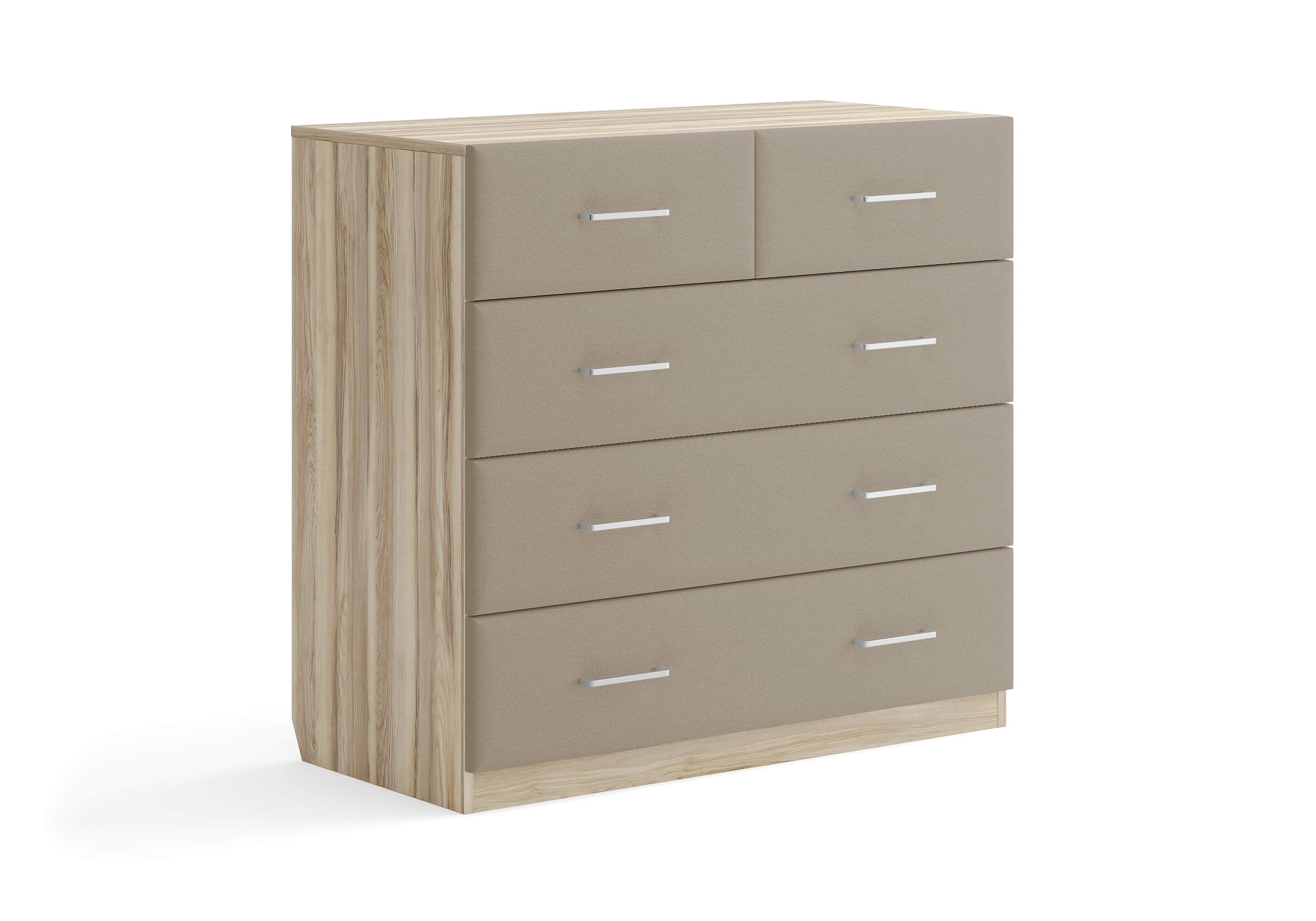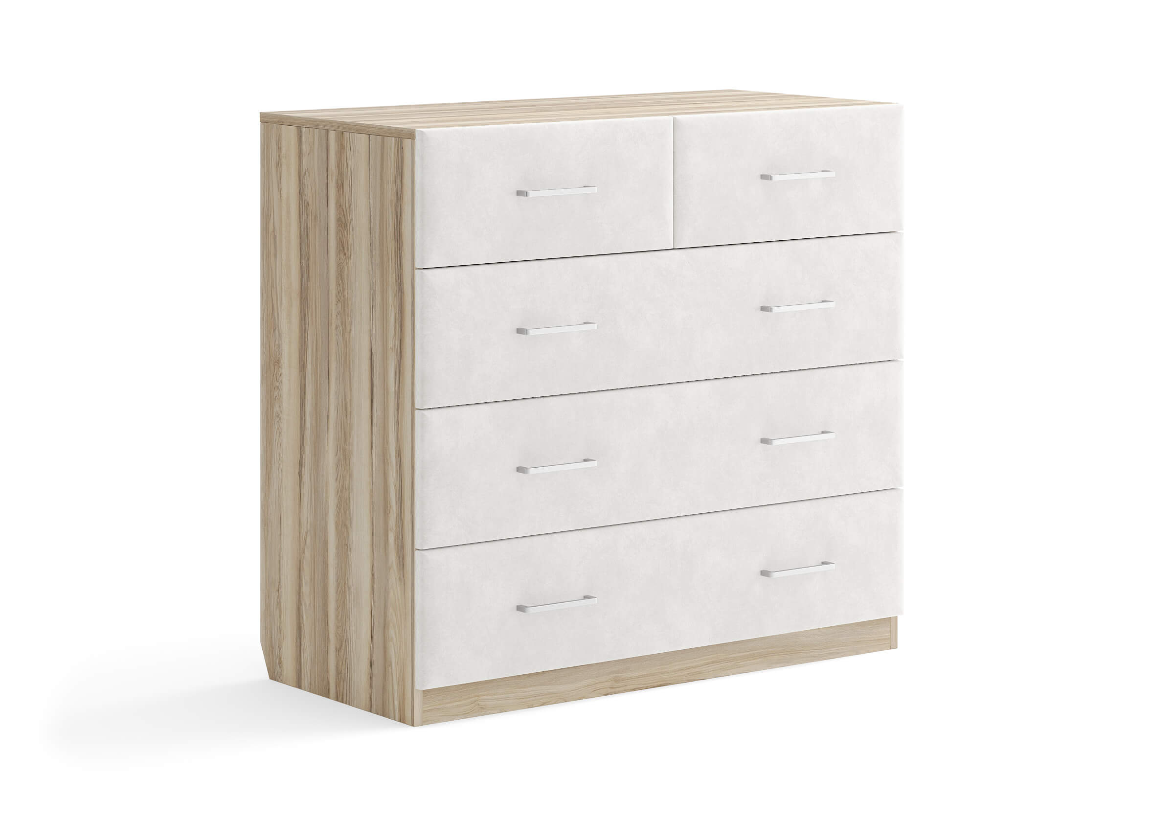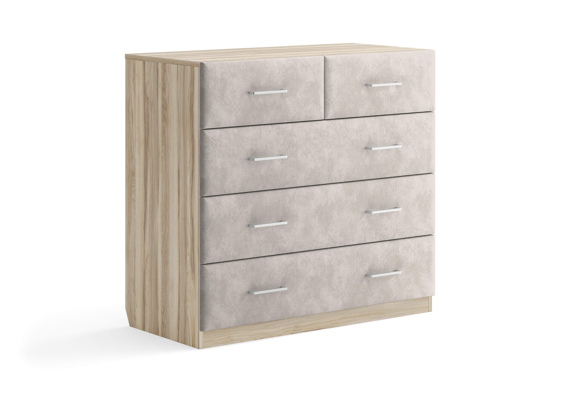Комбинированный комод Tomas с пятью вместительными ящиками станет элегантным дополнением интерьера. Корпус, выполненный из высококачественной ЛДСП, гарантирует прочность и долговечность, а мягкие фасады в ткани и изящные металлические ручки добавят уют. Комод имеет скос под плинтус, это позволяет устанавливать его вплотную к стене. Благодаря своему дизайну и широкому выбору вариантов исполнения комод можно разместить не только в спальне, но и в прихожей или гостиной.