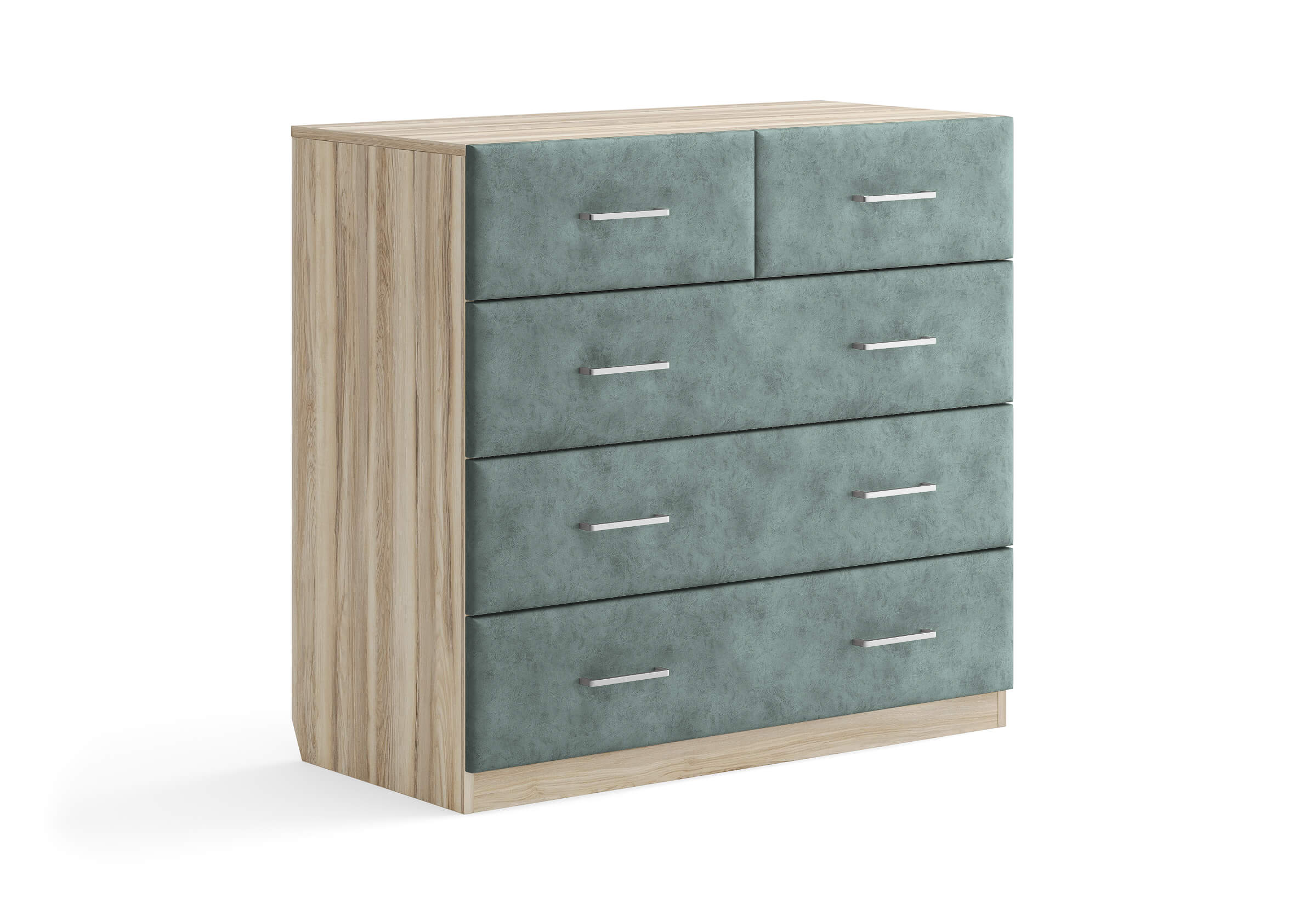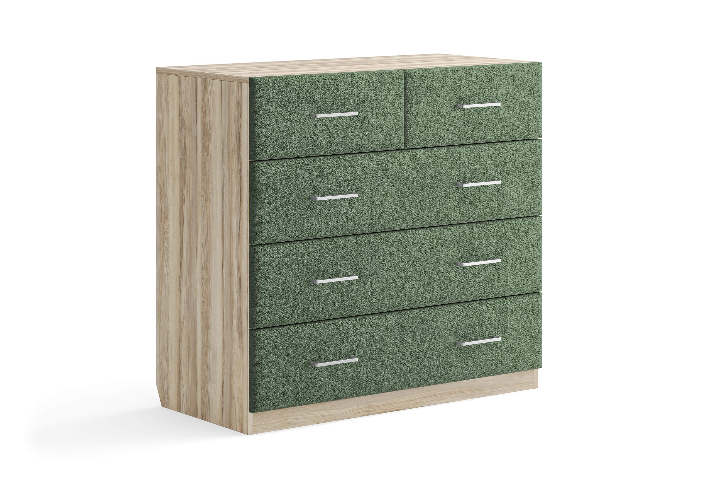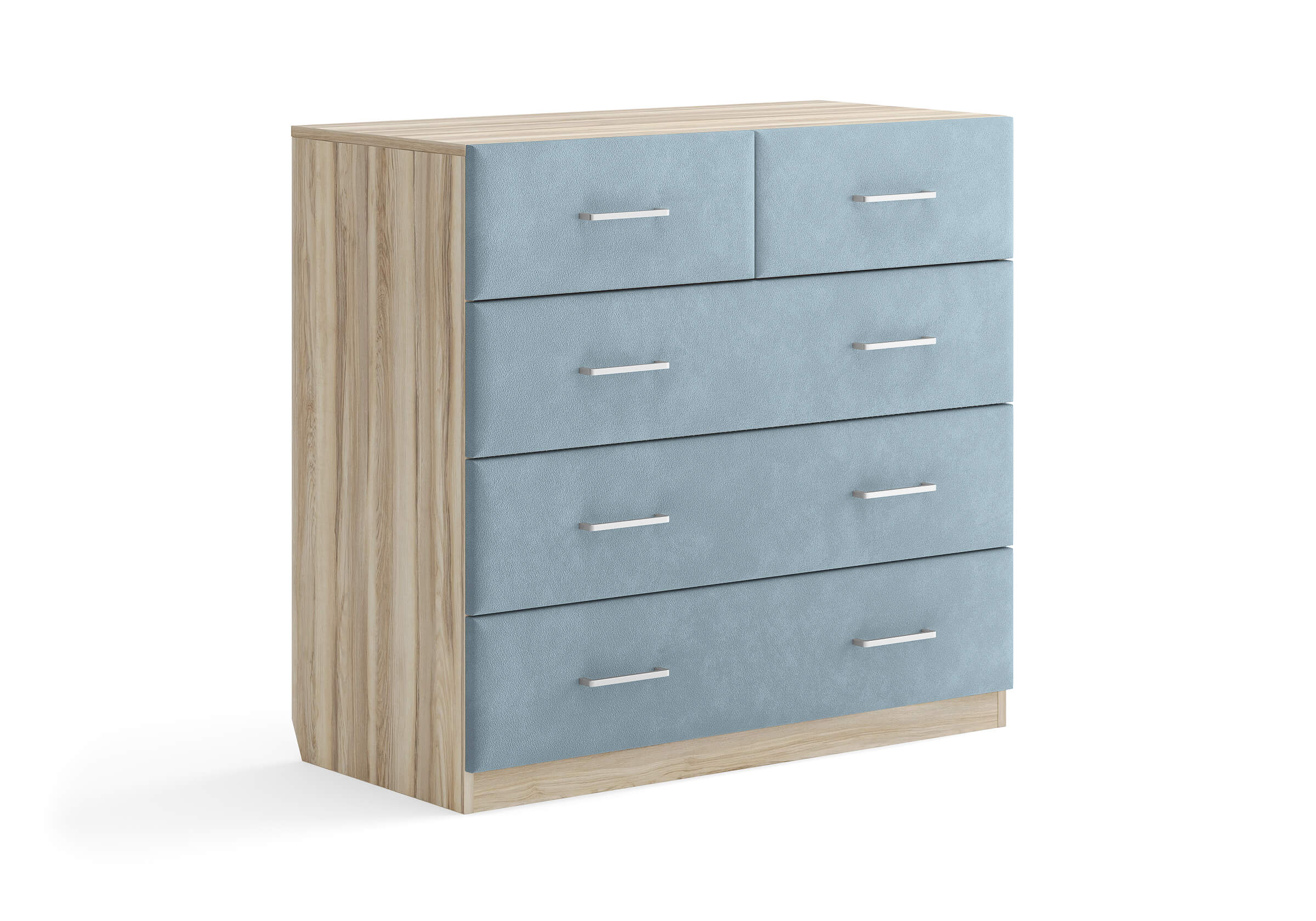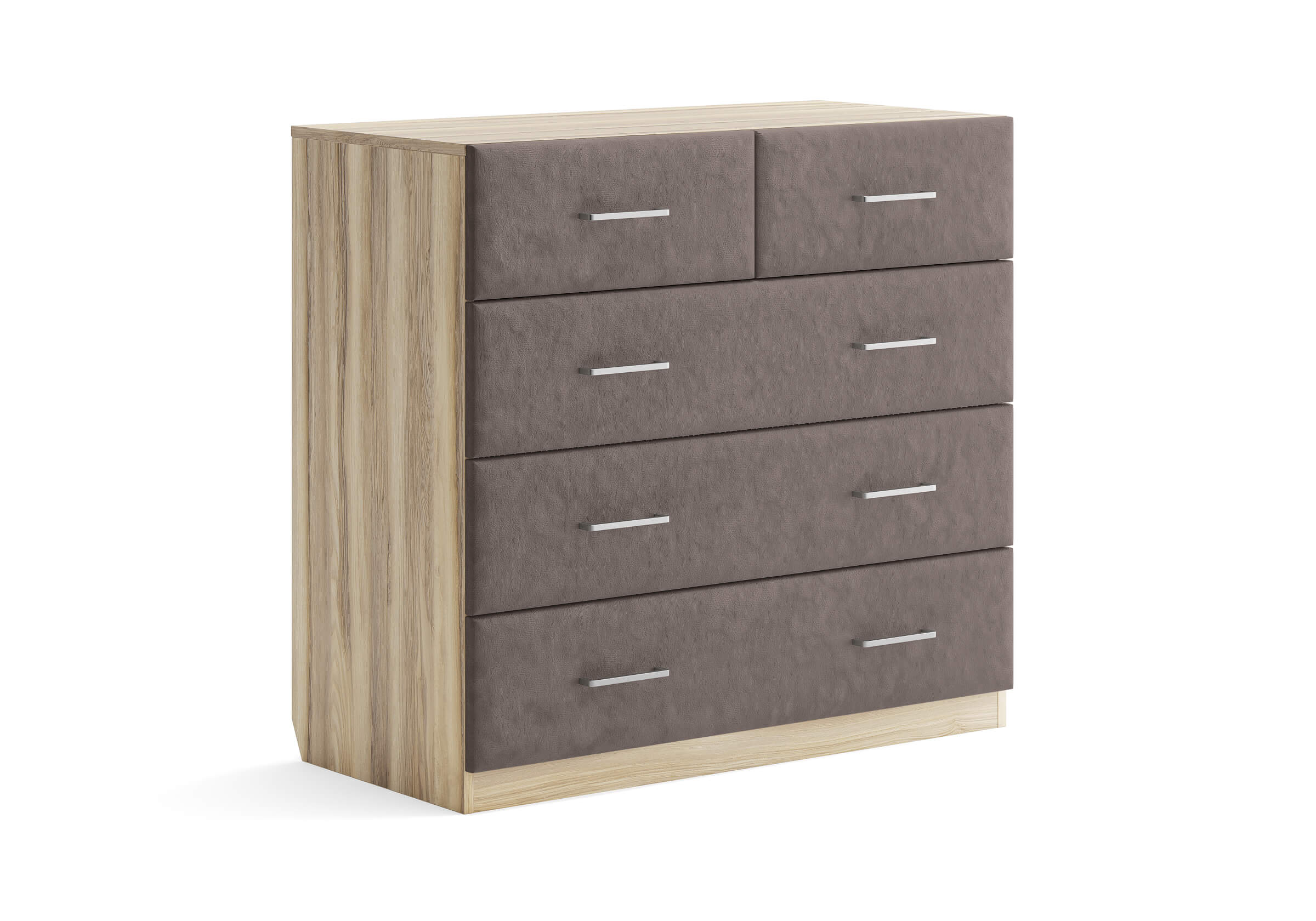 Комбинированный комод Tomas с пятью вместительными ящиками станет элегантным дополнением интерьера. Корпус, выполненный из высококачественной ЛДСП, гарантирует прочность и долговечность, а мягкие фасады в ткани и изящные металлические ручки добавят уют. Комод имеет скос под плинтус, это позволяет устанавливать его вплотную к стене. Благодаря своему дизайну и широкому выбору вариантов исполнения комод можно разместить не только в спальне, но и в прихожей или гостиной.