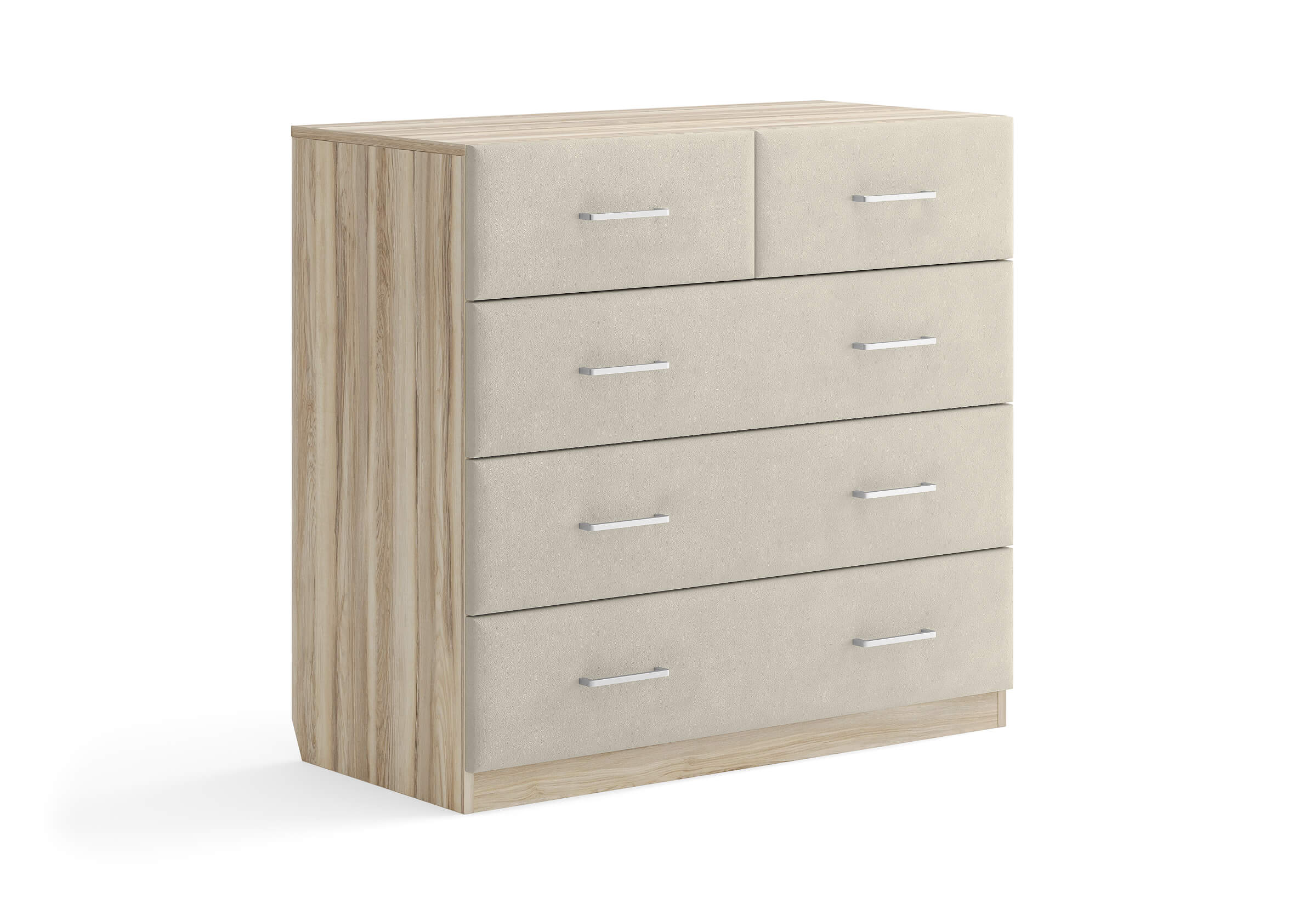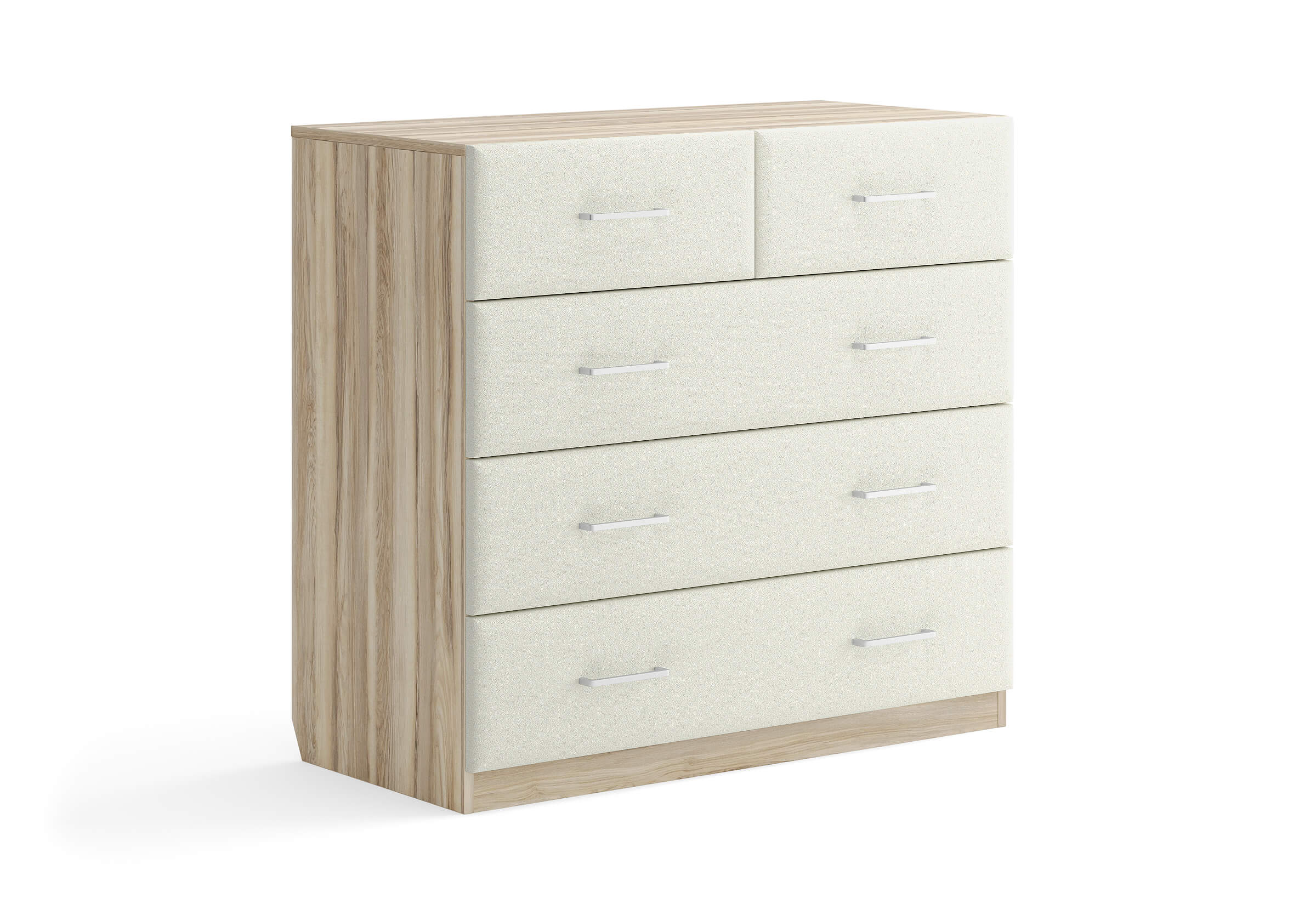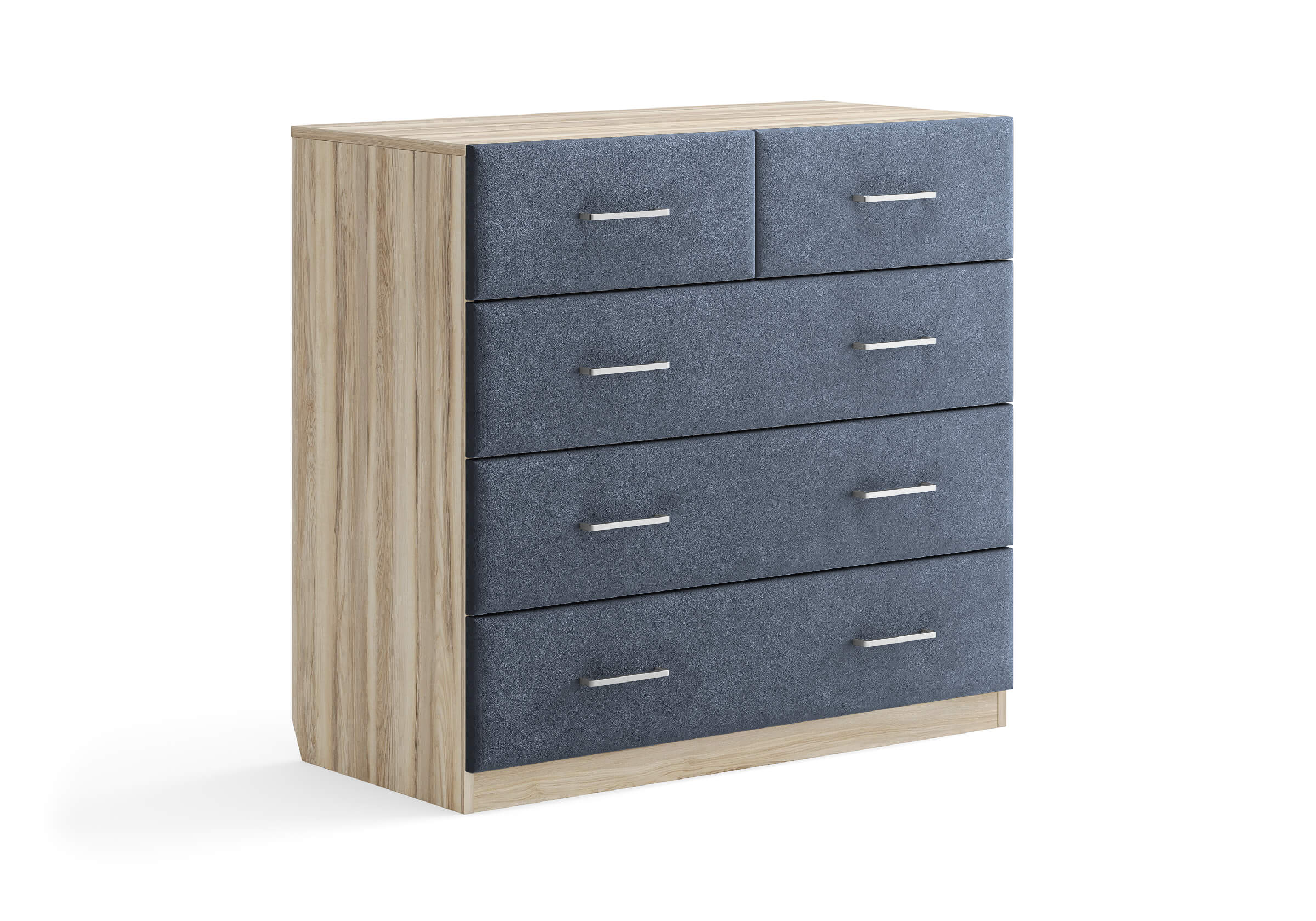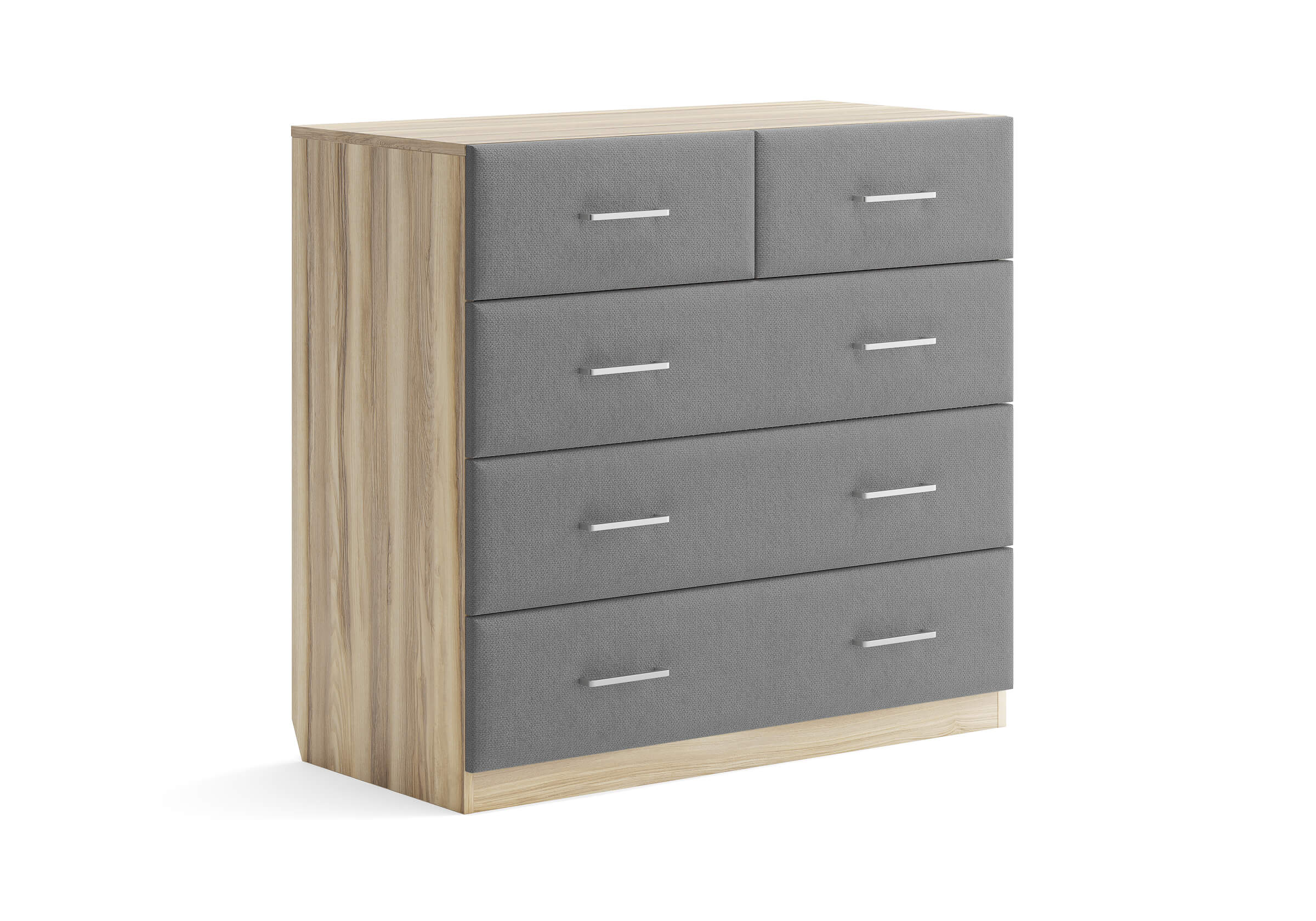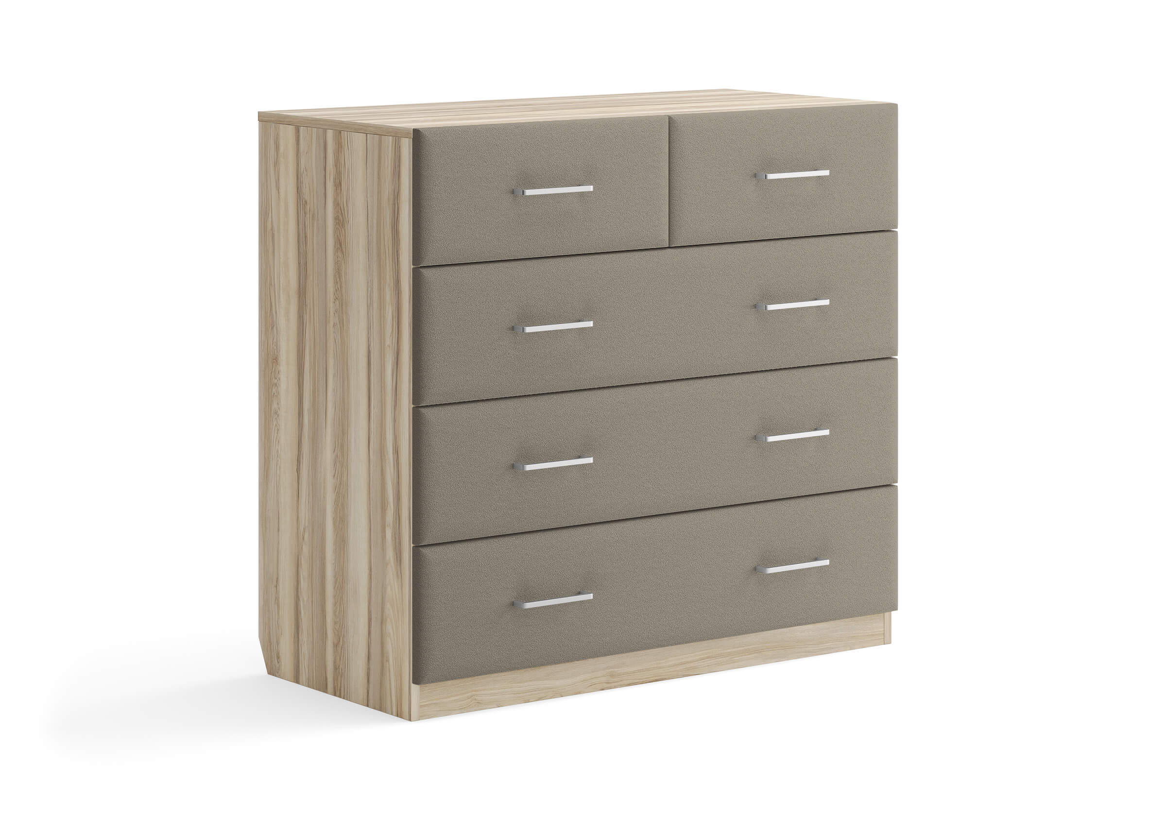 Комбинированный комод Tomas с пятью вместительными ящиками станет элегантным дополнением интерьера. Корпус, выполненный из высококачественной ЛДСП, гарантирует прочность и долговечность, а мягкие фасады в ткани и изящные металлические ручки добавят уют. Комод имеет скос под плинтус, это позволяет устанавливать его вплотную к стене. Благодаря своему дизайну и широкому выбору вариантов исполнения комод можно разместить не только в спальне, но и в прихожей или гостиной.