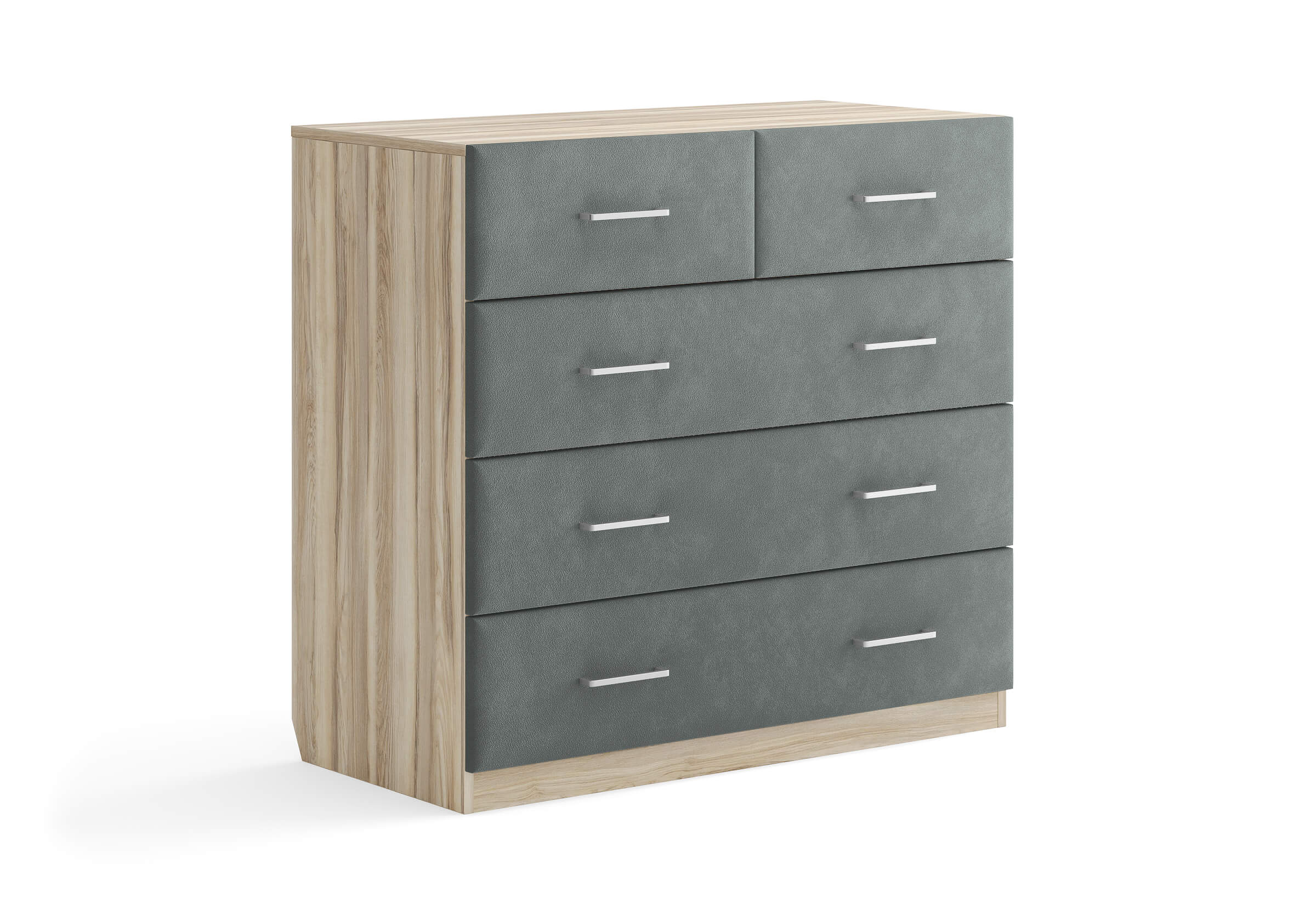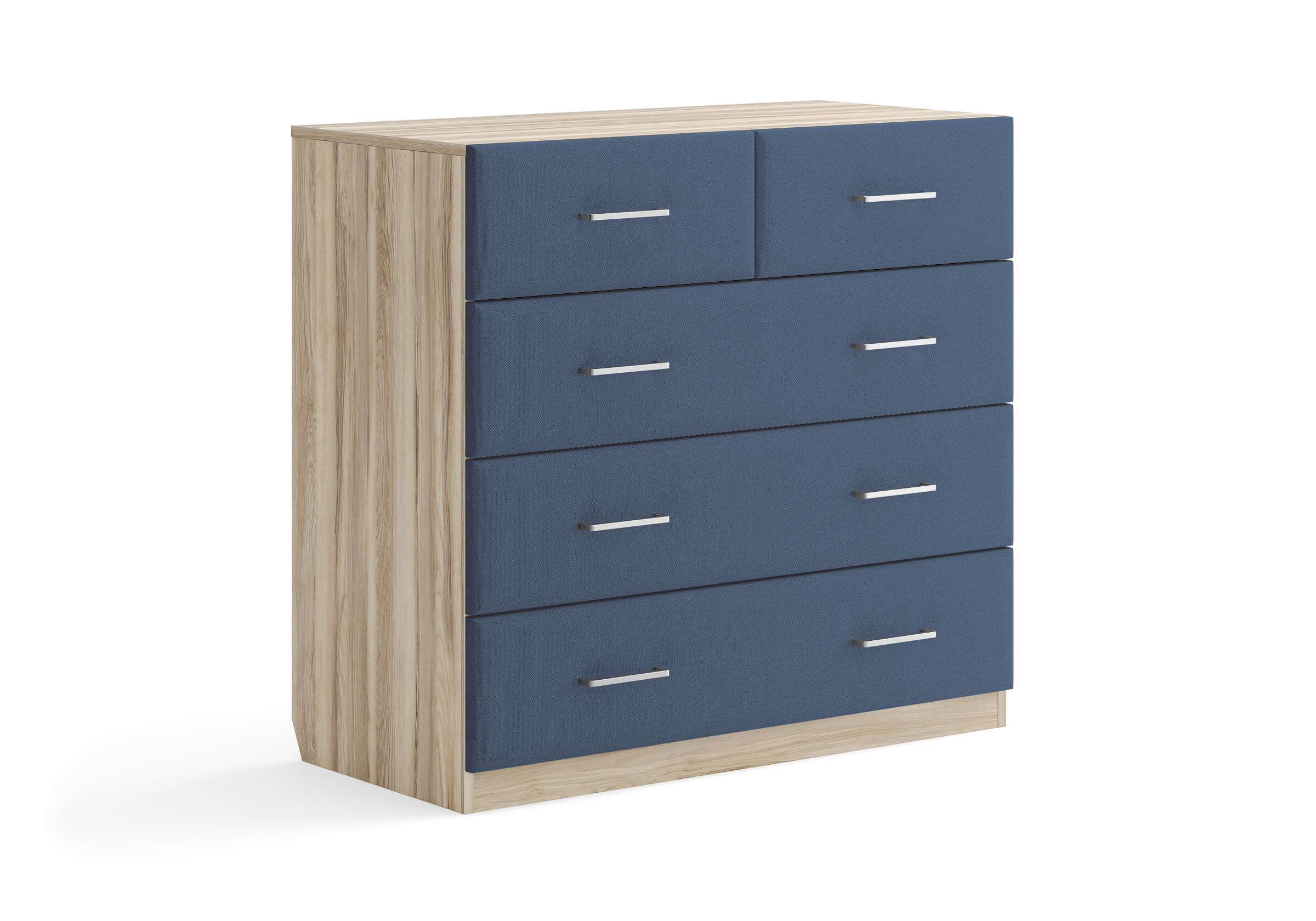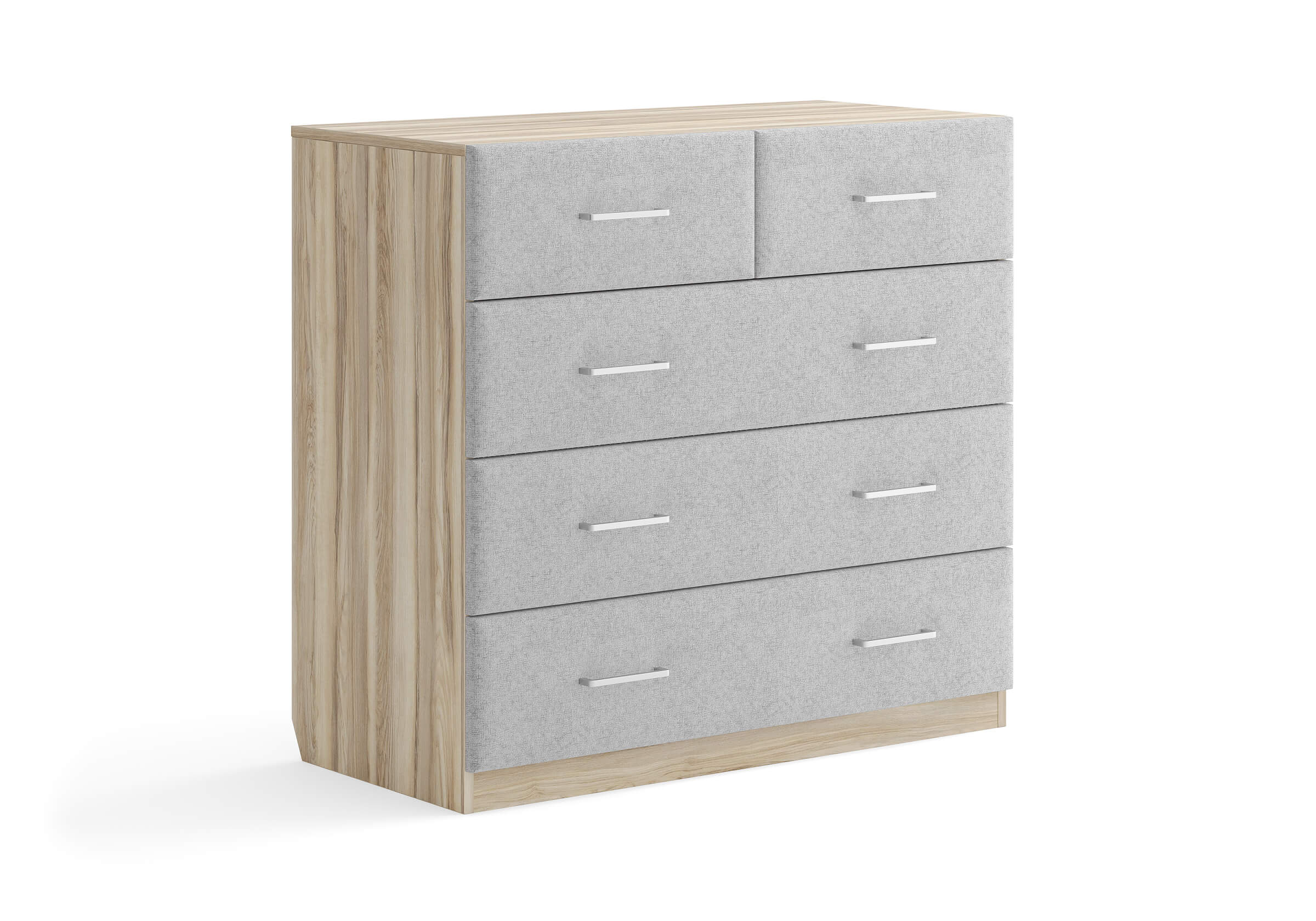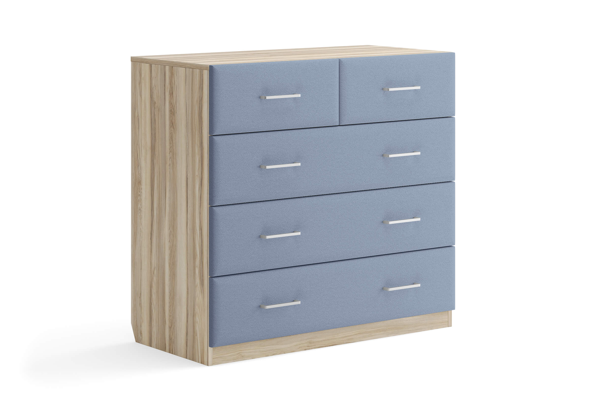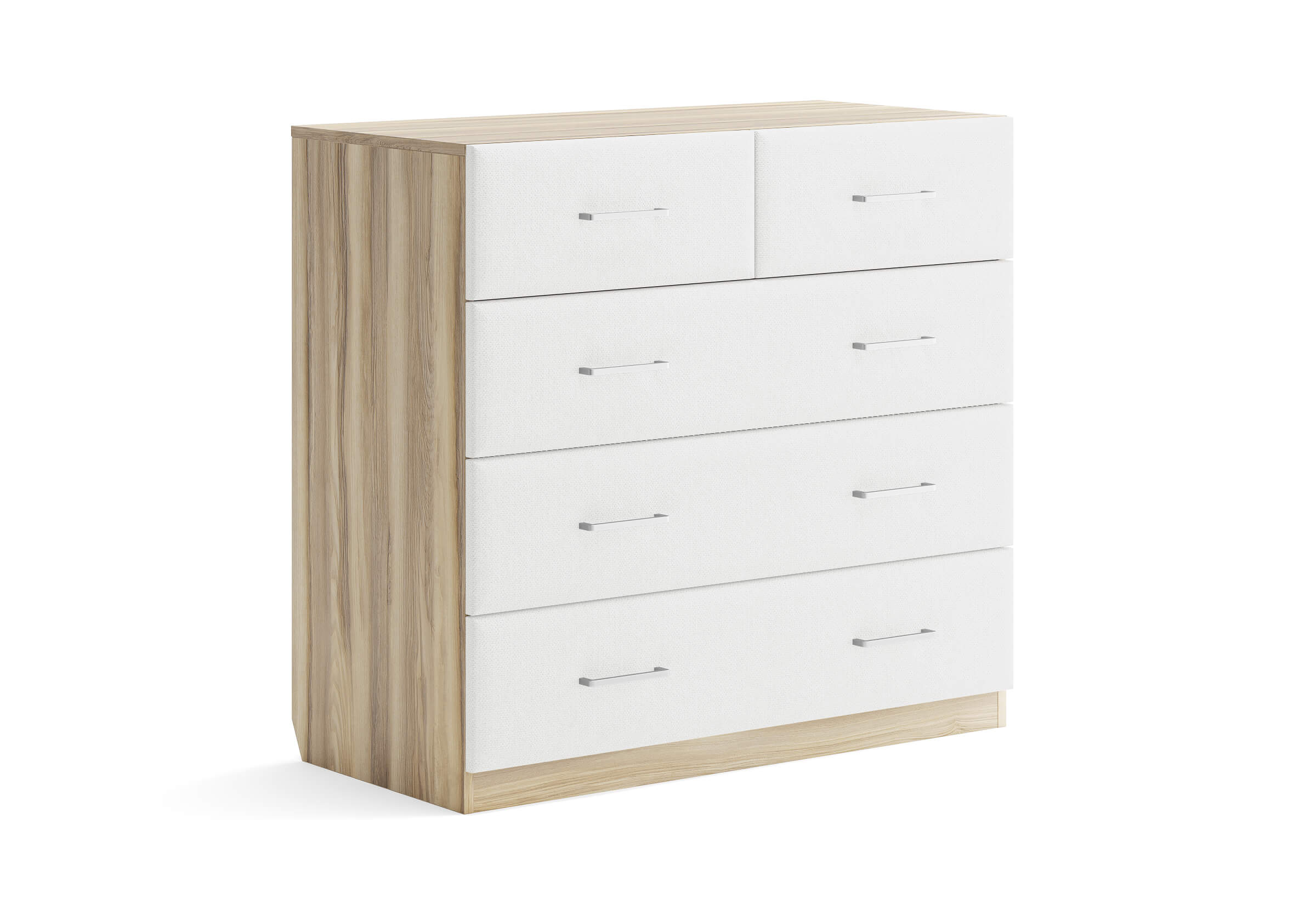 Комбинированный комод Tomas с пятью вместительными ящиками станет элегантным дополнением интерьера. Корпус, выполненный из высококачественной ЛДСП, гарантирует прочность и долговечность, а мягкие фасады в ткани и изящные металлические ручки добавят уют. Комод имеет скос под плинтус, это позволяет устанавливать его вплотную к стене. Благодаря своему дизайну и широкому выбору вариантов исполнения комод можно разместить не только в спальне, но и в прихожей или гостиной.