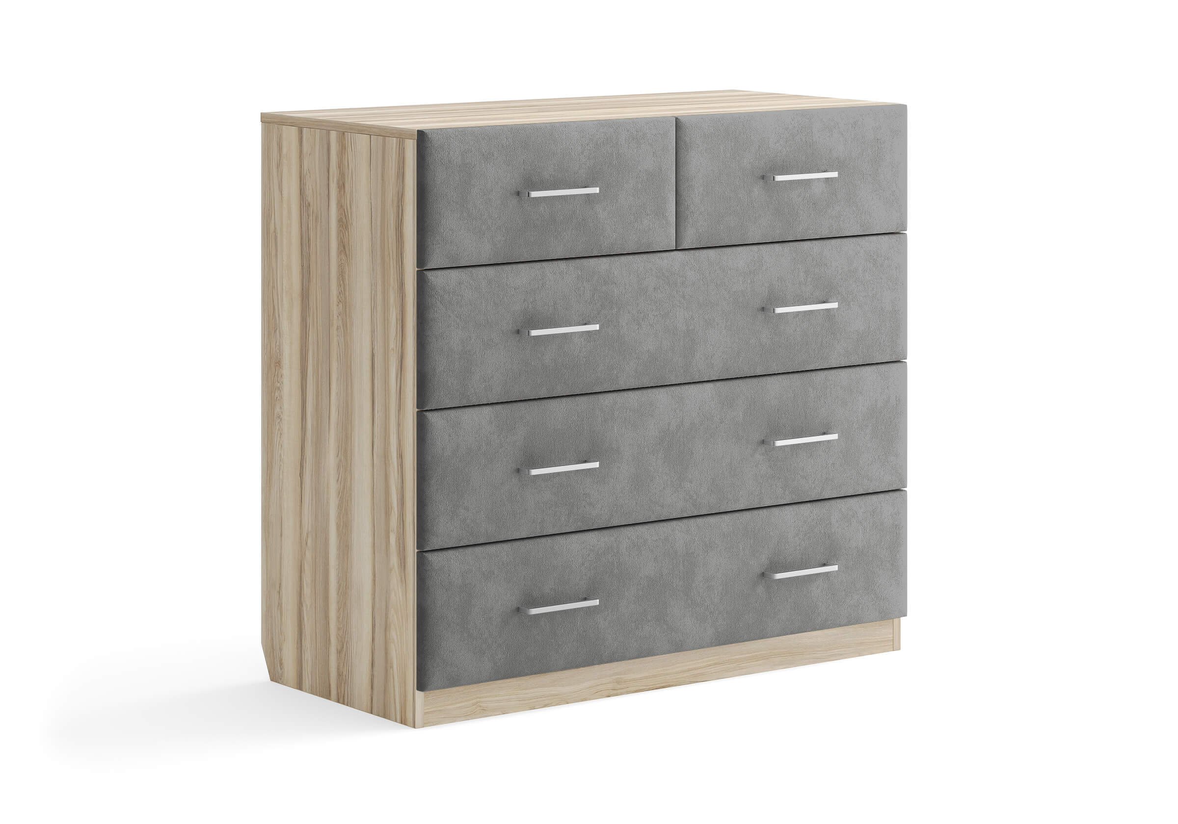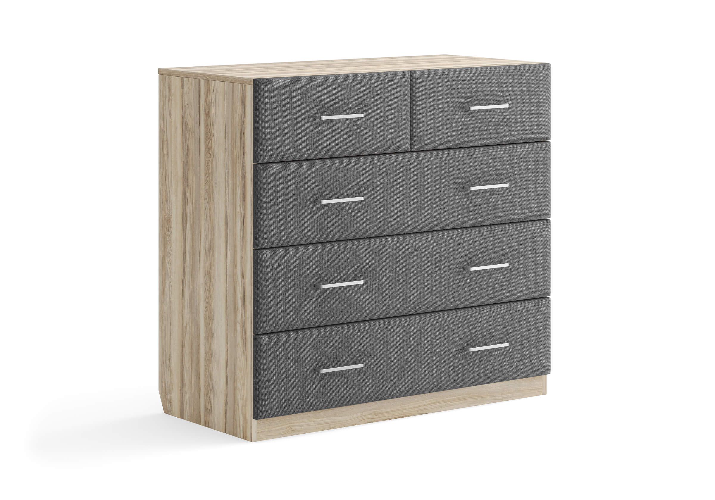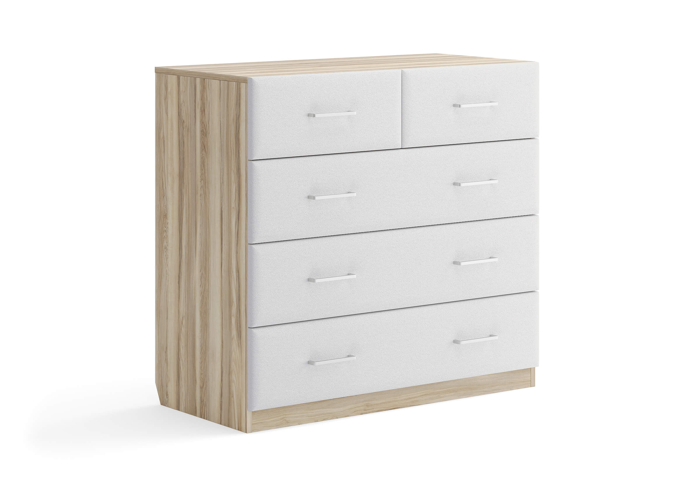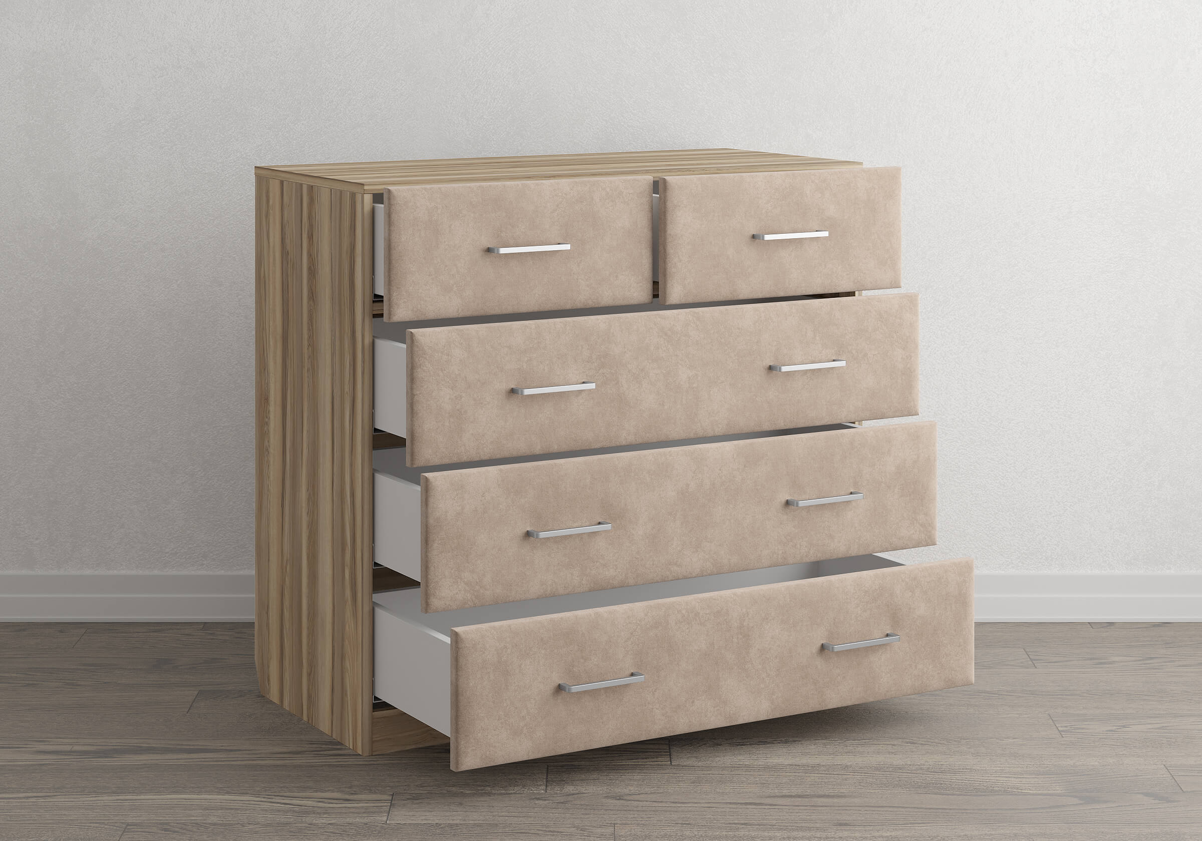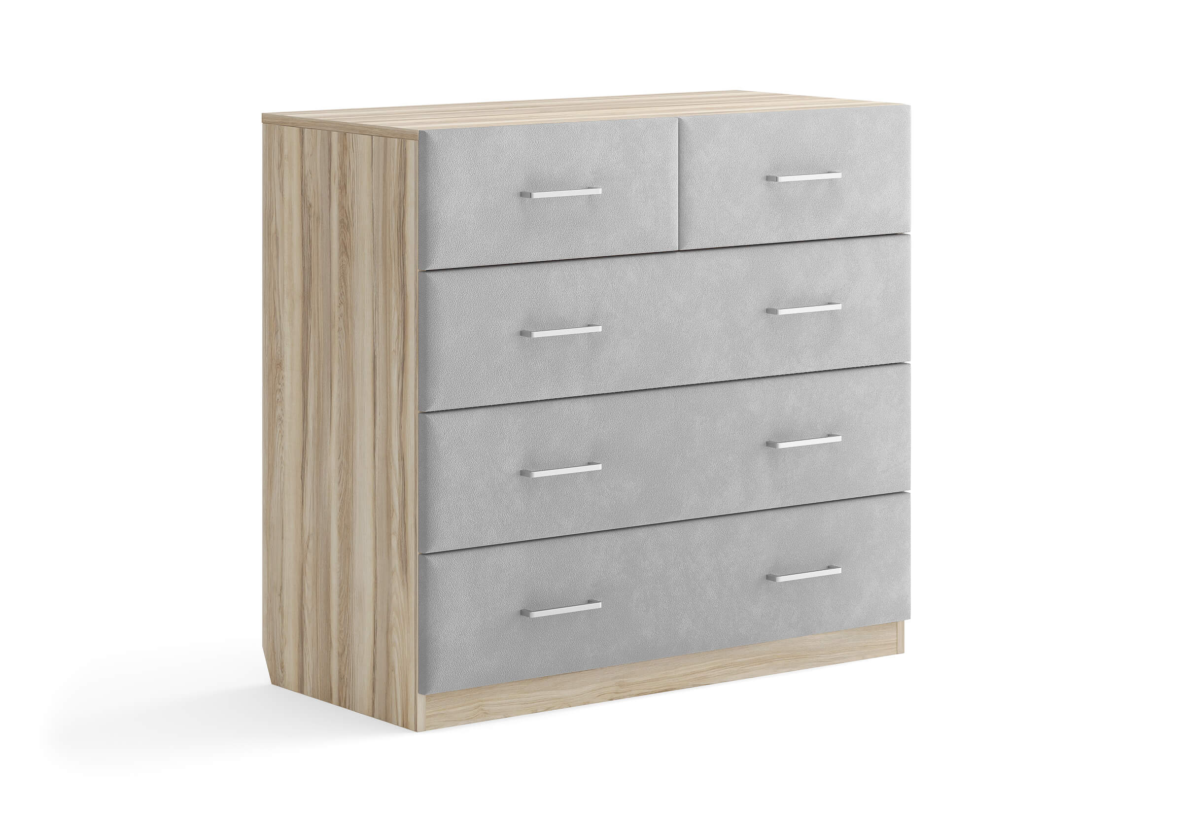 Комбинированный комод Tomas с пятью вместительными ящиками станет элегантным дополнением интерьера. Корпус, выполненный из высококачественной ЛДСП, гарантирует прочность и долговечность, а мягкие фасады в ткани и изящные металлические ручки добавят уют. Комод имеет скос под плинтус, это позволяет устанавливать его вплотную к стене. Благодаря своему дизайну и широкому выбору вариантов исполнения комод можно разместить не только в спальне, но и в прихожей или гостиной.