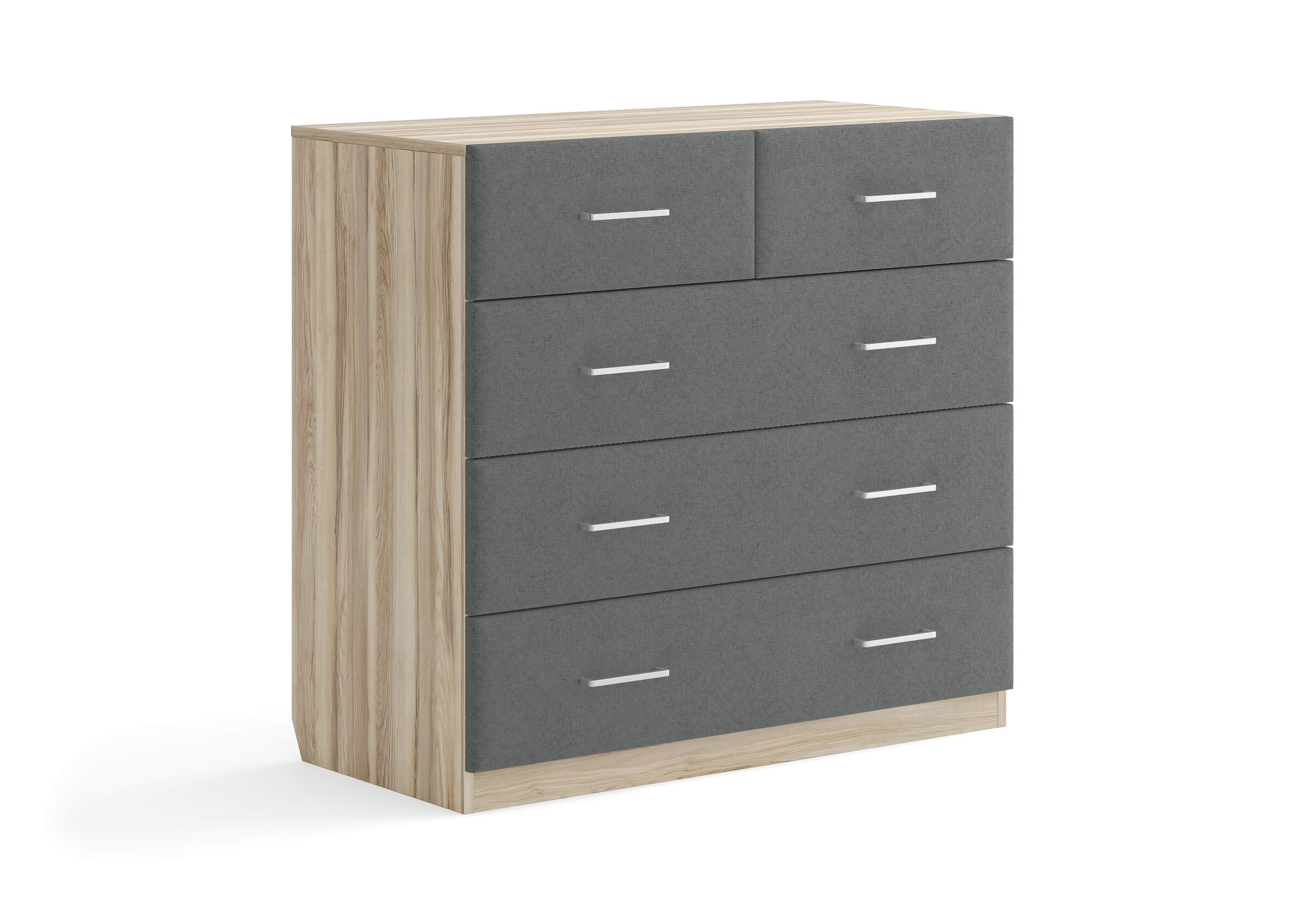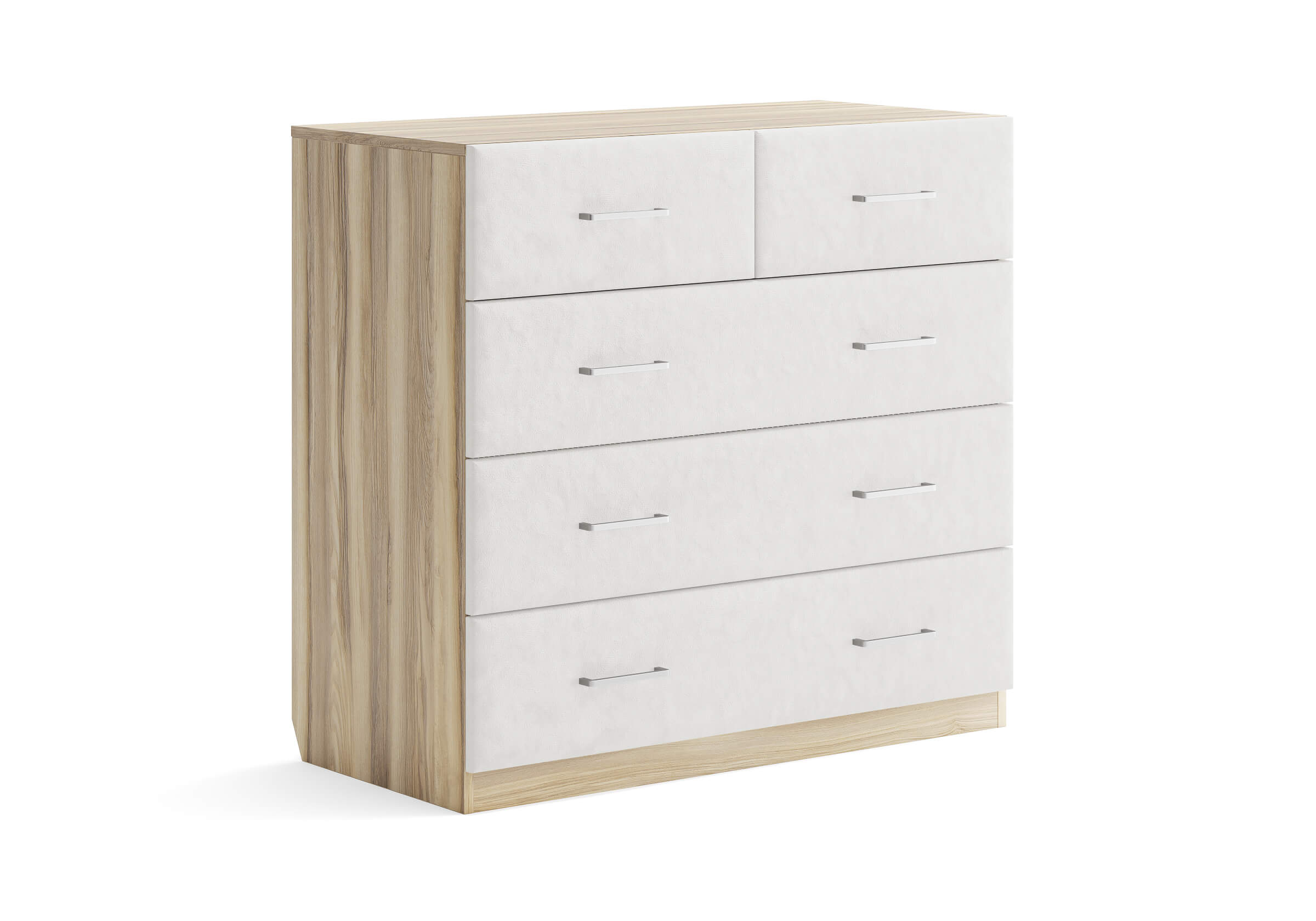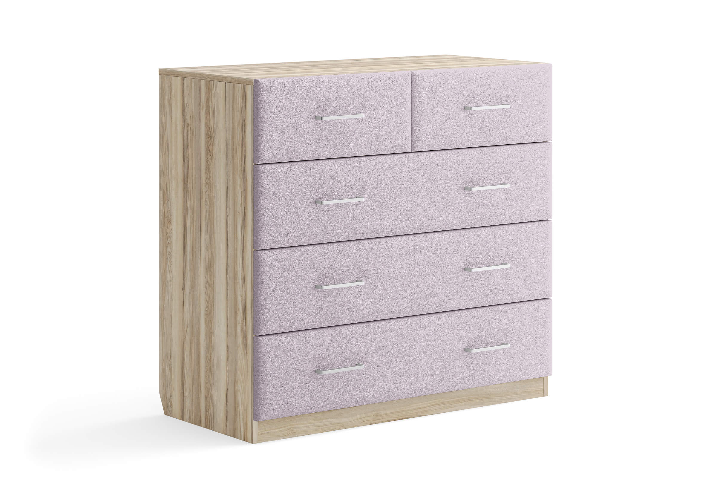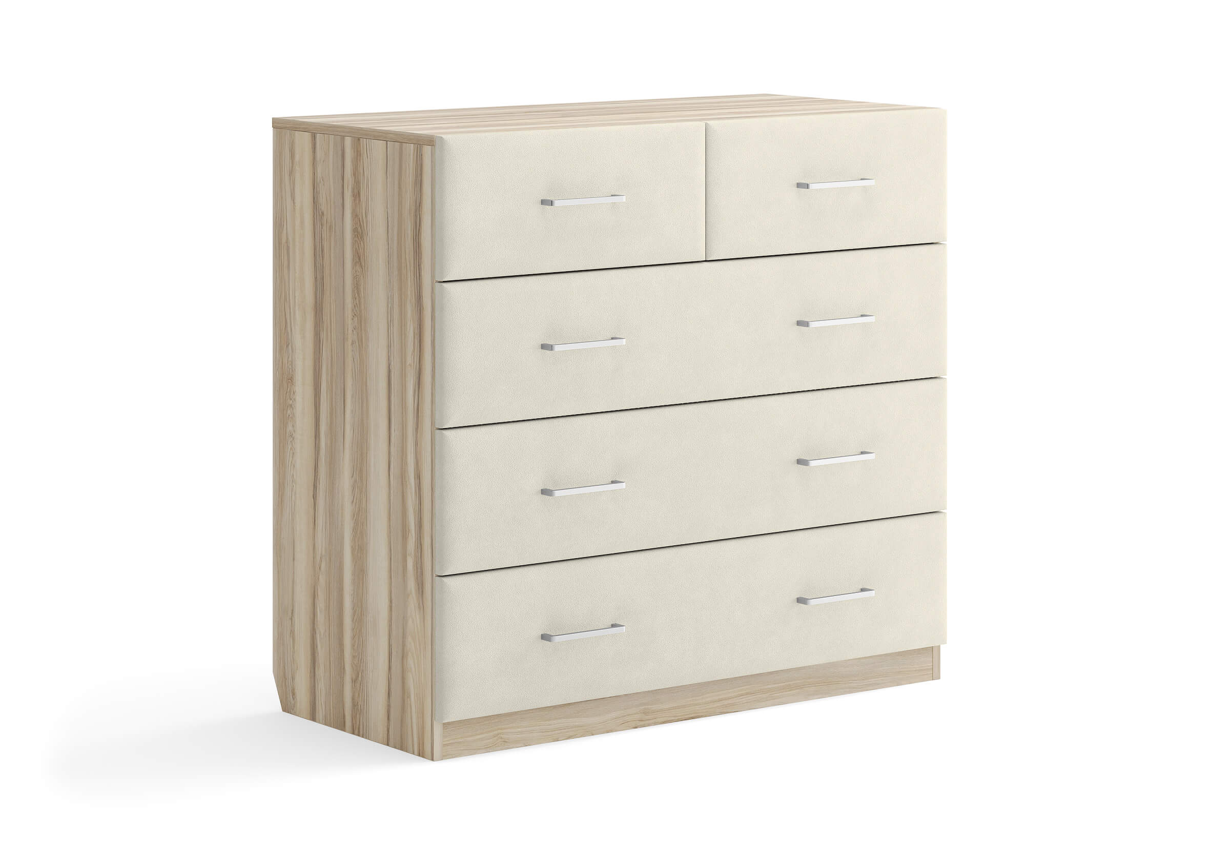 Комбинированный комод Tomas с пятью вместительными ящиками станет элегантным дополнением интерьера. Корпус, выполненный из высококачественной ЛДСП, гарантирует прочность и долговечность, а мягкие фасады в ткани и изящные металлические ручки добавят уют. Комод имеет скос под плинтус, это позволяет устанавливать его вплотную к стене. Благодаря своему дизайну и широкому выбору вариантов исполнения комод можно разместить не только в спальне, но и в прихожей или гостиной.