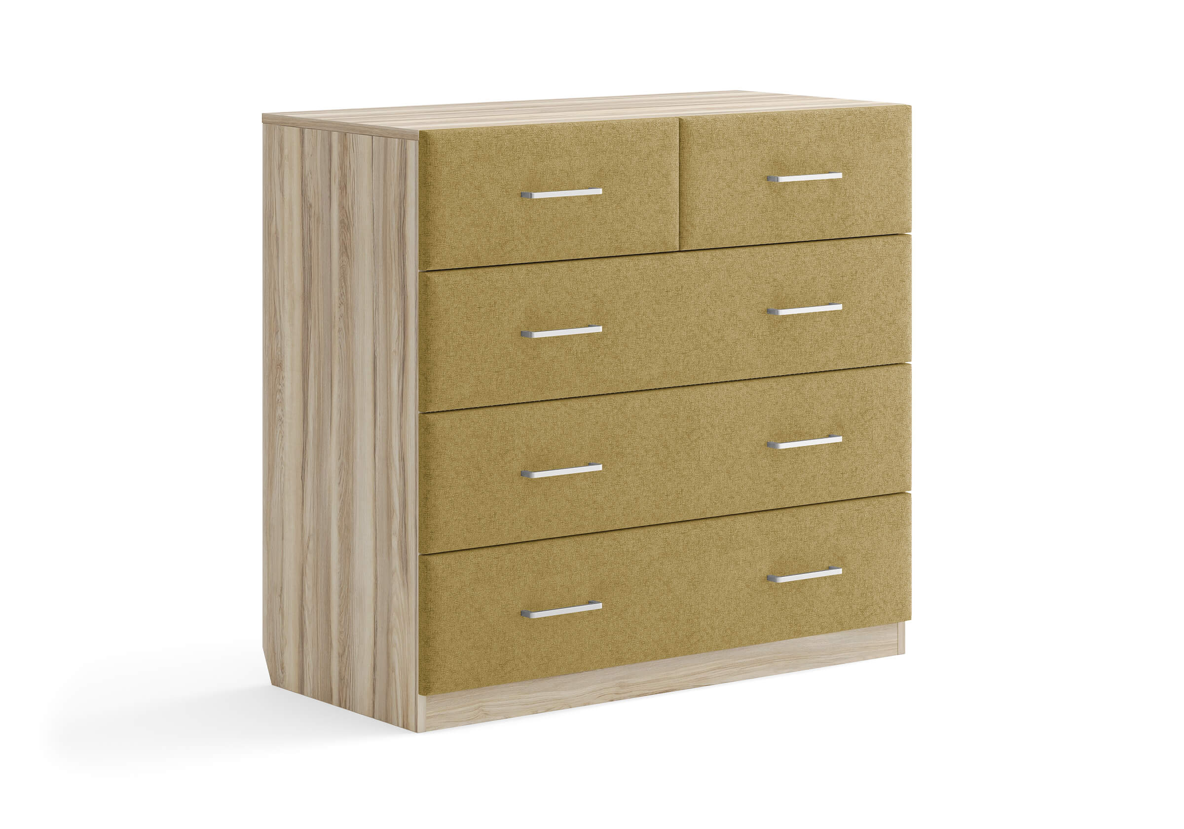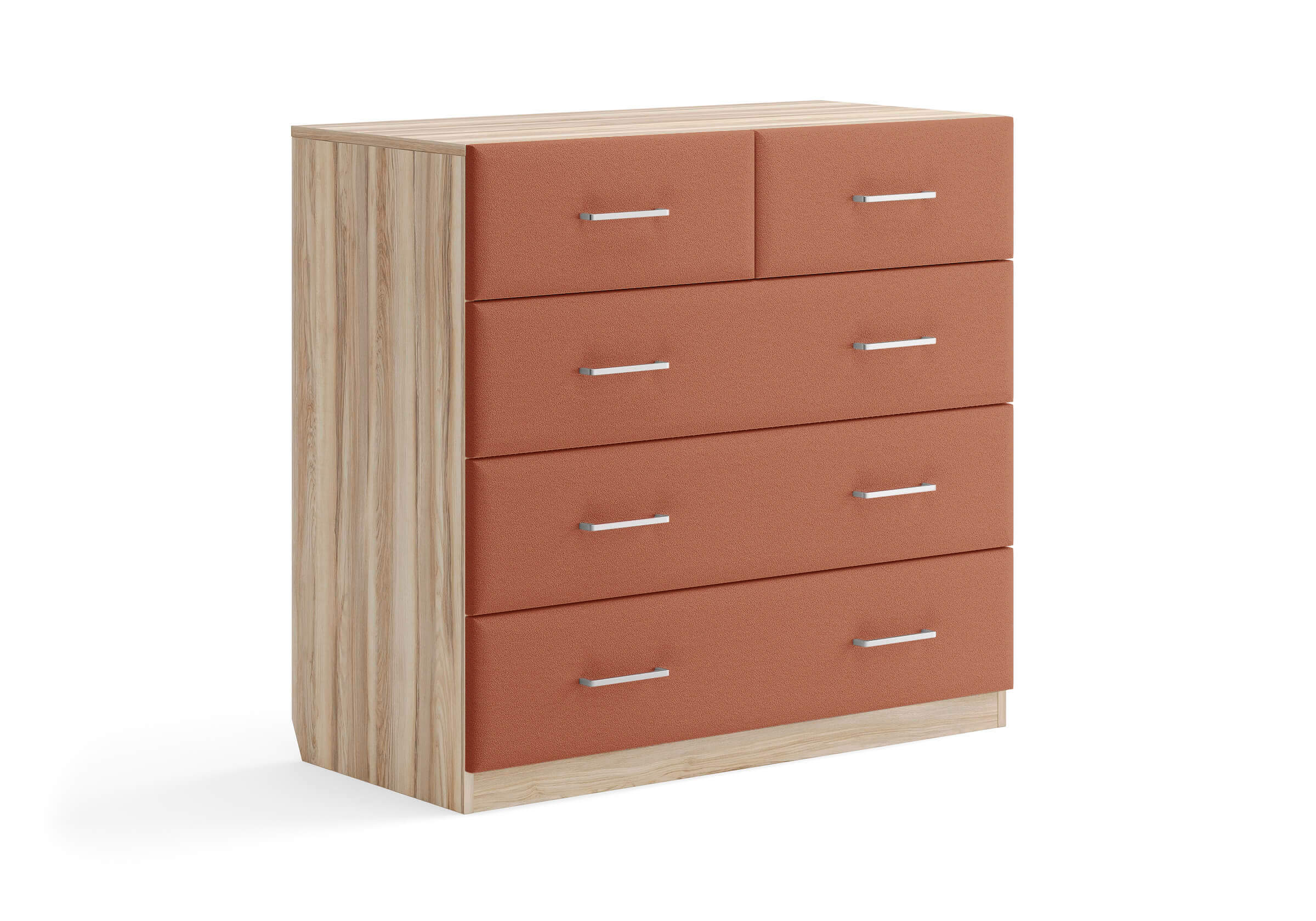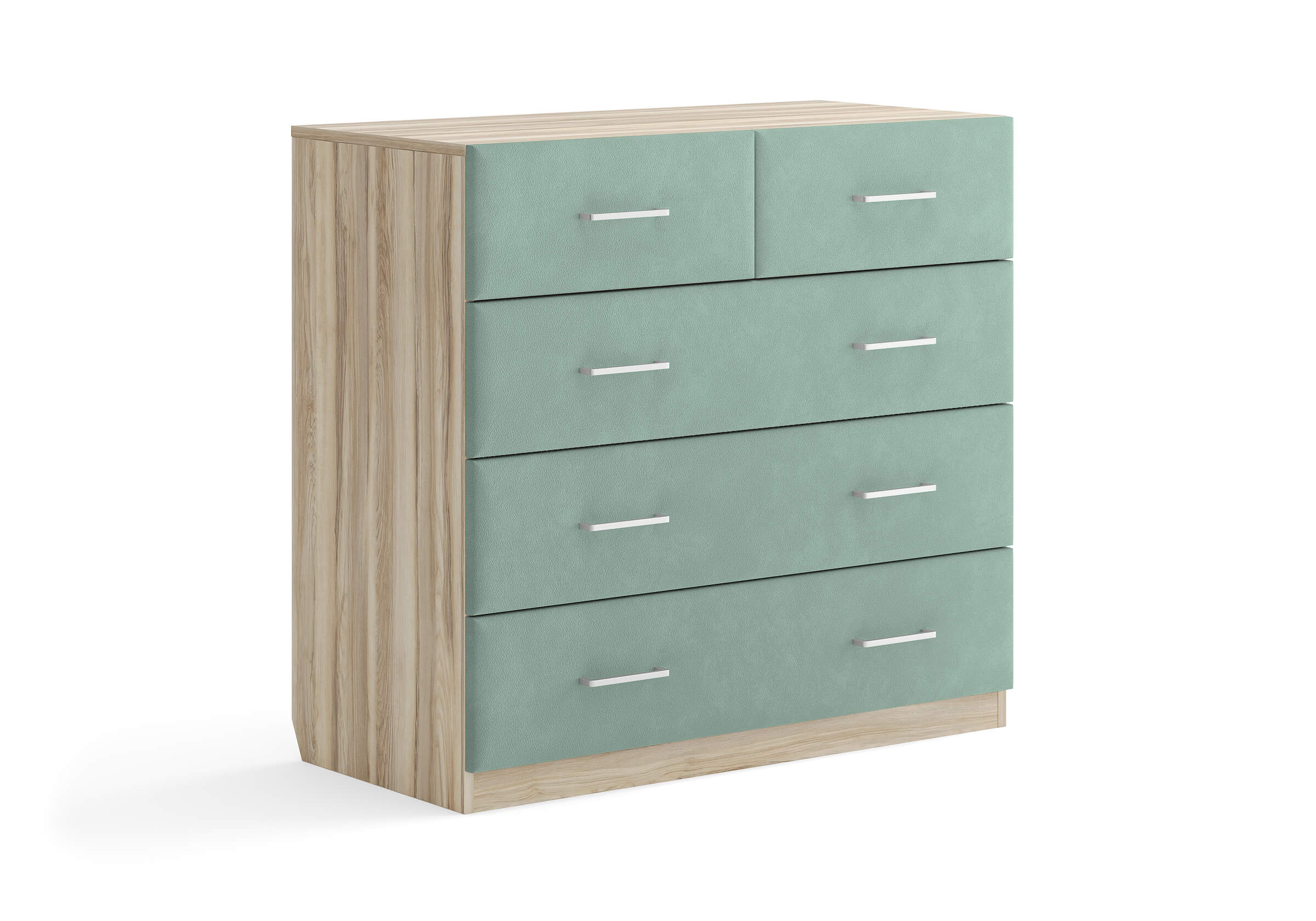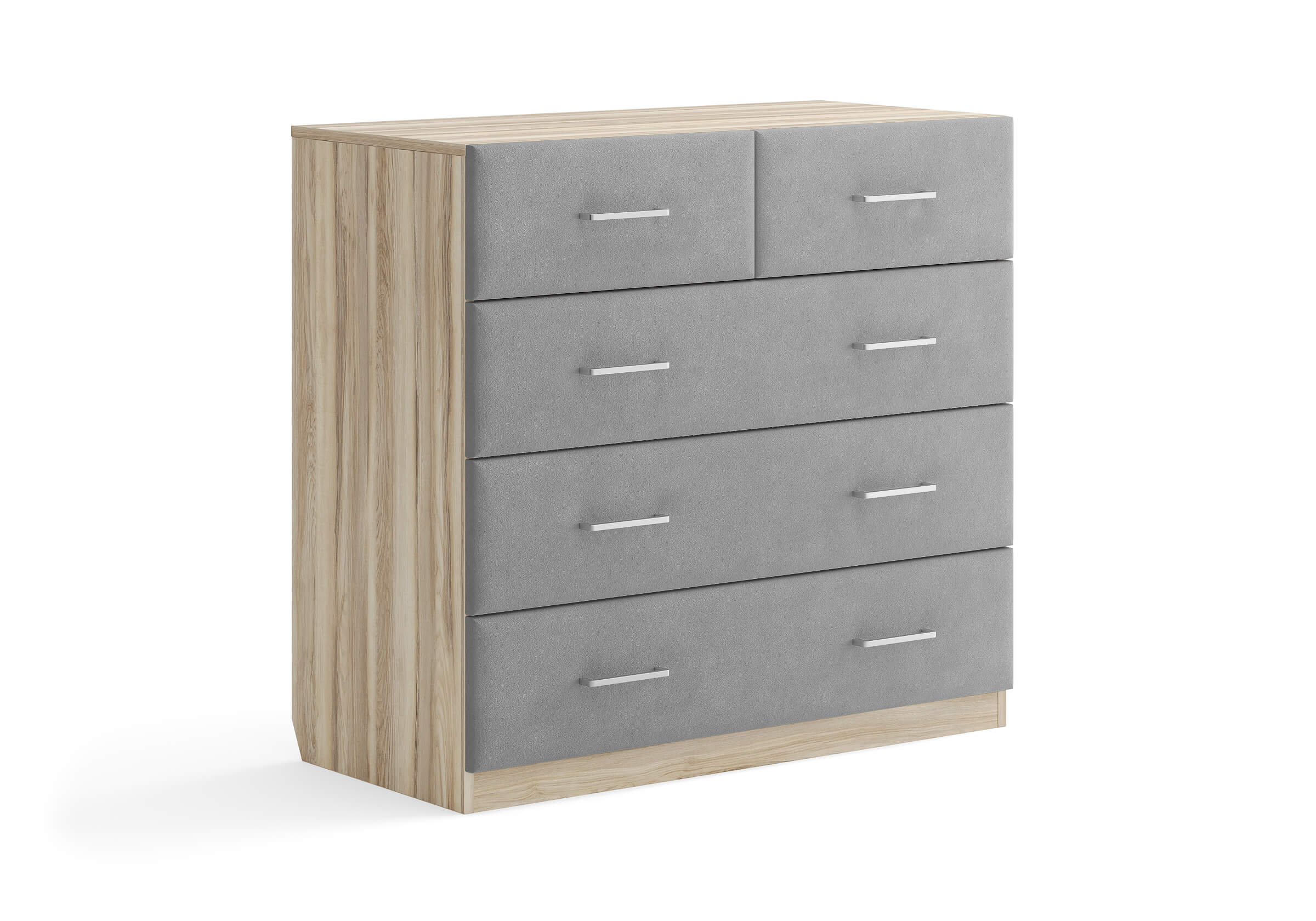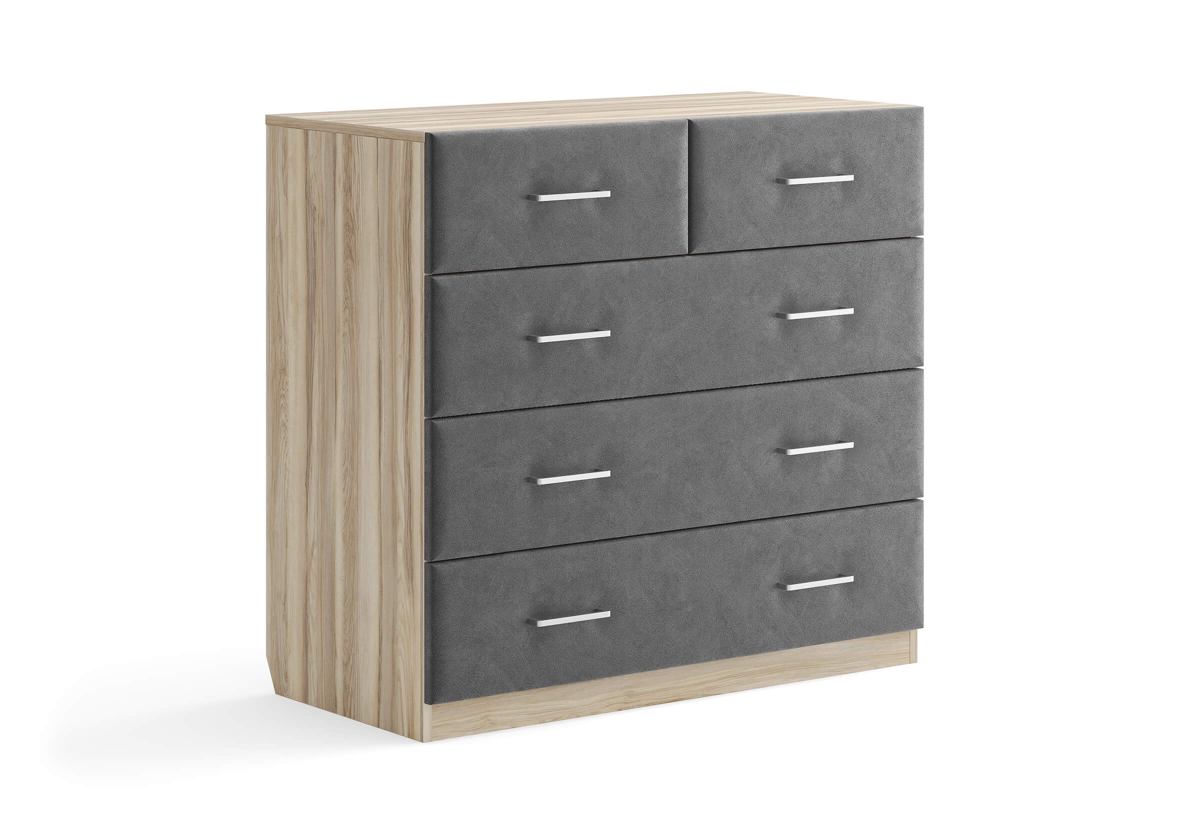 Комбинированный комод Tomas с пятью вместительными ящиками станет элегантным дополнением интерьера. Корпус, выполненный из высококачественной ЛДСП, гарантирует прочность и долговечность, а мягкие фасады в ткани и изящные металлические ручки добавят уют. Комод имеет скос под плинтус, это позволяет устанавливать его вплотную к стене. Благодаря своему дизайну и широкому выбору вариантов исполнения комод можно разместить не только в спальне, но и в прихожей или гостиной.