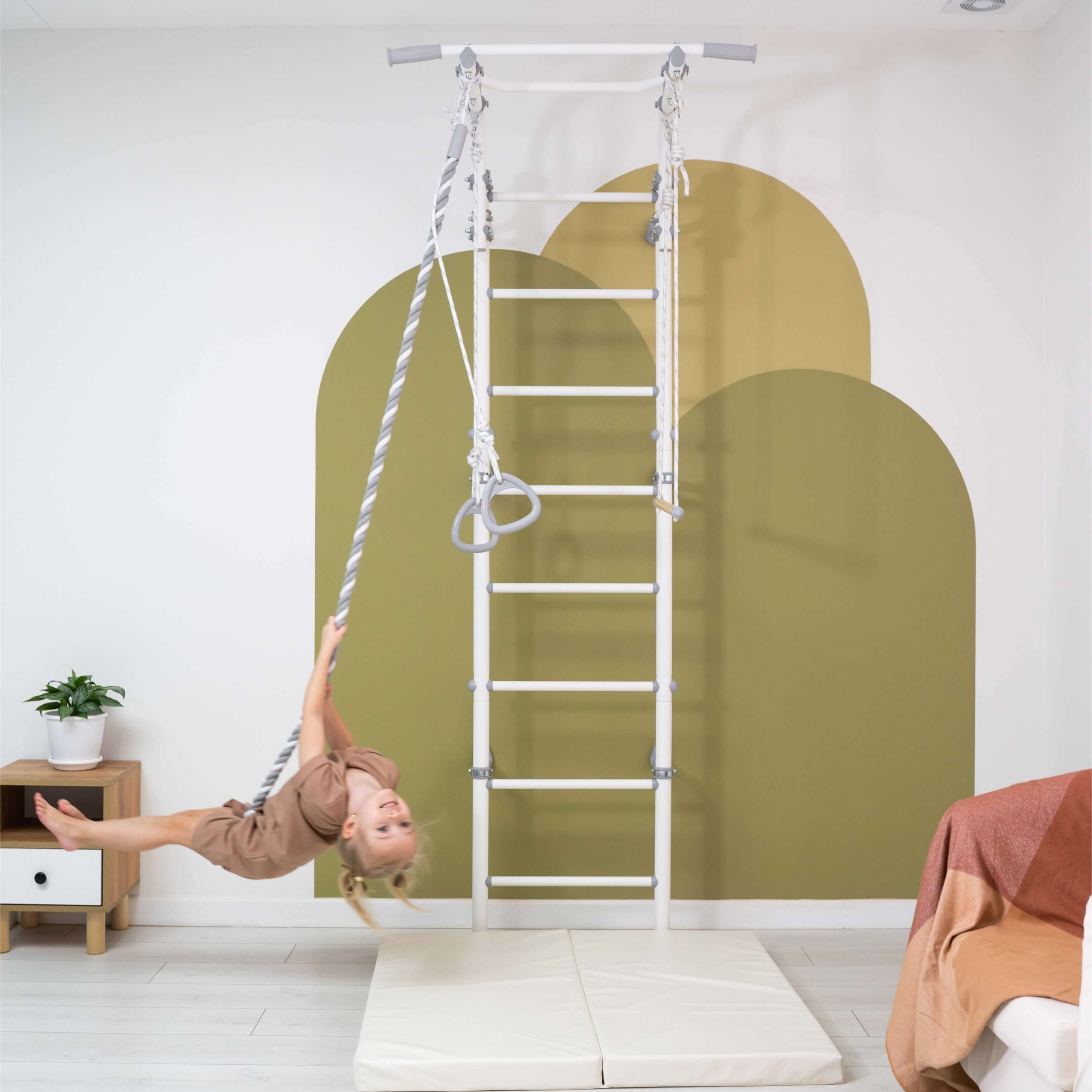 Детский спортивный комплекс ROMANA Некст Муар представляет собой элегантное обновление самой востребованной модели в ассортименте шведских стенок, покрытый бархатистым покрытием Муар. Комплекс имеет белые матовые стойки, гладкие металические перекладины и серую фурнитуру, которая сочетается с навесным оборудованием хорошо впишется в современный интерьер.