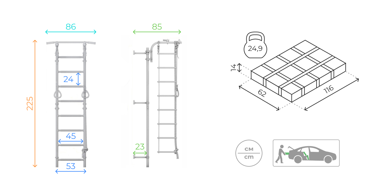 В комплект входят массажные ступени для развития моторики и профилактики плоскостопия, а также навесное оборудование в той же цветовой гамме: кольца, веревочная лестница и канат. Комплекс упакован компактно, что позволяет перевозить его в легковом автомобиле. Размеры упаковки составляют 57х80х19 см.