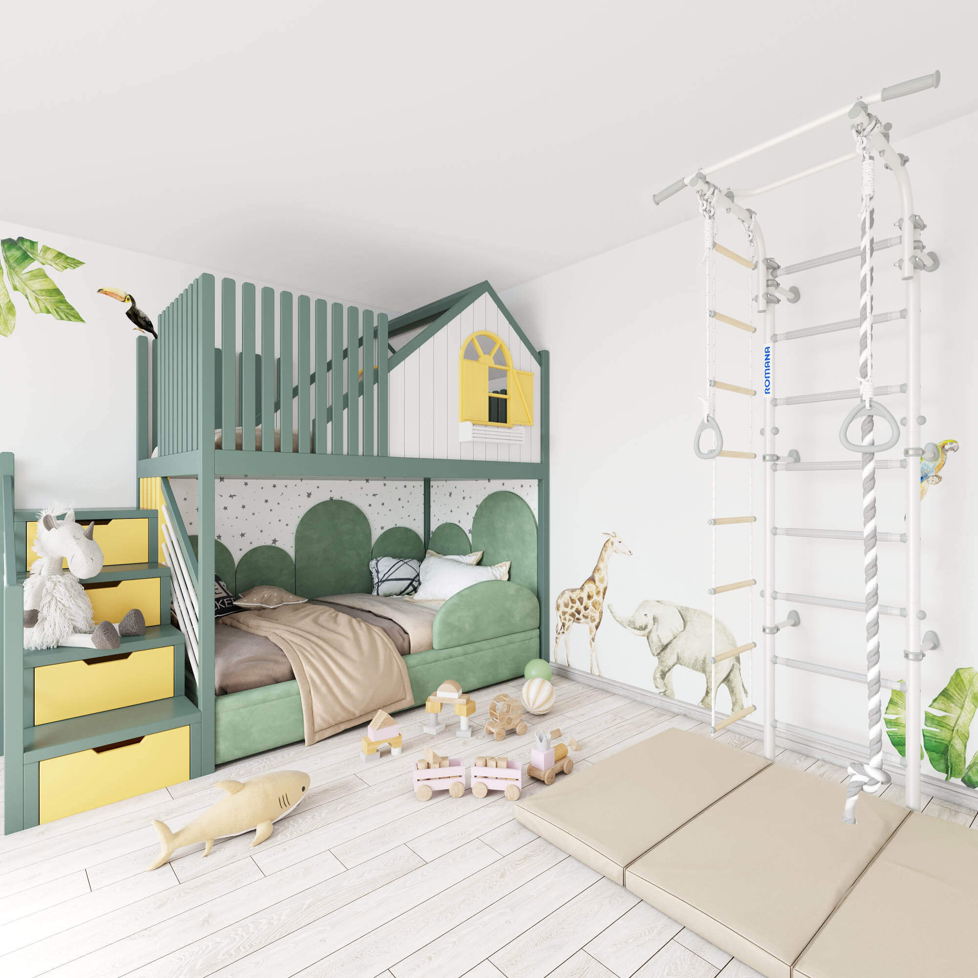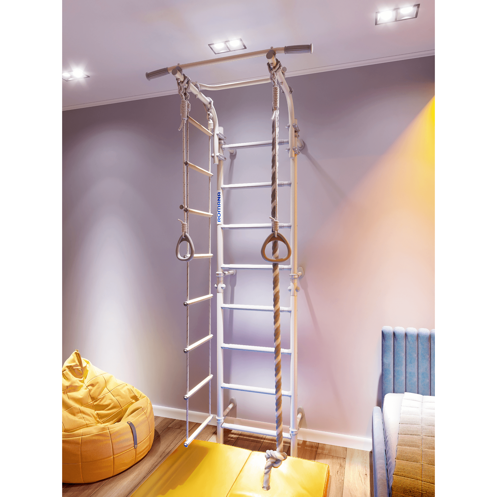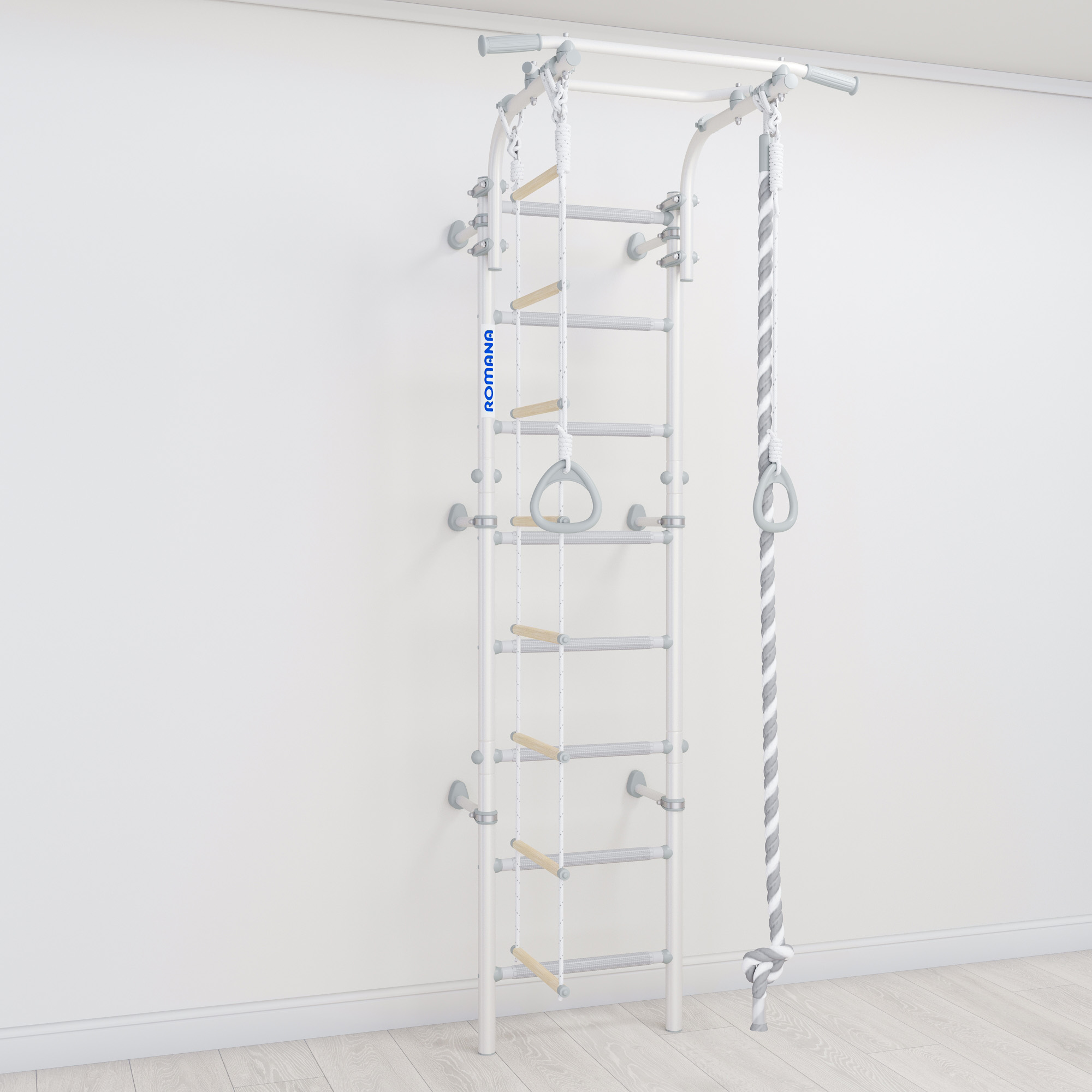 Детский спортивный комплекс ROMANA Некст Пастель+ представляет собой обновленную версию популярной шведской стенки, выполненную в пастельных тонах белого и серого, что идеально подходит для современного интерьера.