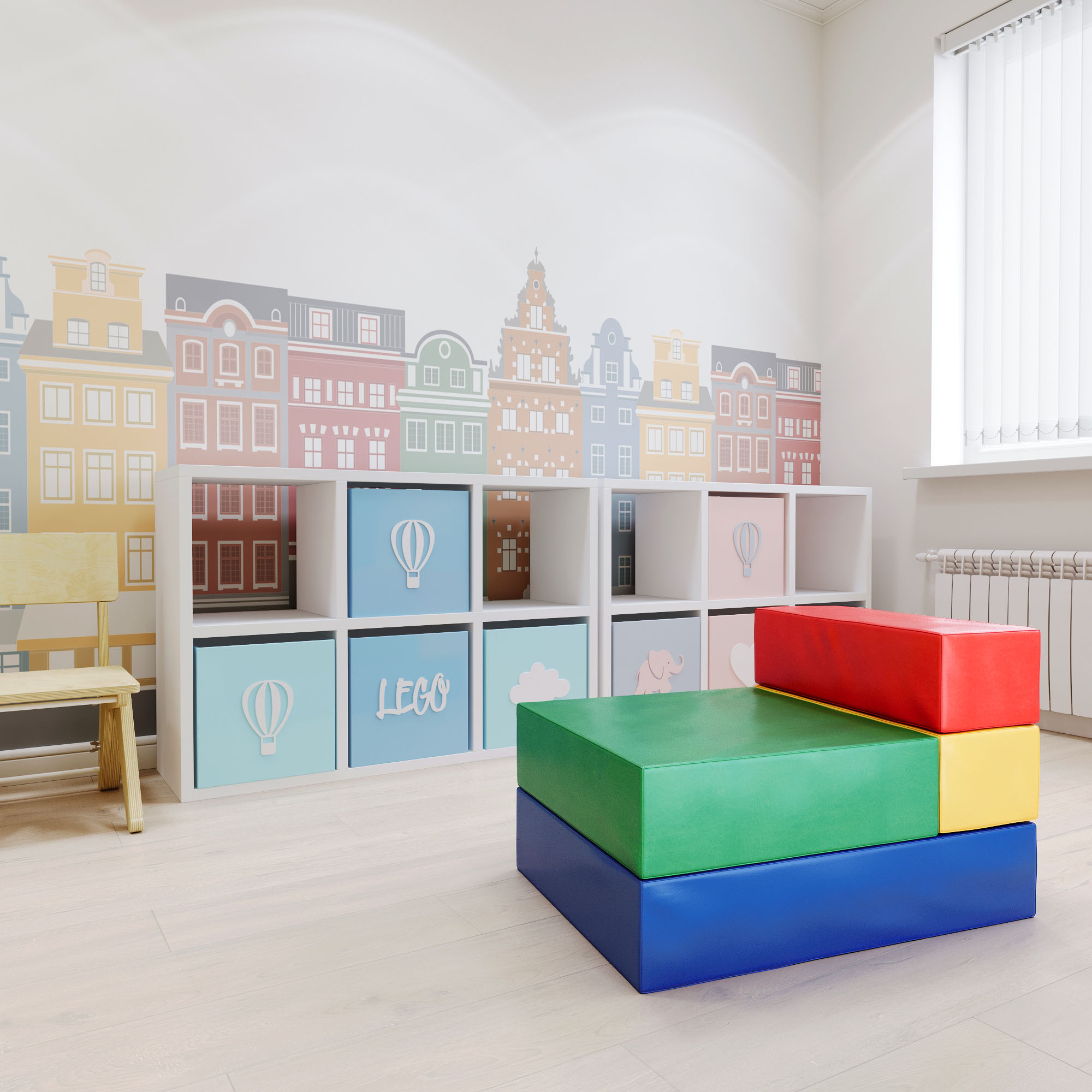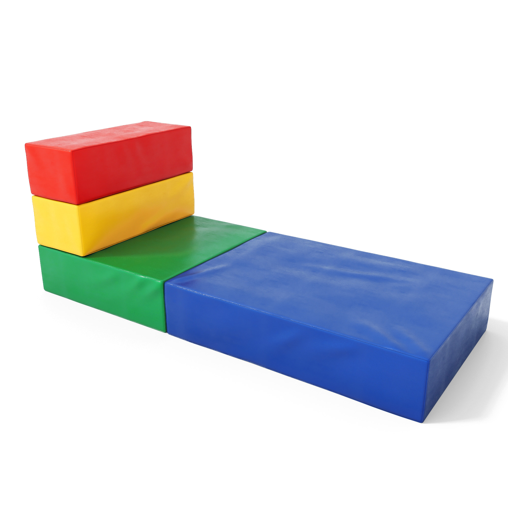 Кресло ДМФ-МК-01.93.04 — состоит из четырех разноцветных деталей, с помощью которых можно создать разнообразные кресла и диванчики для отдыха, а также множество прочих игровых конструкций.