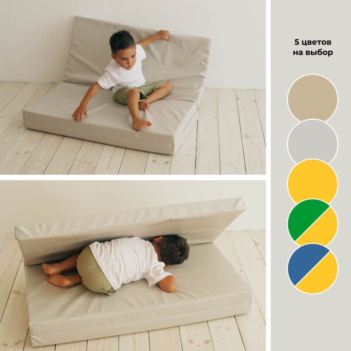 Параметры изделия: 1000*1500*60мм в разложенном виде, и 1000*500*180мм в собранном соответственно. Благодаря своим небольшим габаритам в сложенном виде, мат практичен в хранении и транспортировке. Габариты изделия позволяют создать безопасную зону во время занятий на шведской стенке. Мат подойдет для различных комплектаций спортивного комплекса, в том числе с навесным оборудованием (лестницами и кольцами), и с канатным лазом или скалолазом. Кроме того, габариты мягкого щита позволяют создать полноценный спортивный уголок для физической активности. Мягкий щит отлично подходит для выполнения упражнений, гимнастики, йоги, аэробики и др. Множество эффектных цветовых сочетаний позволят подобрать мат для любого интерьера. Однотонные маты представлены в двух универсальных цветах – сером и бежевом. Нежные оттенки деликатно дополнят интерьер. Сочные расцветки двусторонних матов добавят красок в обстановку комнаты. Особенностью двусторонних матов является разная расцветка для его сторон. Благодаря этому, поменять цвет мата очень просто – достаточно перевернуть мягкий щит на другую сторону.