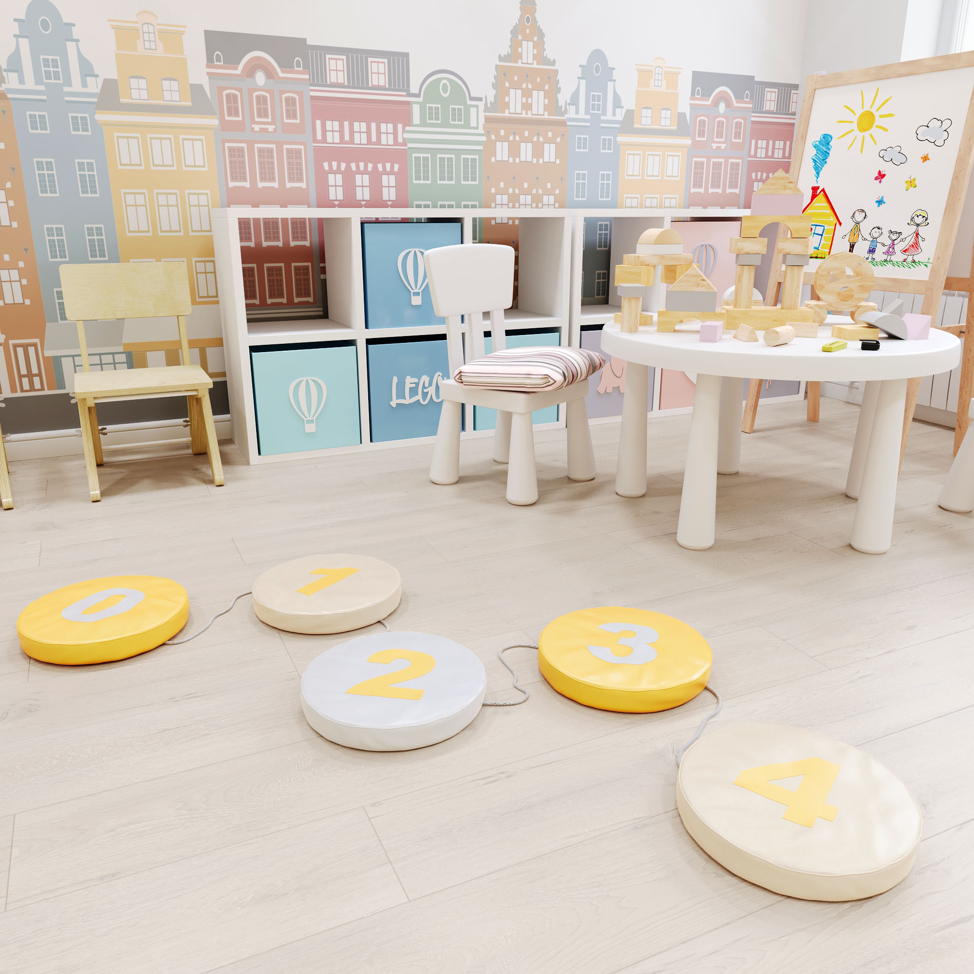 Мягкая форма «Шагайка» — это развивающий модуль из пяти кругов диаметром 300 мм, соединенные между собой. Помогают научиться считать и развить координацию у ребенка. Габаритные размеры 300 х 300 мм.