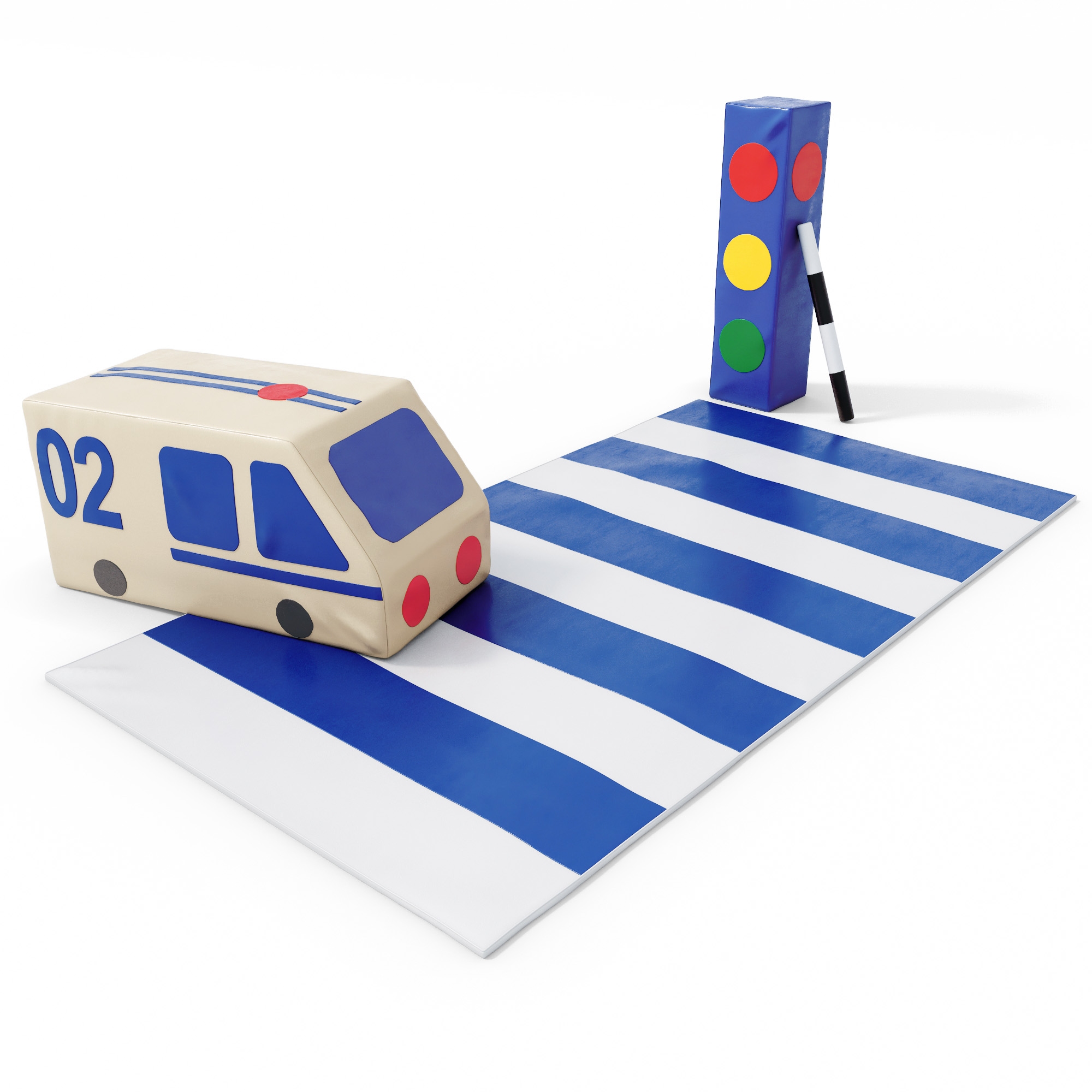 Комплект выполнен в тематическом дизайне и представлен дорожкой, имитирующей пешеходный переход – сине-белую зебру, мягкой игрушкой выполненной в виде полицейского автомобиля, светофором и жезлом полицейского