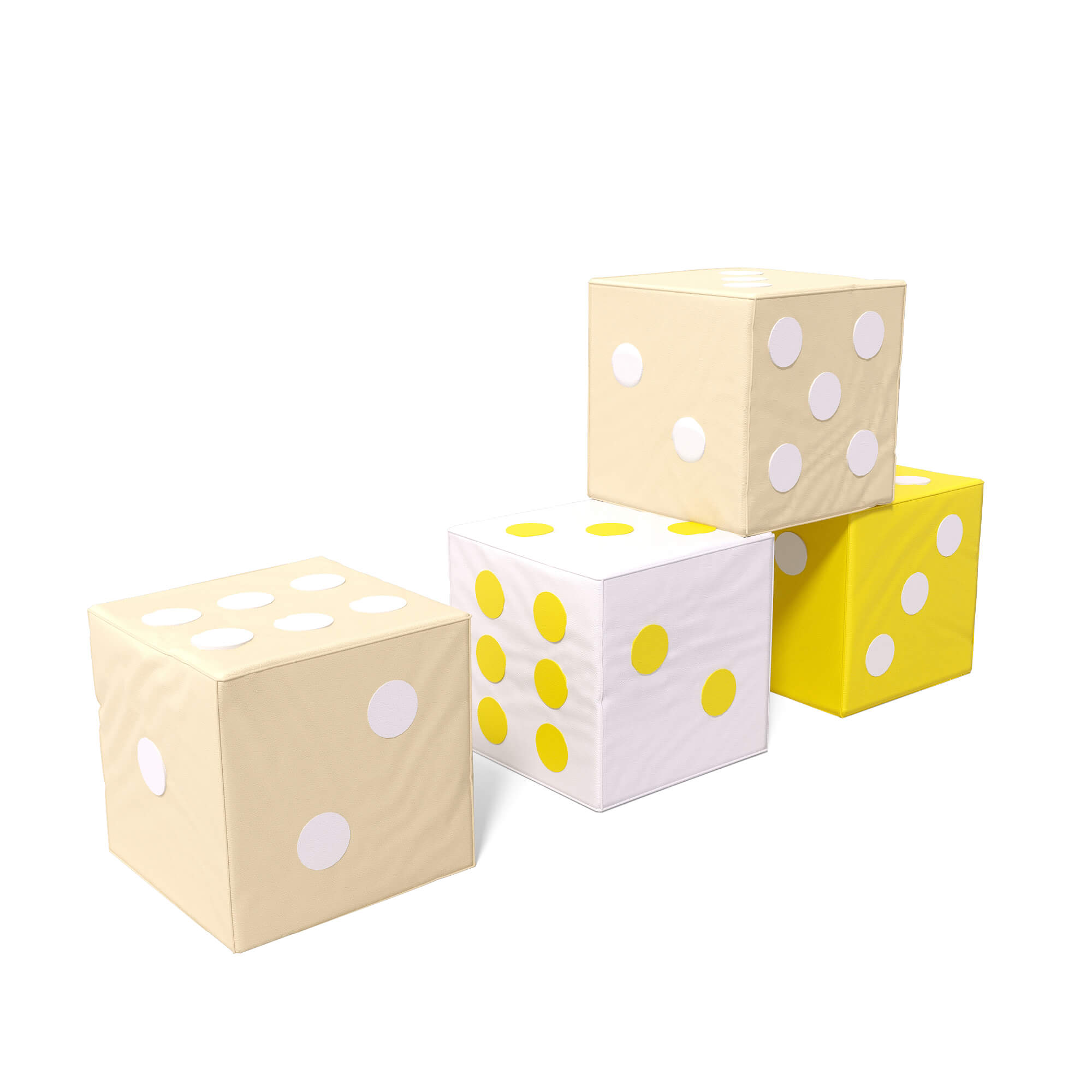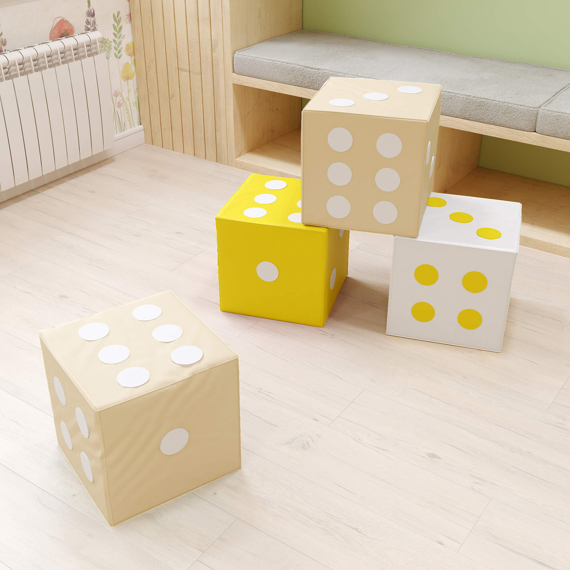 Мягкий модуль «Кости» — четыре цветных пуфа имитирующие игровые кости. Помогает научиться ребенку счету, а также может быть использован как кубики для строительства башен. Габаритные размеры одного кубика 300х300х300 мм, в комплекте 4 шт. Вес с упаковкой 8 кг.