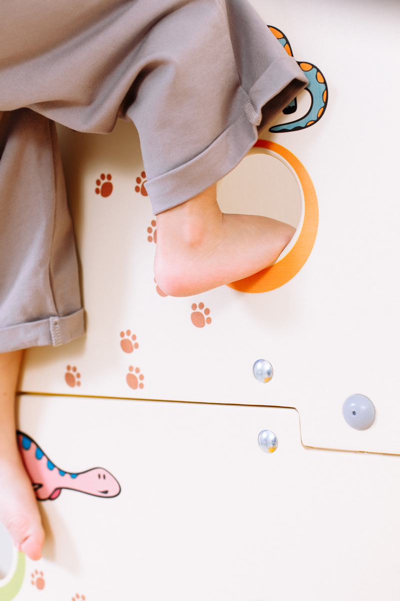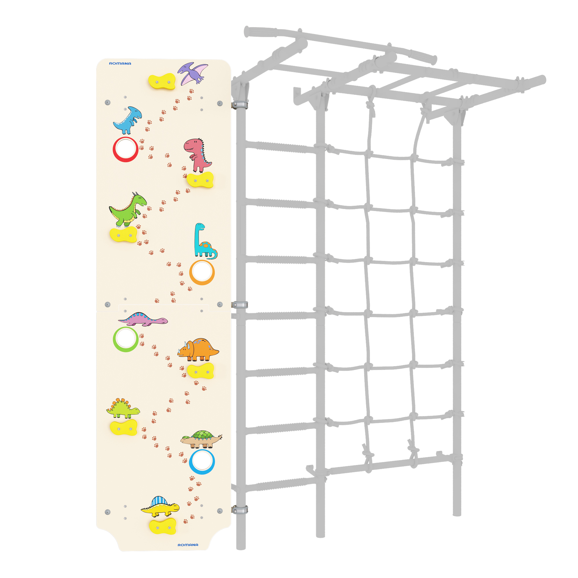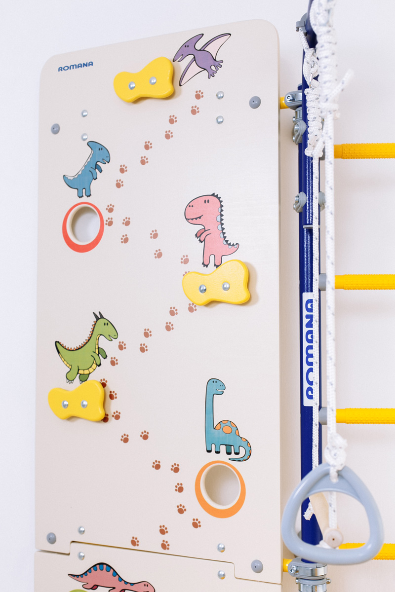 Превосходное решение для тренировки маленьких альпинистов в домашних условиях. Большой фанерный щит крепится либо слева, либо справа от лестницы и позволяет детям тренировать навыки скалолазания в домашних условиях. Все зацепы сделаны согласно технике безопасности. Щит украшен веселыми динозавриками, которые поднимают настроение при занятиях.