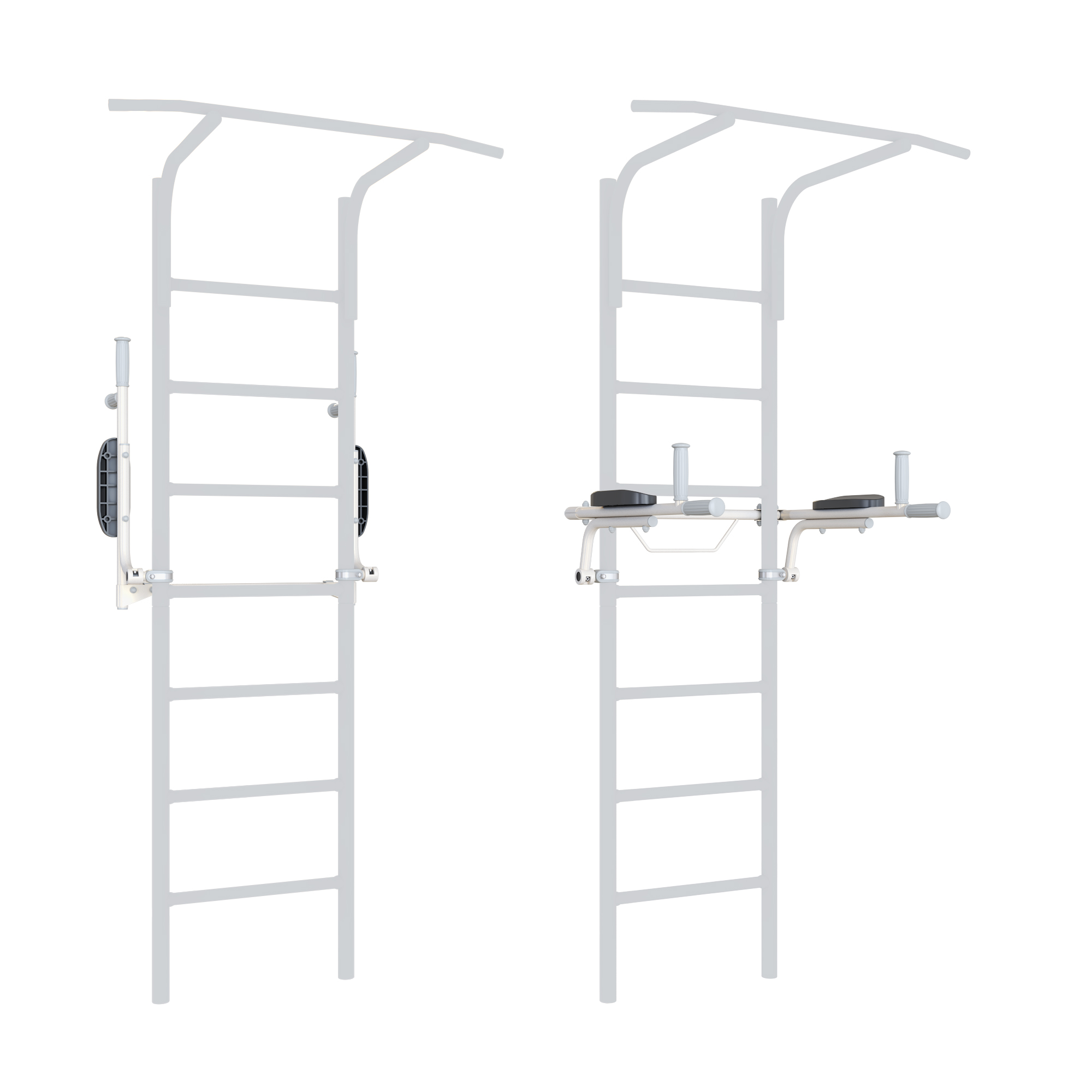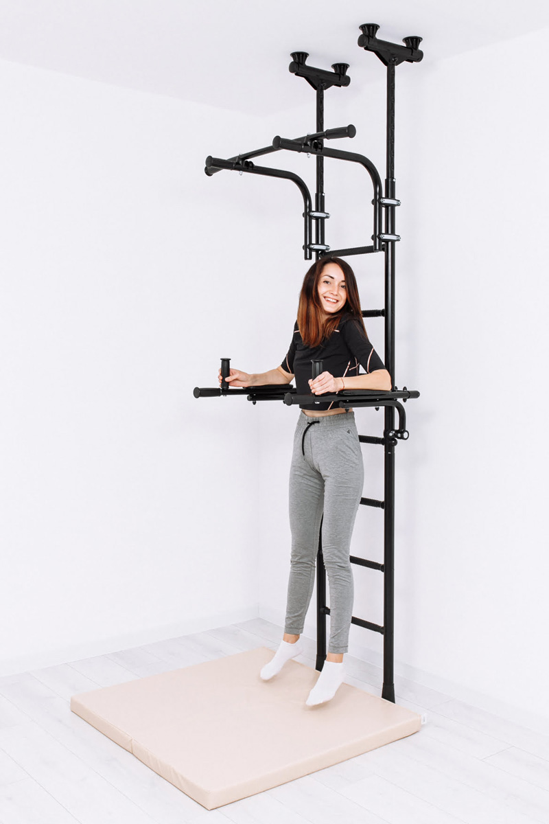 Брусья откидные — удобное дополнительное оборудование для экономии пространства. Они фиксируются хомутами на лестнице спортивного комплекса ROMANA шириной 37 см. После занятий их можно откинуть таким образом, чтобы они встали параллельно лестнице и не мешали другим занятиям, либо не занимали лишнее пространство в помещении. Для комфорта и безопасности предусмотрены четыре прорезиненных рукояти и подлокотники.