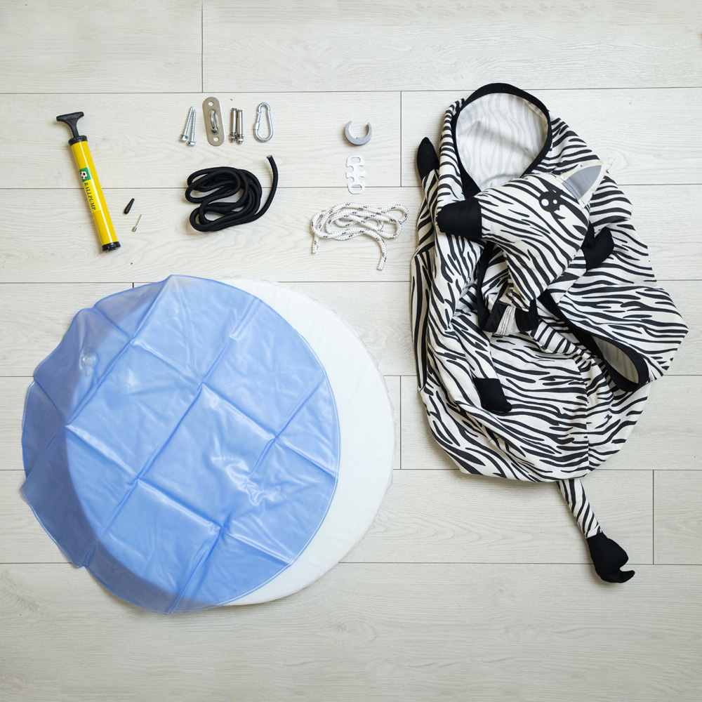 В комплект входит гамак и два вида сиденья к нему (подушка надувная и из поролона), а также насос, крепежи и шнуры для монтажа изделия.