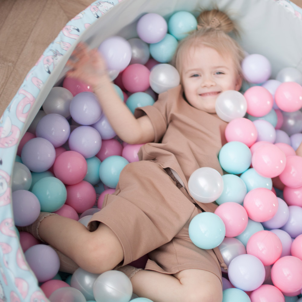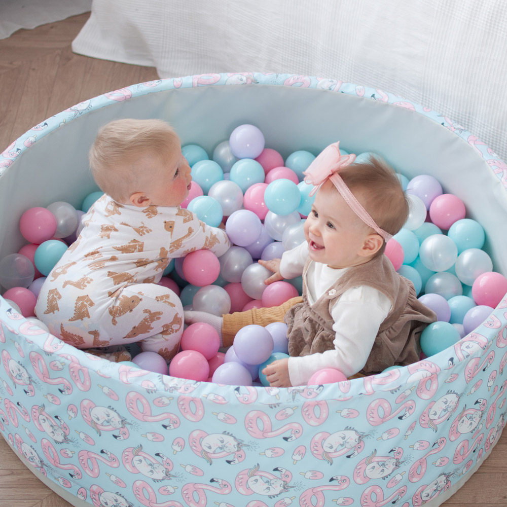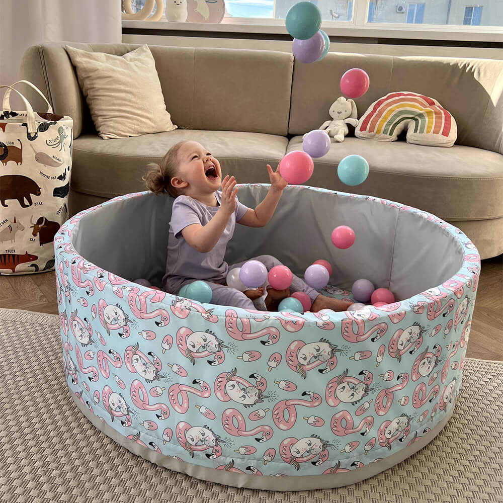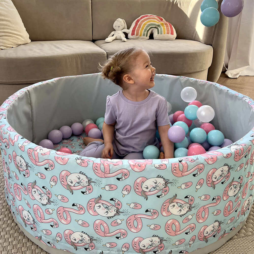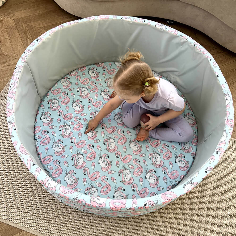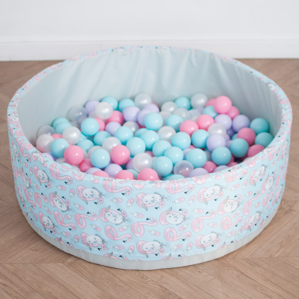 В комплект входит поролоновый напольный бассейн, съемный чехол из водонепроницаемой ткани Оксфорд с нежным принтом — фламинго и единорогами снаружи и на дне, 150 пластиковых шаров и сумка для хранения.