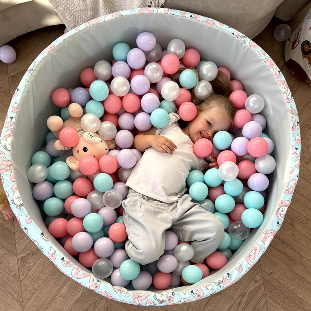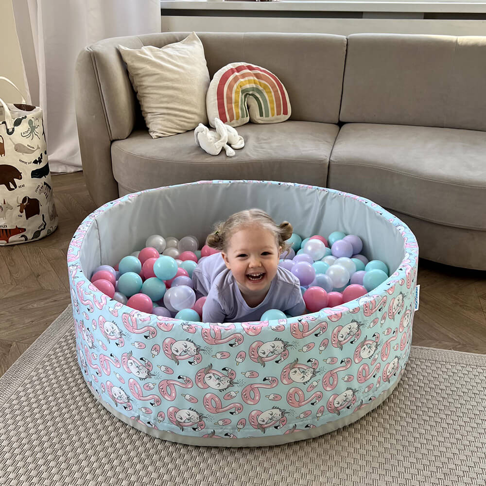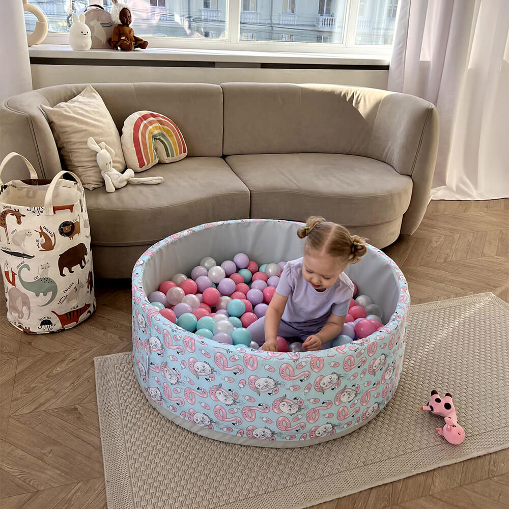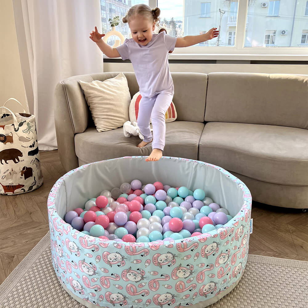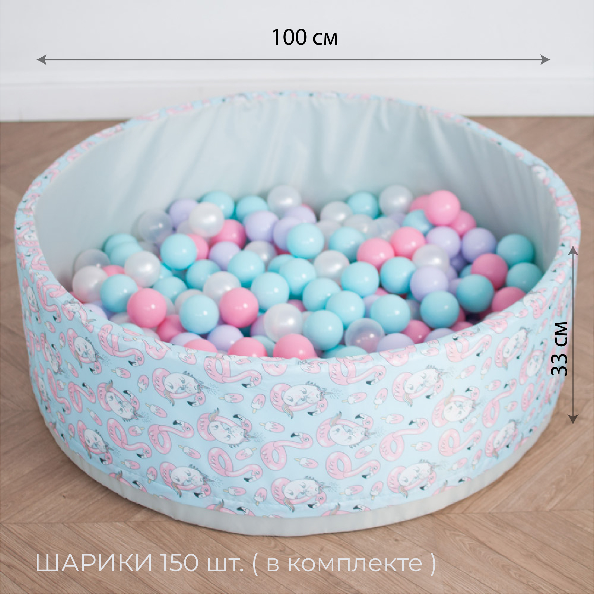 В комплект входит поролоновый напольный бассейн, съемный чехол из водонепроницаемой ткани Оксфорд с нежным принтом — фламинго и единорогами снаружи и на дне, 150 пластиковых шаров и сумка для хранения.