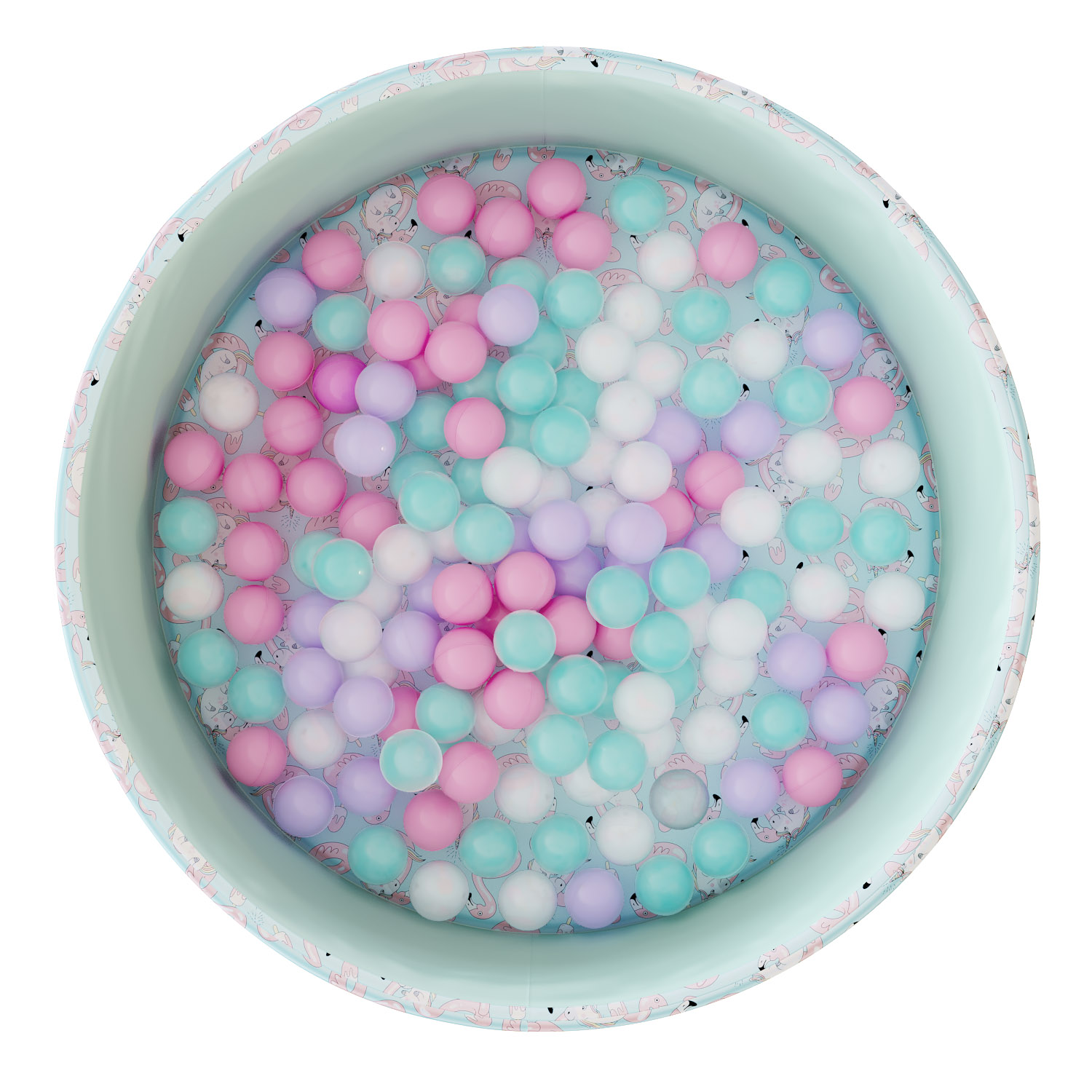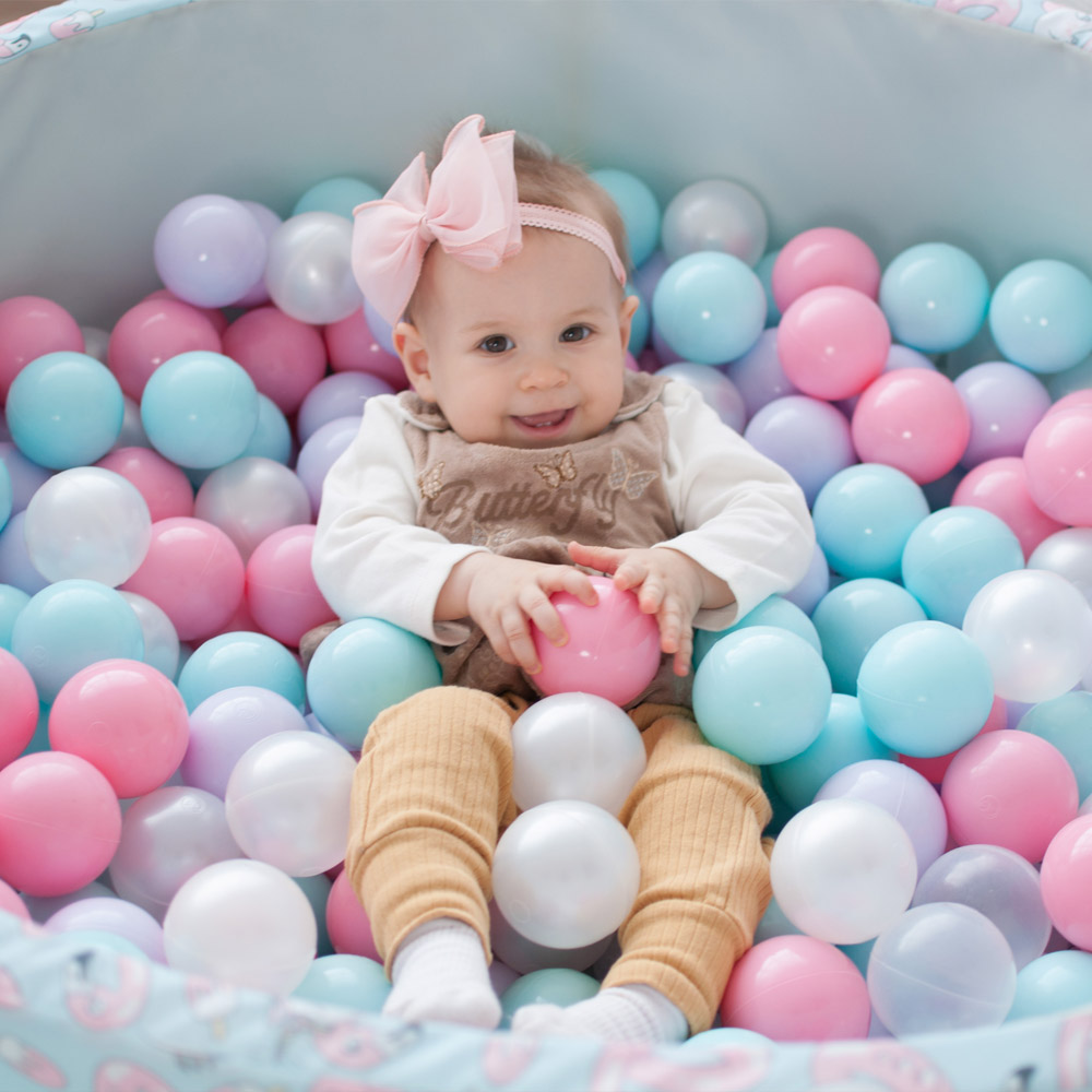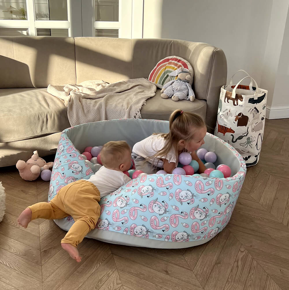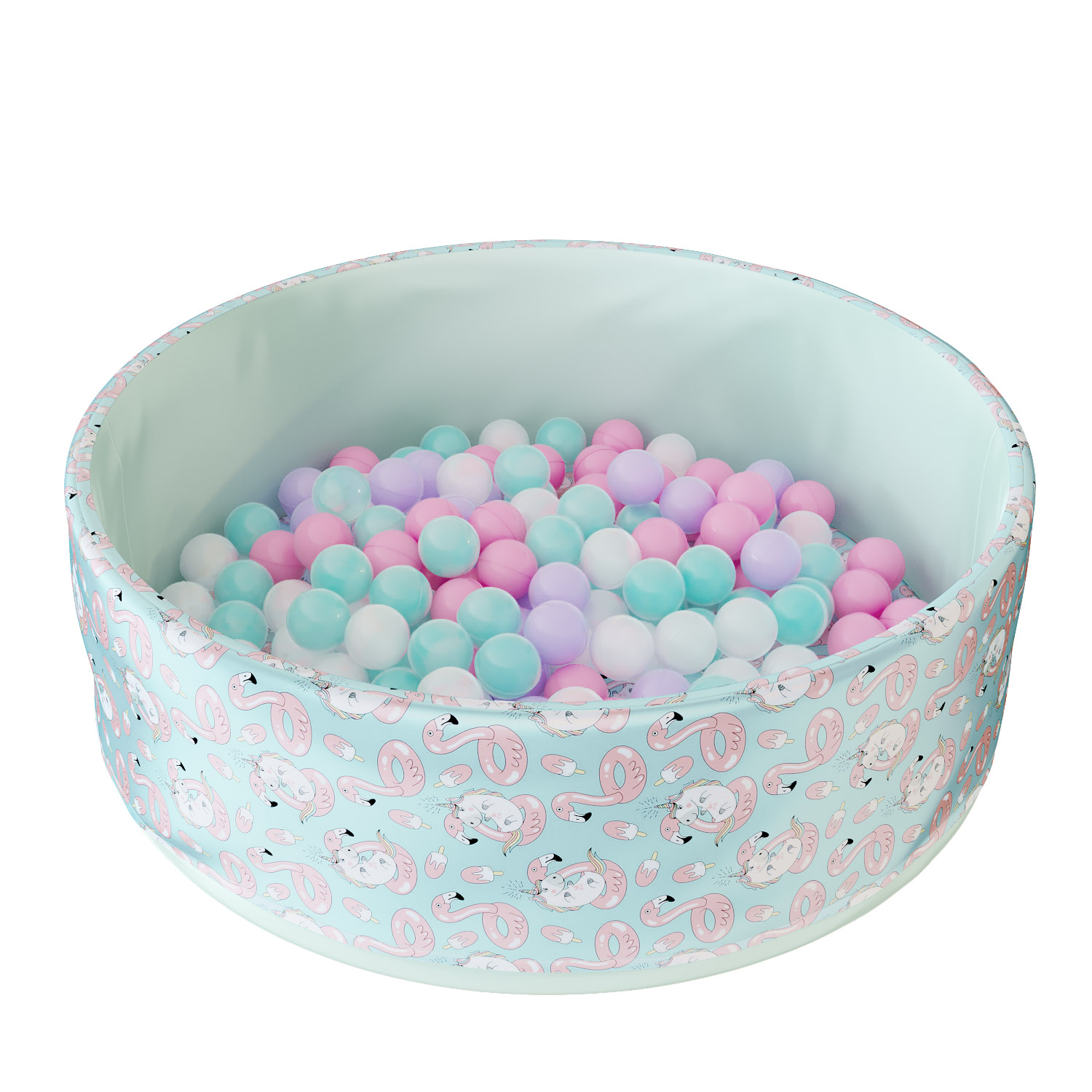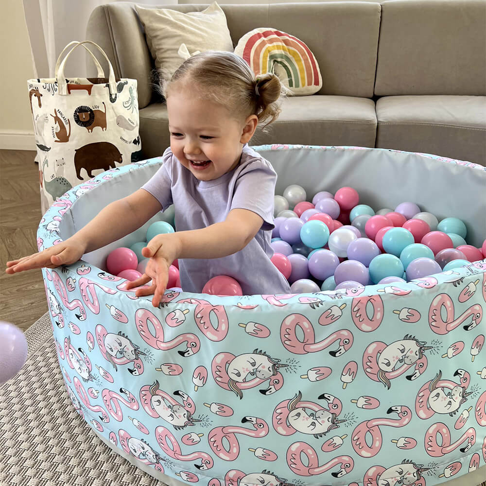 В комплект входит поролоновый напольный бассейн, съемный чехол из водонепроницаемой ткани Оксфорд с нежным принтом — фламинго и единорогами снаружи и на дне, 150 пластиковых шаров и сумка для хранения.