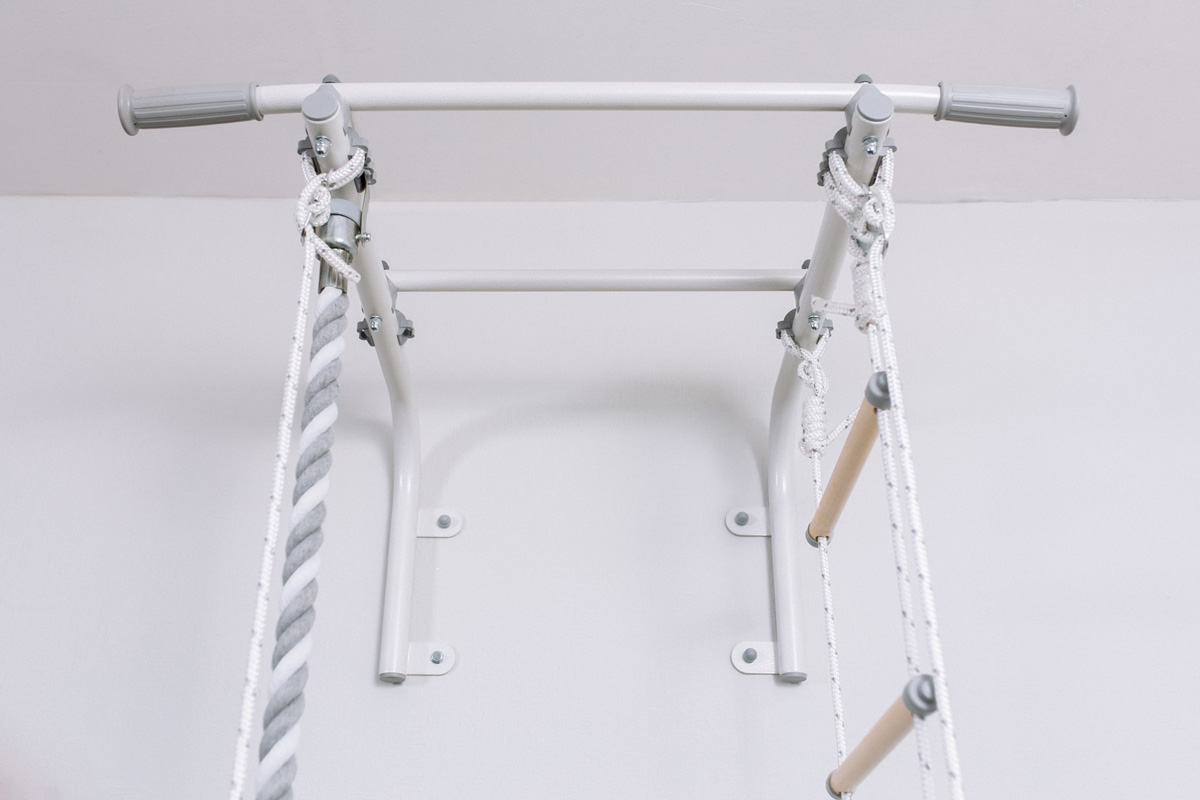 Благодаря металлическому каркасу и прочной настенной фиксации, турник устойчив и надежен. Конструкция выдерживает нагрузку до 100кг, это позволяет заниматься на турнике всей семье. Максимальный объем нагрузки на детское навесное оборудование составляет 50 кг.