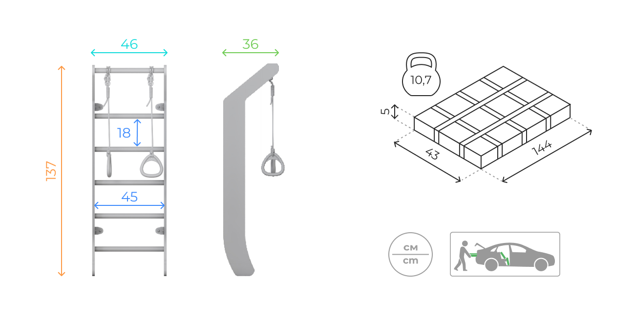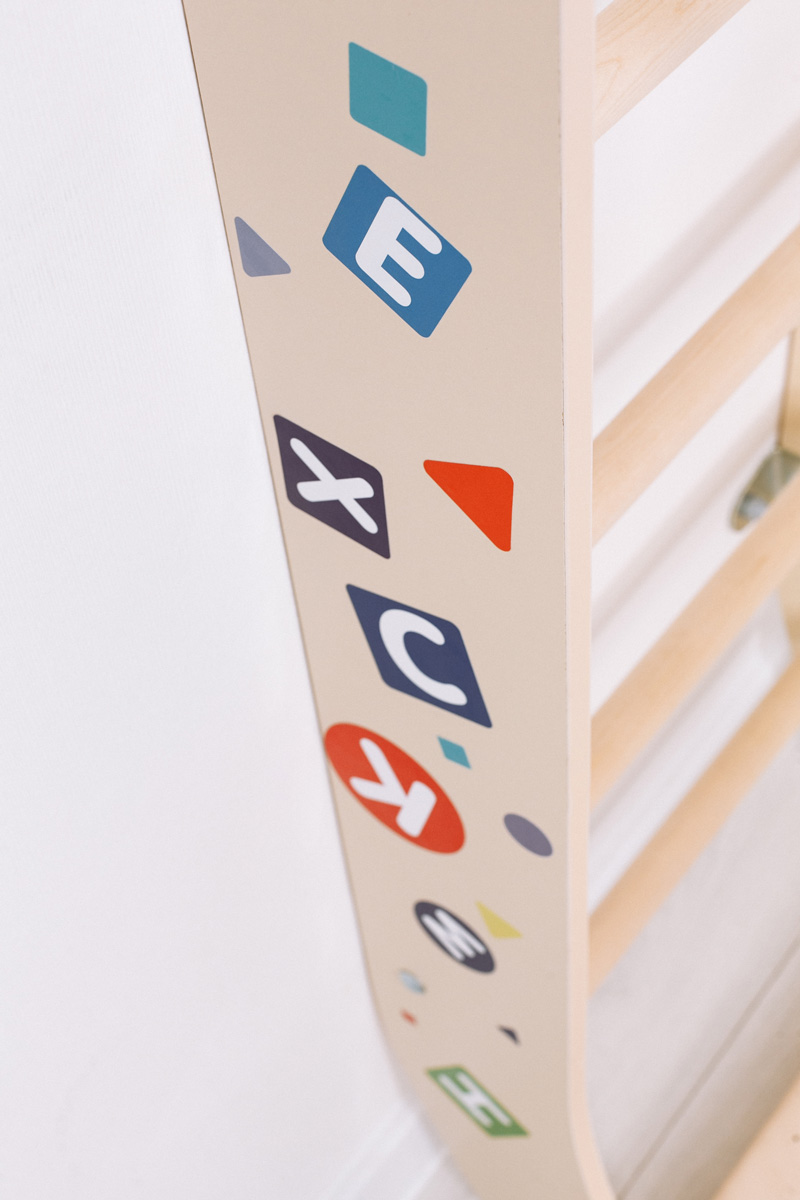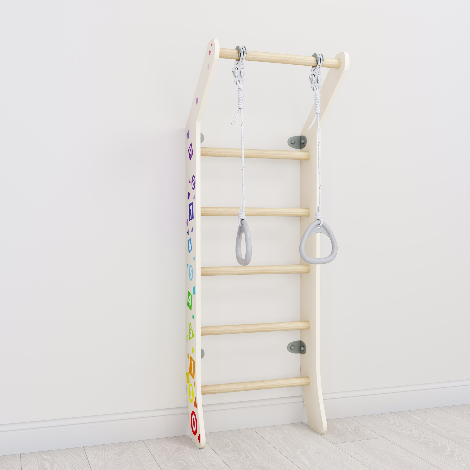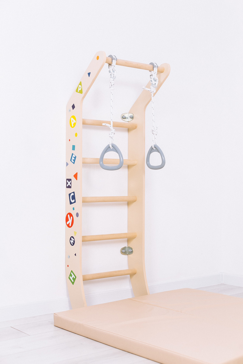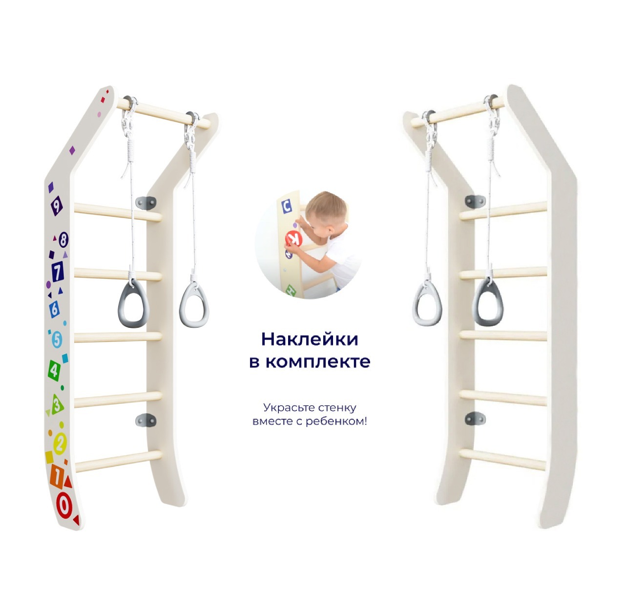 В комплекте вложены наклейки с изображением цифр и букв, которые ребенок сам или совместно с мамой сможет приклеить на боковые стороны комплекса. Комплекс удобно фиксируется к стене на надежные скобы, не занимает много места в детской комнате. Для развития моторики рук и ловкости в комплектации идут гимнастические кольца.