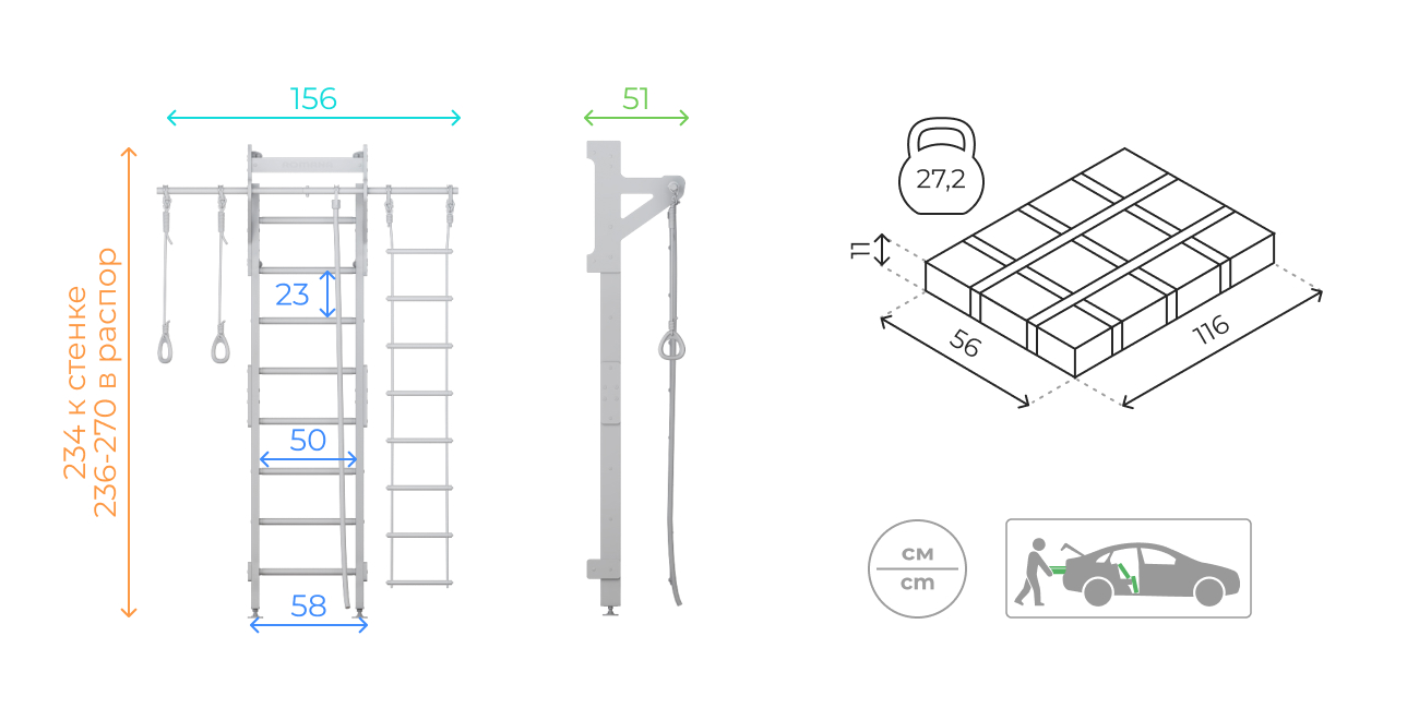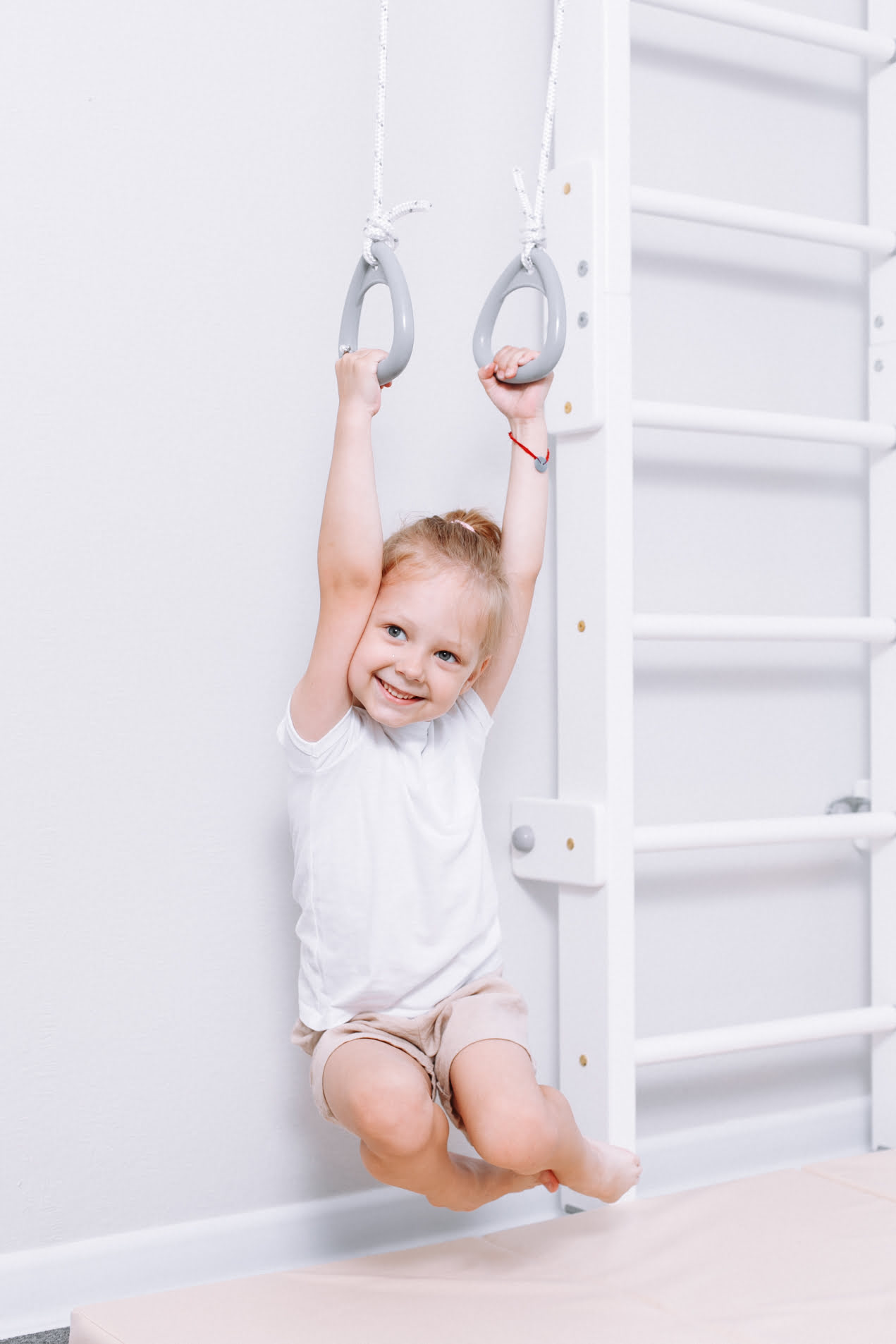Спортивный комплекс ROMANA Эко2.1 может быть установлен как к стене, так и враспор — в зависимости от того, как удобно пользователю. По необходимости стенку легко переставить в другое место. В комплексе предусмотрен широкий фиксированный турник, на котором размещается навесное оборудование: кольца, веревочная лестница и канат.