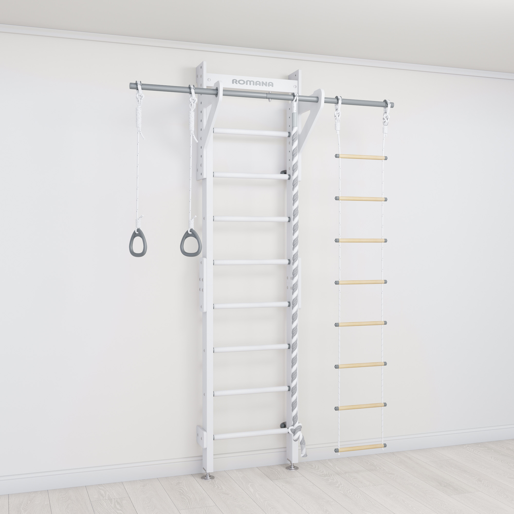 ROMANA Эко2.1 — это дополненная прочным турником и навесным оборудованием модель деревянной шведской стенки в белом цвете.