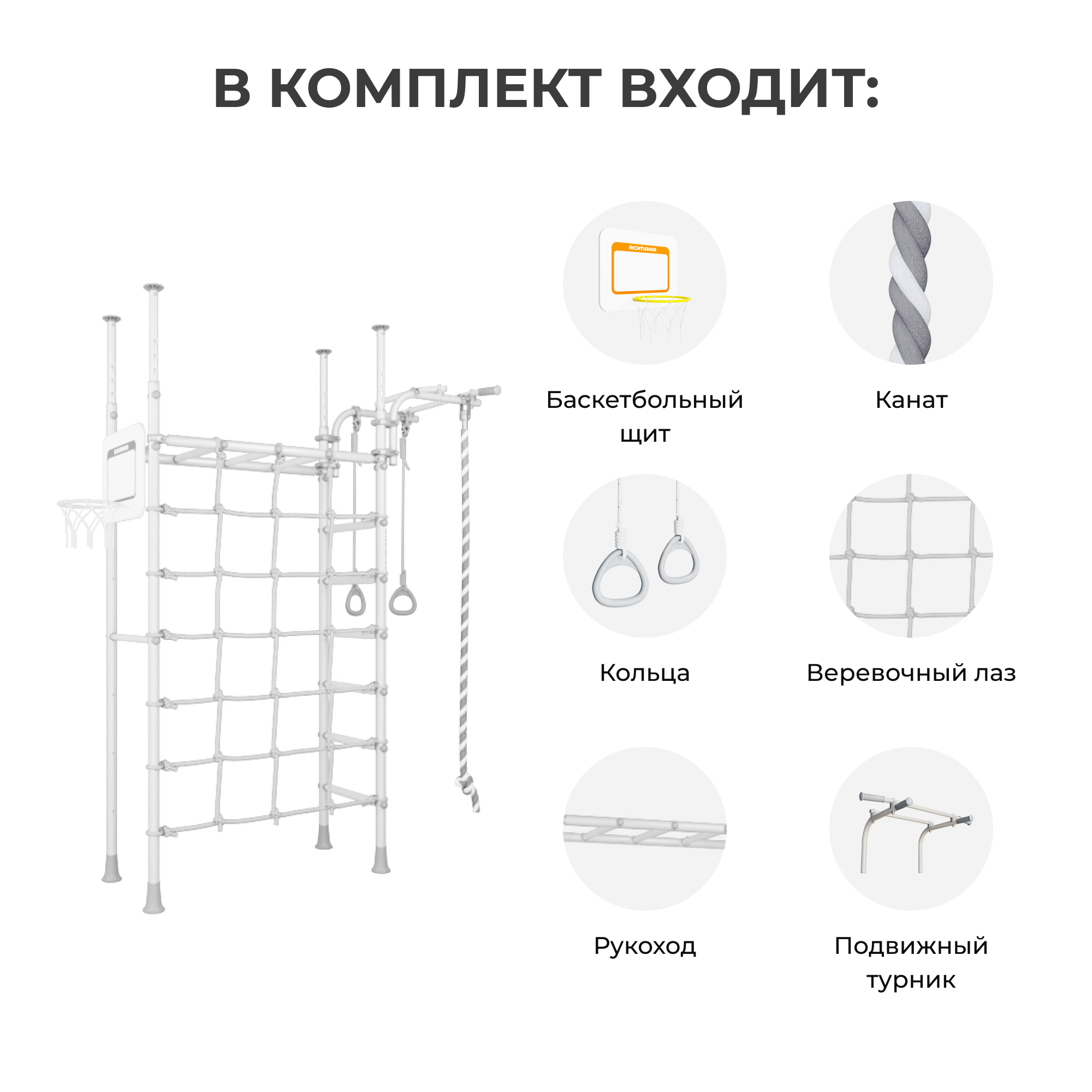 Баскетбольный щит, Канат, Кольца, Веревочный лаз, Рукоход, Подвижный турник |