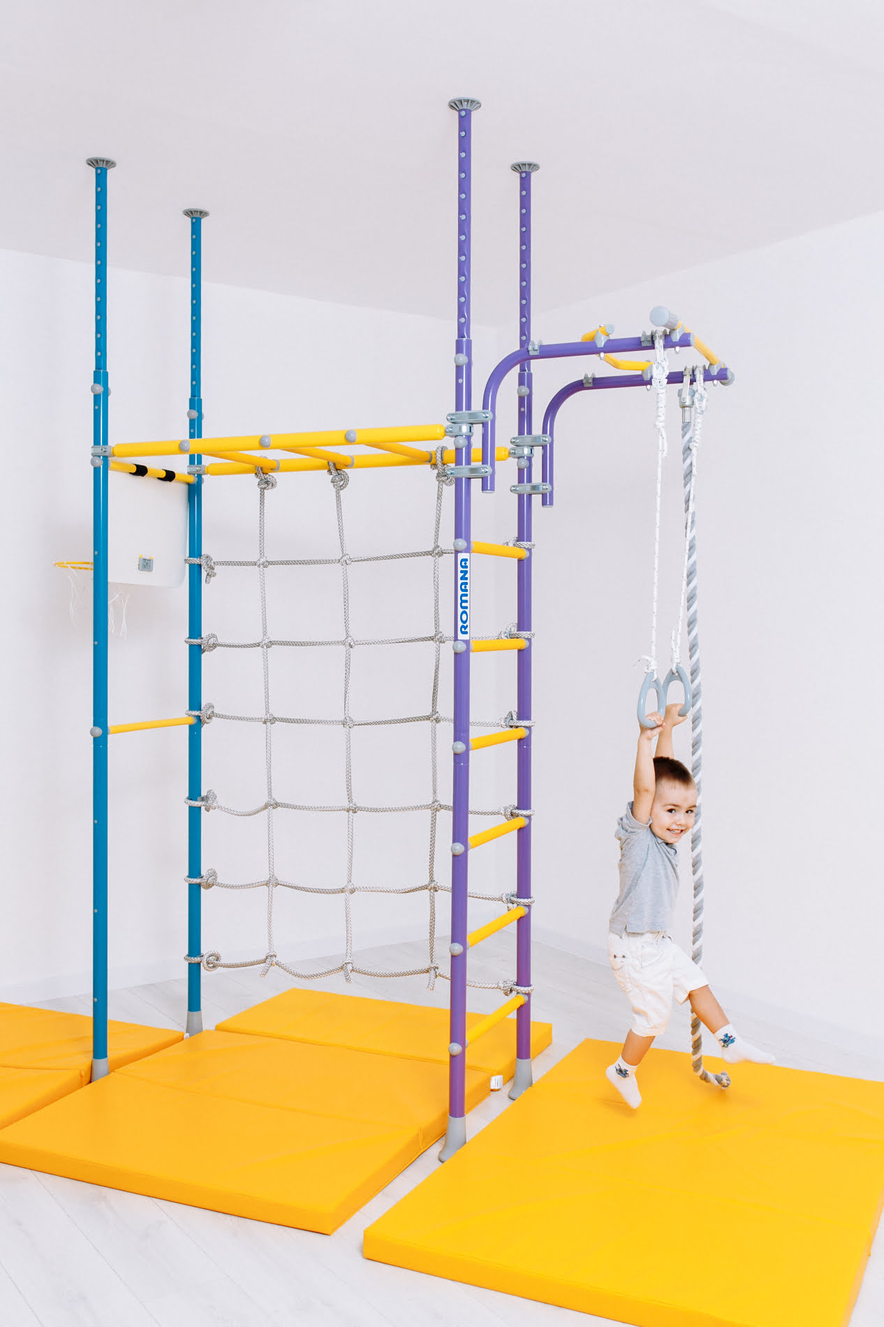 Детский спортивный комплекс ROMANA Р4 — многофункциональный комплекс для дома, где предусмотрено все для выполнения упражнений и увлекательных физкультурных занятий. Он устанавливается враспор к полу и потолку в любом подходящем месте дома или квартиры.Турник фиксируется на любой высоте надежными хомутами, их можно перемещать по вертикали на рамах комплекса. Рукоход также можно закрепить на удобной высоте,подходящей под вашего ребенка.