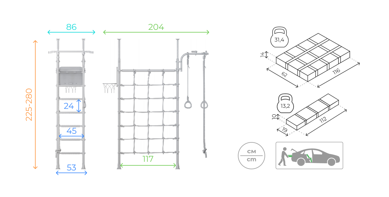 В комплексе ROMANA Р4 предусмотрено расширенное дополнительное оборудование: канат, кольца гимнастические, баскетбольный щит. Канатный лаз выполнен из шнура повышенной прочности и устанавливается между двумя широкими стойками. Вы можете добавить к этому комплексу ROMANA Доп20 качели для самых маленьких, и закрепить их на рукоходе, предварительно сняв канатный лаз и опустив рукоход на рекомендуемую высоту 1,2 м. С помощью детского спортивного комплекса ROMANA Р4 юные атлеты развивают координацию, ловкость и силу!