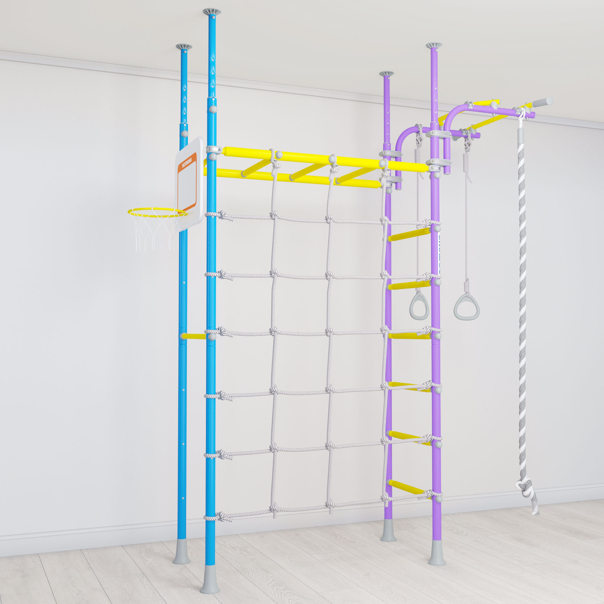 Детский спортивный комплекс ROMANA Р4 — многофункциональный комплекс для дома, где предусмотрено все для выполнения упражнений и увлекательных физкультурных занятий. Он устанавливается враспор к полу и потолку в любом подходящем месте дома или квартиры.Турник фиксируется на любой высоте надежными хомутами, их можно перемещать по вертикали на рамах комплекса. Рукоход также можно закрепить на удобной высоте,подходящей под вашего ребенка.