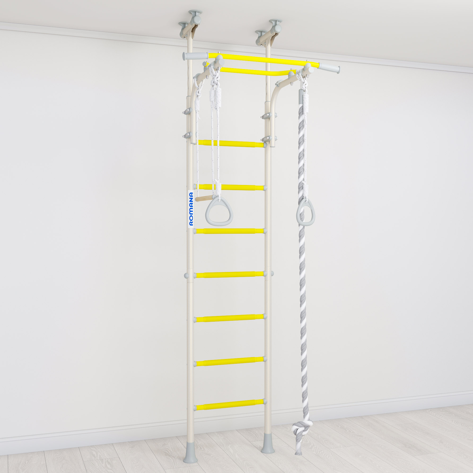 Детский спортивный комплекс ROMANA Р5 — современная шведская стенка с возможностью установки враспор к полу и потолку. Не нужно сверлить стену и крепить к ней раму. Металлокаркас стенки рассчитан на вес в 100 кг (испытан нагрузкой в 200 кг).