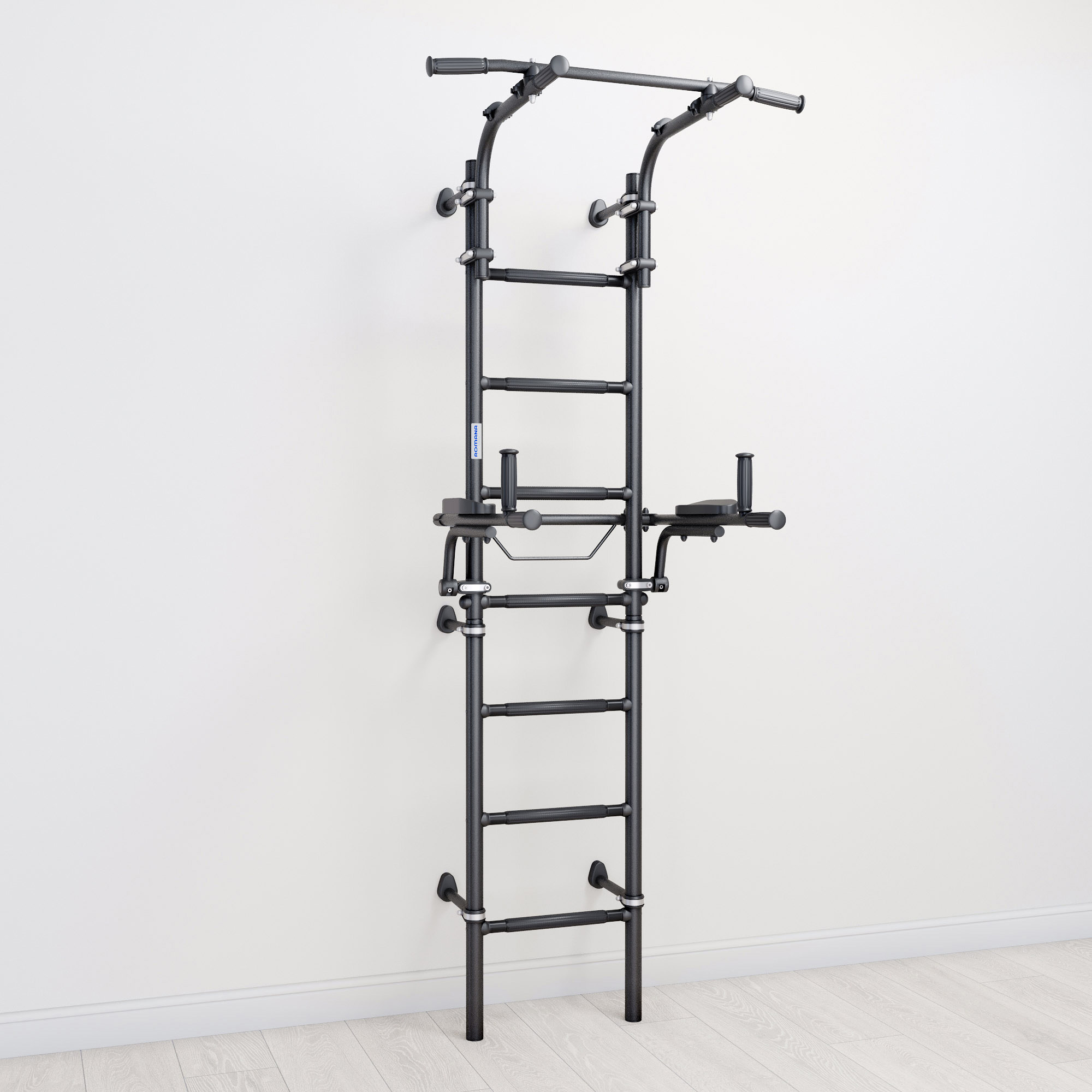ROMANA С10 — домашний спортивный комплекс для всей семьи, на нем могут заниматься и дети, и взрослые. Он достаточно компактен и не занимает много места: ширина ступеней составляет 410 мм, это самый оптимальный размер для занятий на брусьях, которые идут в комплекте. Брусья откидные, и после занятий их можно перевести в вертикальное положение. Турник можно передвигать по высоте, и закрепить как удобно пользователю с помощью надежных современных хомутов. Спортивный комплекс фиксируется к стене, фиксаторы можно передвигать по вертикали, чтобы избежать попадания в проводку или полости.